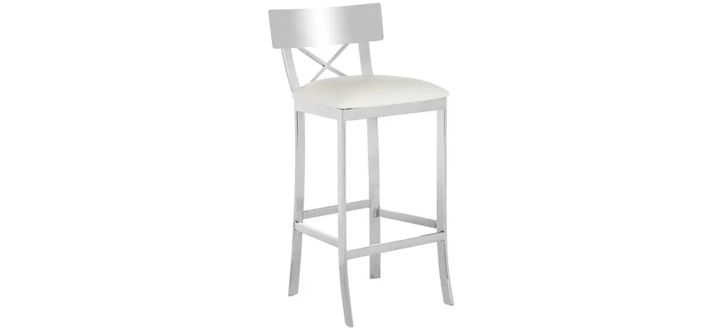 This modern Denis bar stool is at the height of fashion. Inspired by London's legendary art deco bar, its polished stainless steel finish is as smooth as Bond's martini. With cross back detail and smooth white leather style upholstery it's always in good taste.