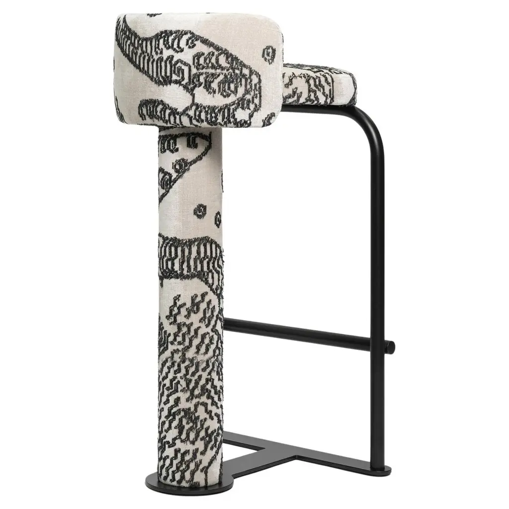 "Fox" Bar Stool by Dmytro Kozinenko – Minimalist Design with a Playful TwistThe "Fox" bar stool, designed by Dmytro Kozinenko, combines simplicity and creativity in a design inspired by nature. Its defining feature is a single cylindrical rear leg, subtly referencing the graceful tail of a fox. This unique element adds a touch of personality to its clean, minimalist silhouette.Constructed with a sturdy painted metal frame and robust plywood, the "Fox" stool is built to last. The seat is padded with high-density polyurethane foam and upholstered in a variety of fabrics, offering both comfort and customization to suit a wide range of interior styles.Available in bar and counter heights, the "Fox" stool is ideal for modern homes, stylish kitchens, and commercial spaces. Its sleek proportions and versatile design make it a functional yet visually engaging addition to any environment.