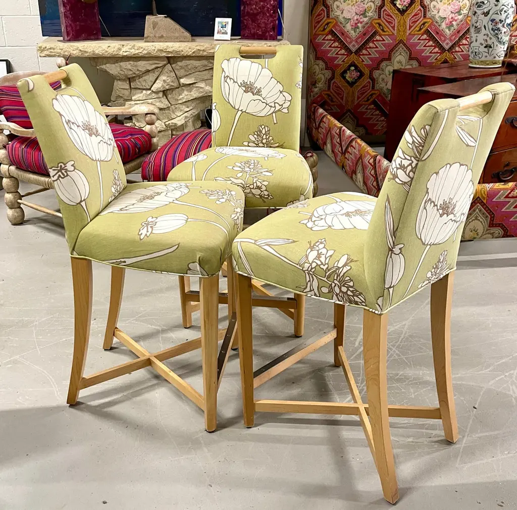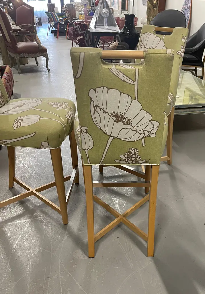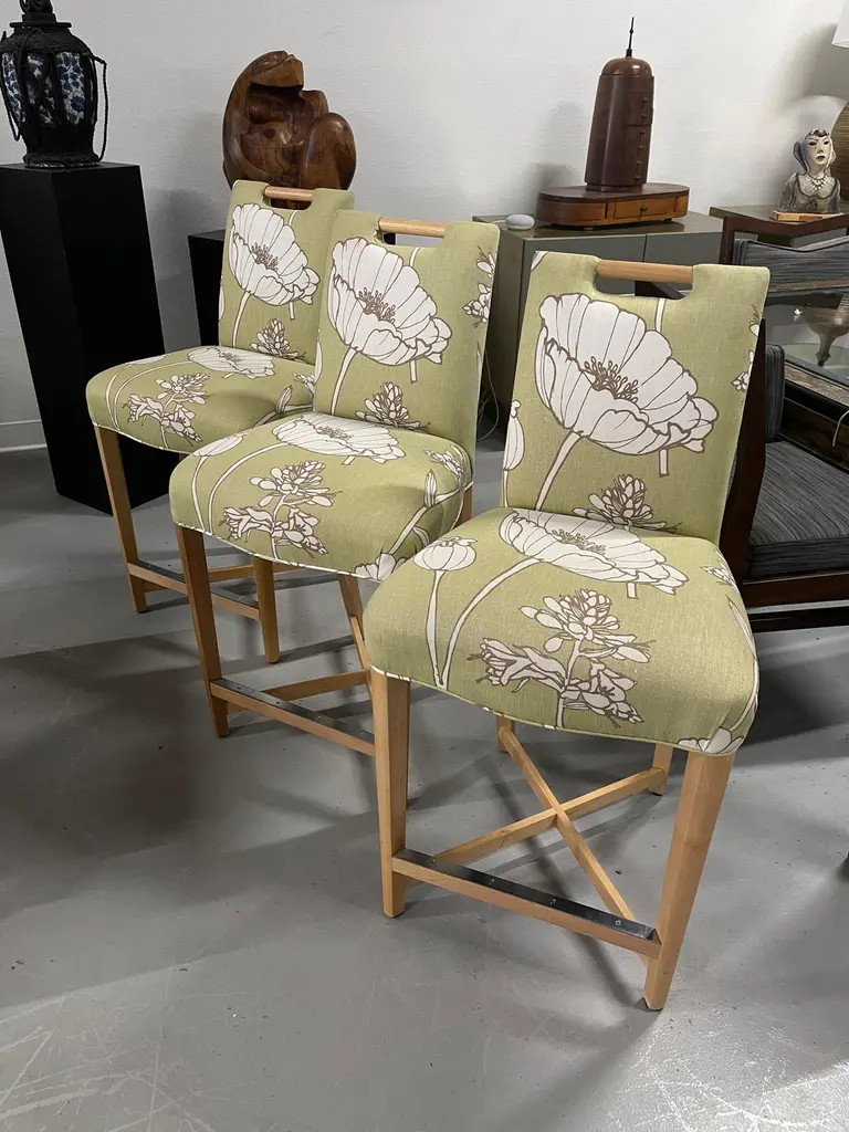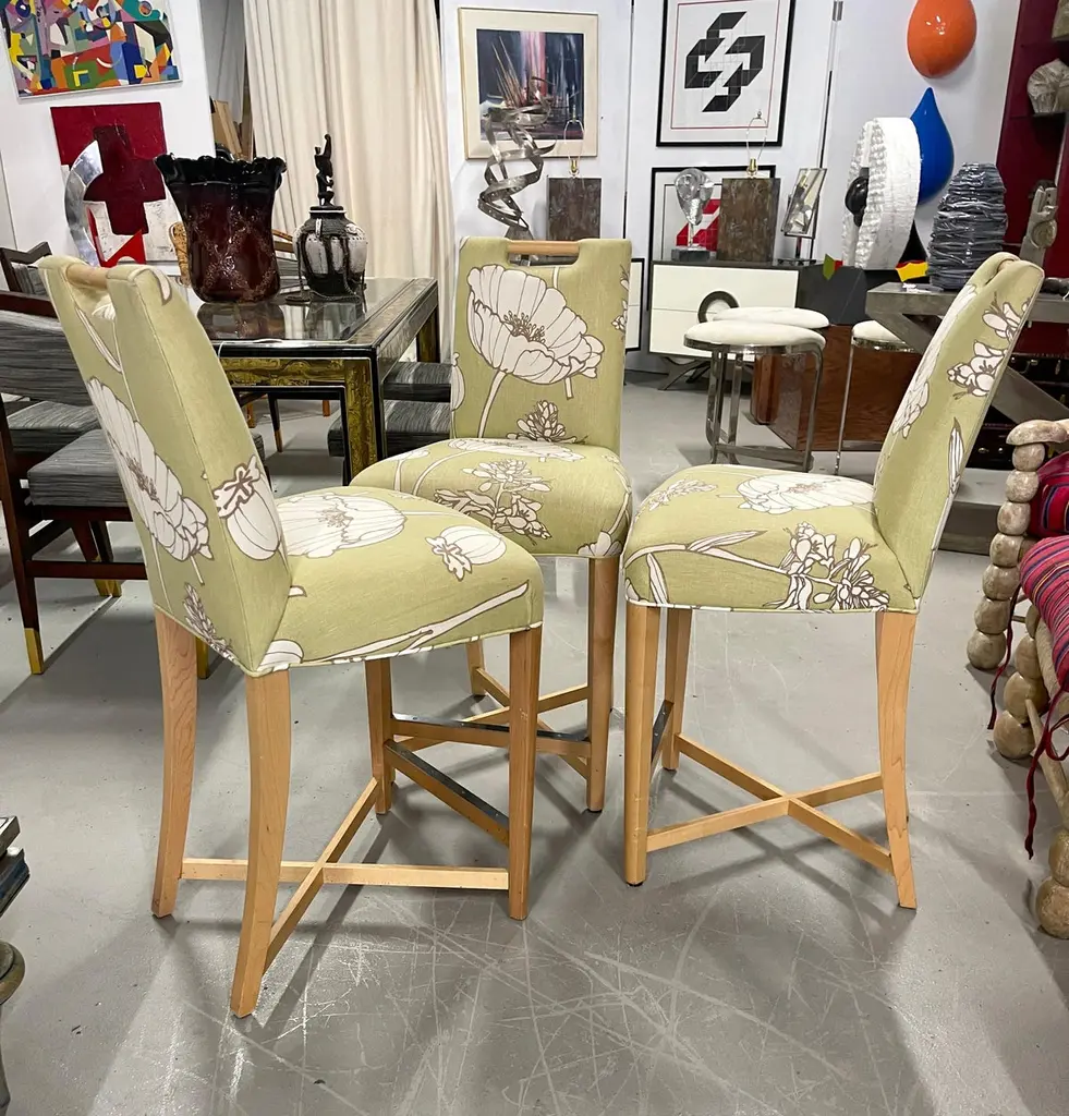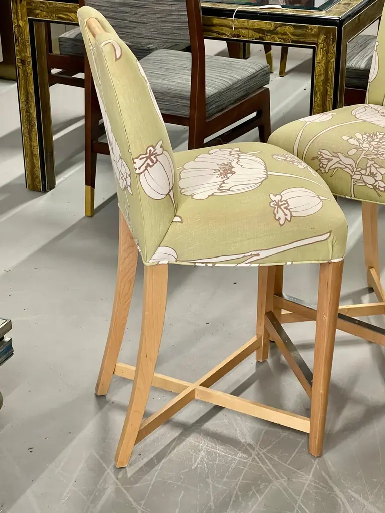 Set of three Donghia Barstools, with a pretty floral pattern. I believe the hardwood frame to be Maple. The stools have a metal reinforced piece on the foot rest. They are in good vintage condition, although there is some slight fraying at the top corners, pictured, and some minor marks to the wood. There are natural imperfections to the linen or silk blend fabric.
