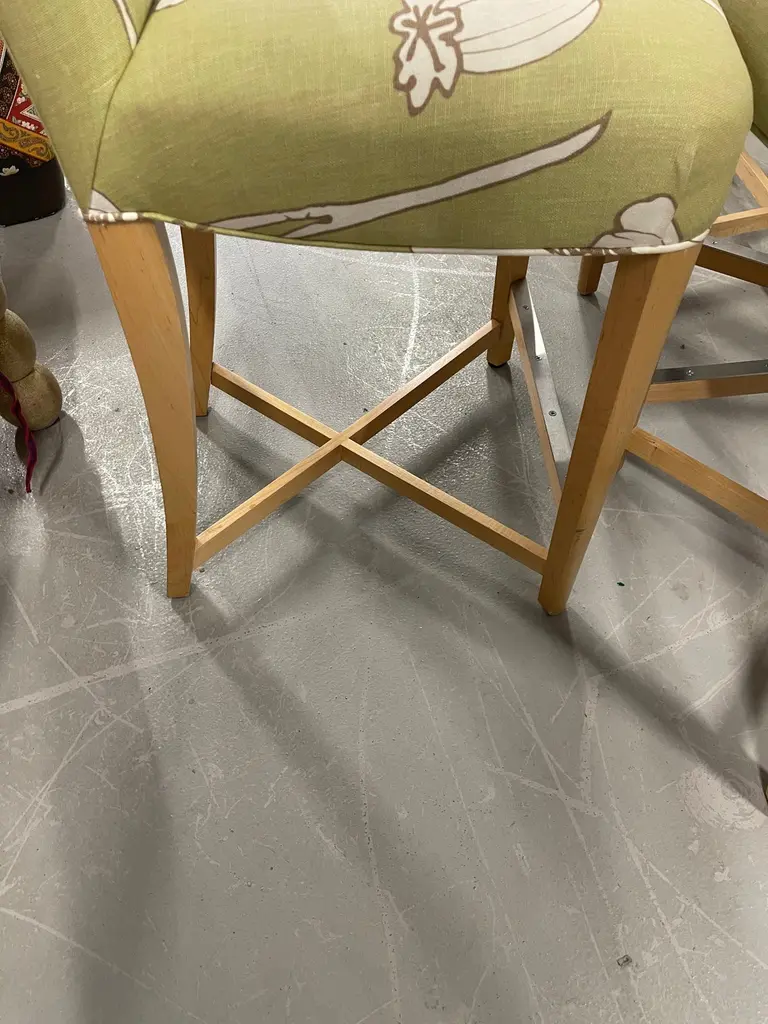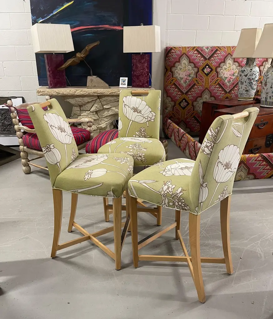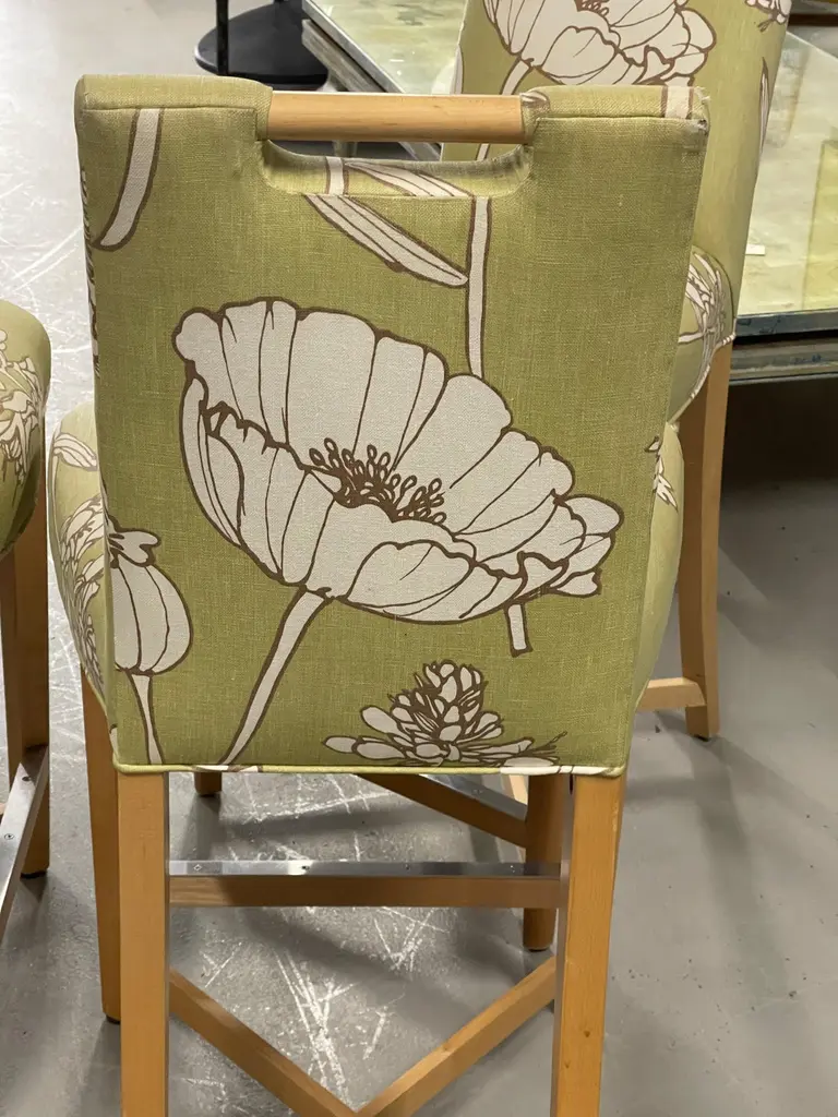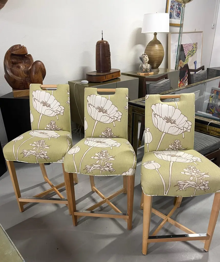 Set of three Donghia Barstools, with a pretty floral pattern. I believe the hardwood frame to be Maple. The stools have a metal reinforced piece on the foot rest. They are in good vintage condition, although there is some slight fraying at the top corners, pictured, and some minor marks to the wood. There are natural imperfections to the linen or silk blend fabric.