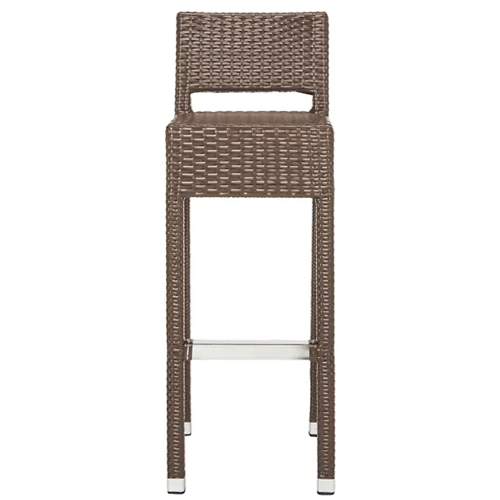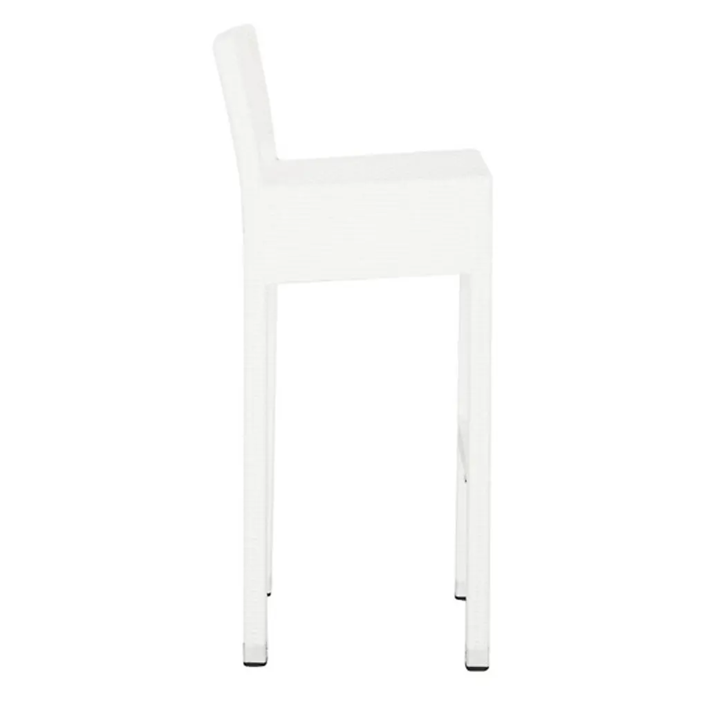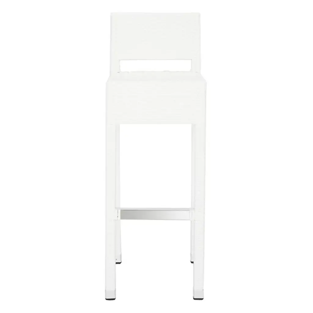 The Dorland Indoor/Outdoor Bar Stool from Alder & Ore adds a stylish coastal vibe to any setting. A tall, blocky design with a low back, it’s perfect for enjoying drinks or casual dining and features a durable polyethylene wicker rattan seat complemented by a sturdy aluminum frame. Bright metal collar accents around each leg and the footbar provide a touch of sophistication, blending function with flair. Tough enough for outdoor use, it’s a chic addition to coastal and contemporary decor.