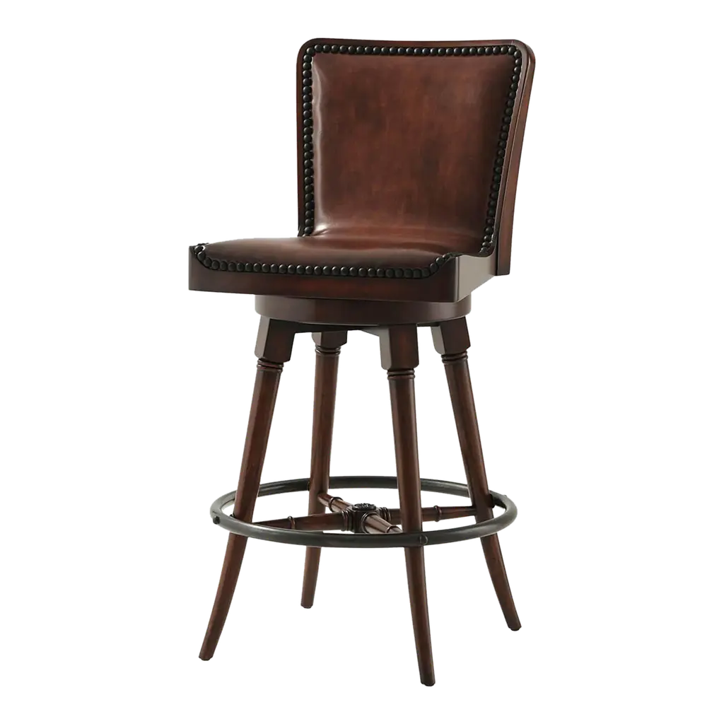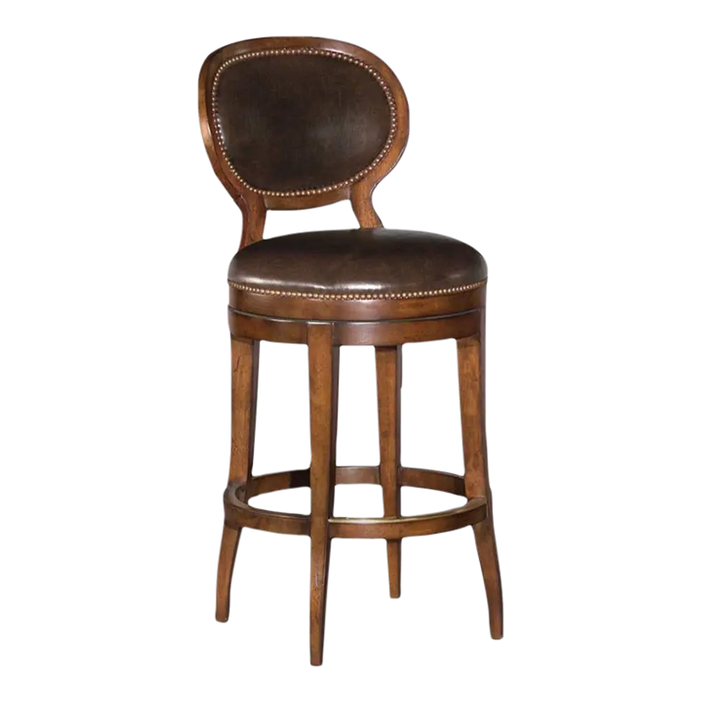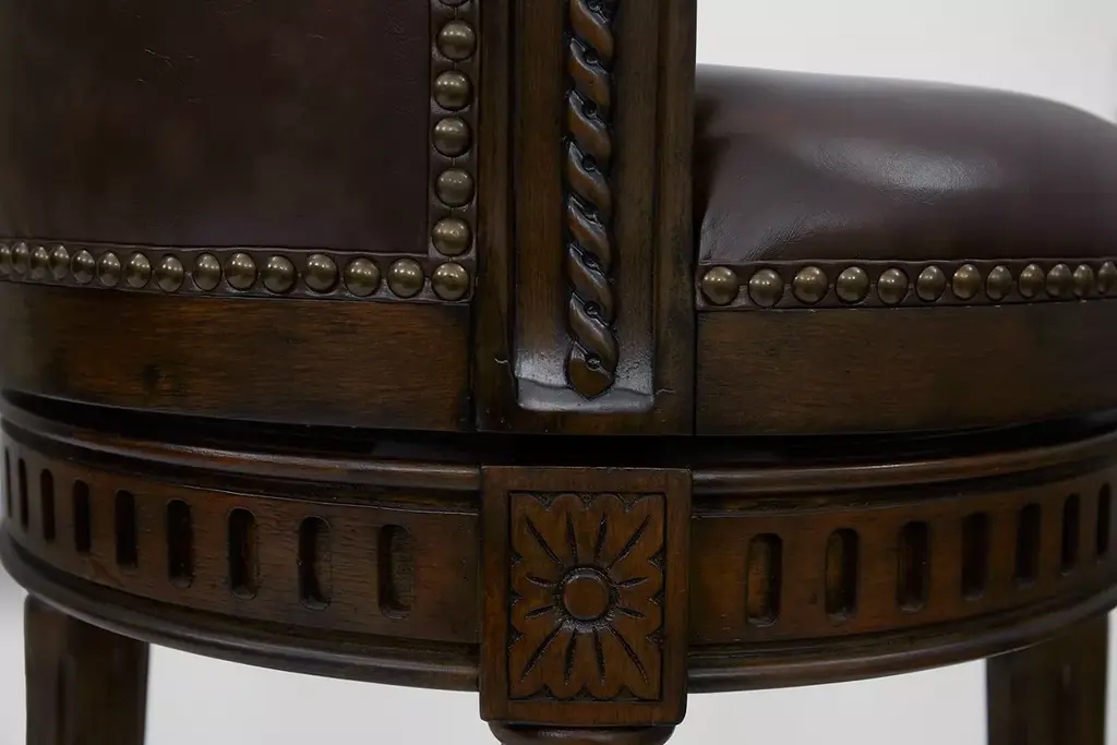 Recreate the experience of a lavish evening out with our Draper barstool. Your choice of a distressed walnut or allegro grey finish will complement plush upholstery, luxurious nailhead trim and medallion inlays for elegance paired with casual comfort.
