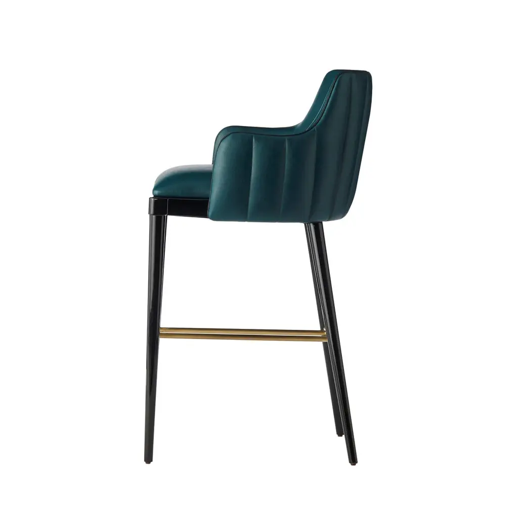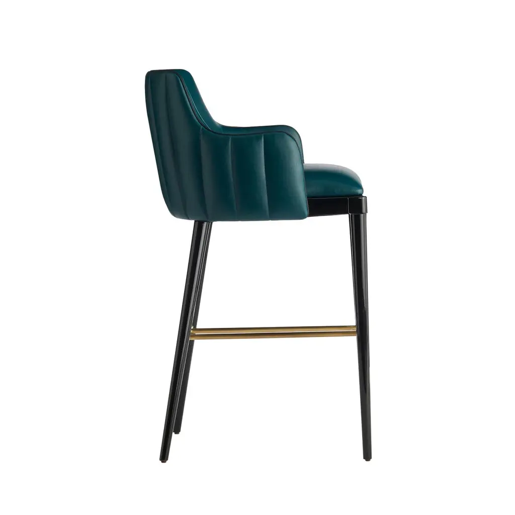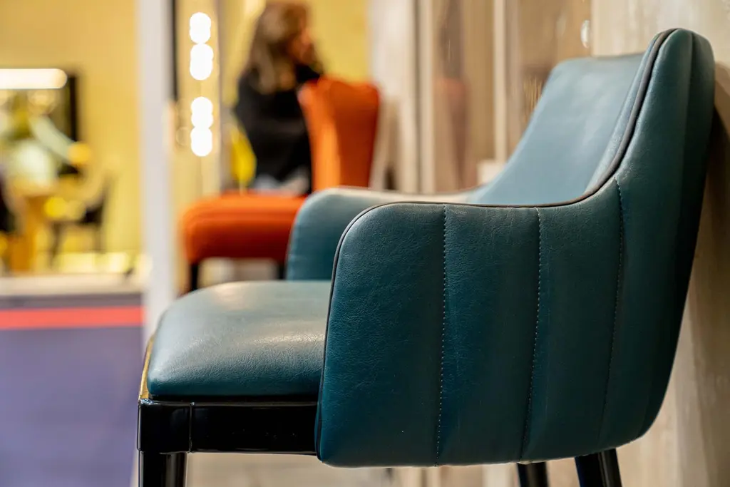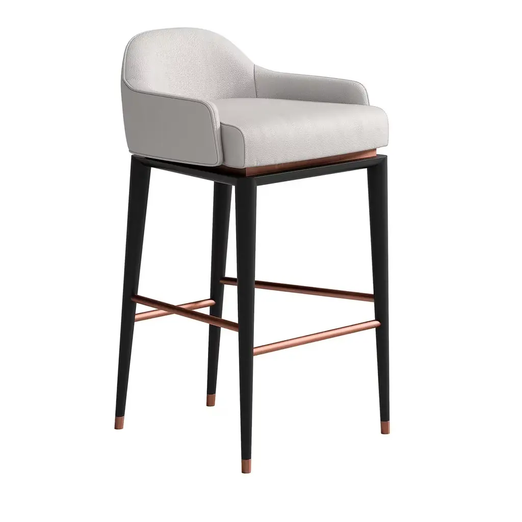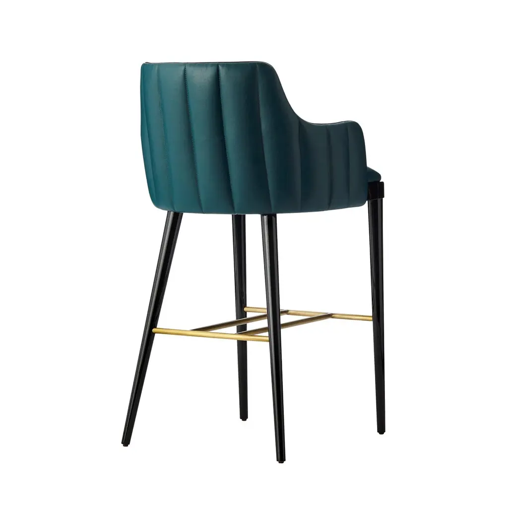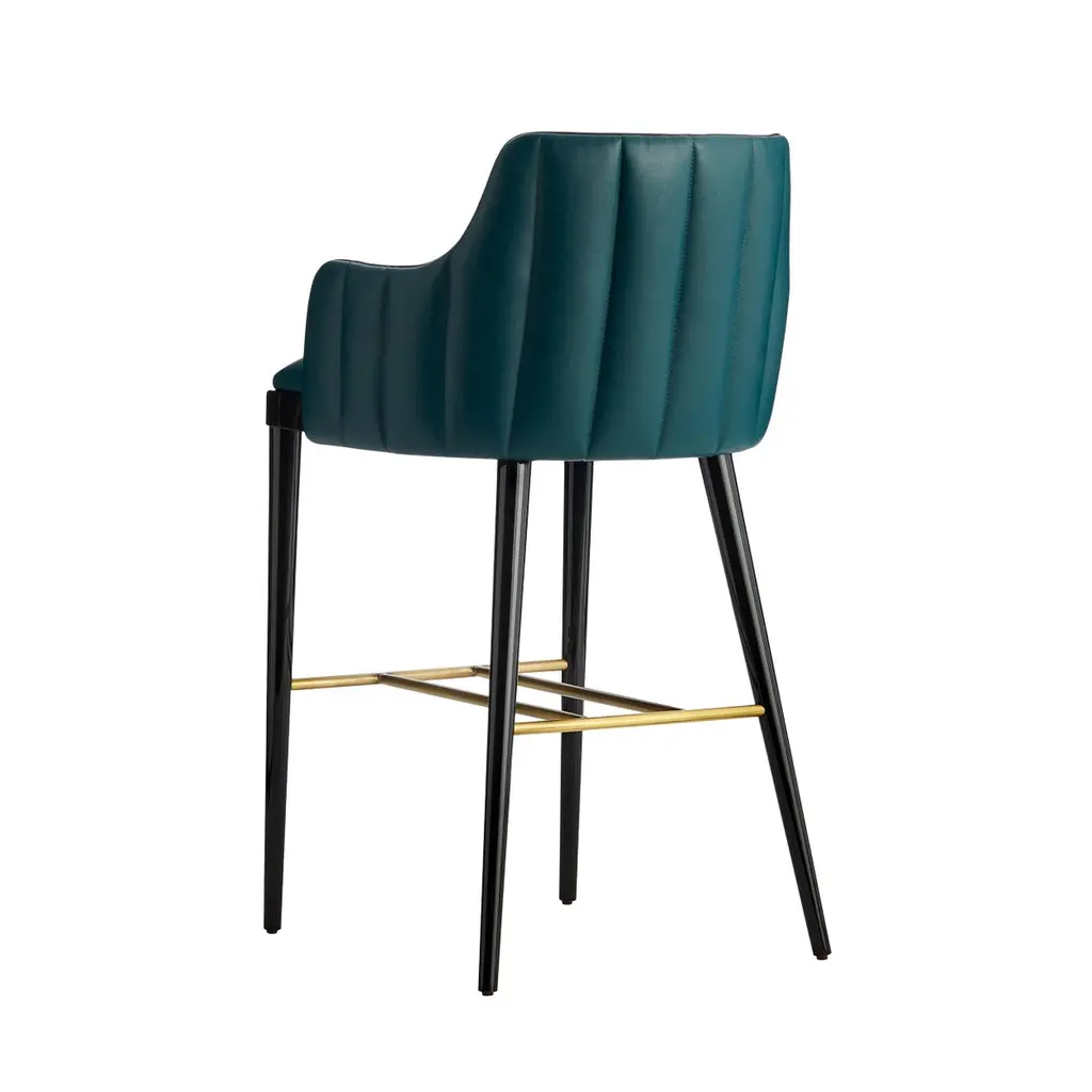 The DUMAS bar stool is a must for any living room. Characterized by an elegant quilting, while the legs are lacquered and enriched with brass rest feet. Dumas is available in fabric, natural leather, eco-leather or COM and is possible to customize the color of the legs.Shown upholstered with eco-leather Aston 203 (structure) and Aston 900 (piping) (Fabrics Cat. B), with glossy black legs and Antique Brass rest feet.