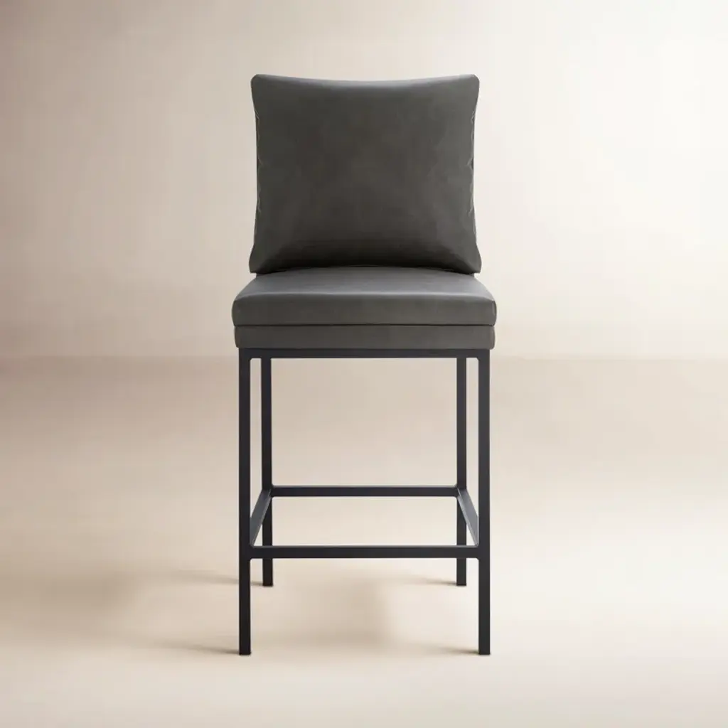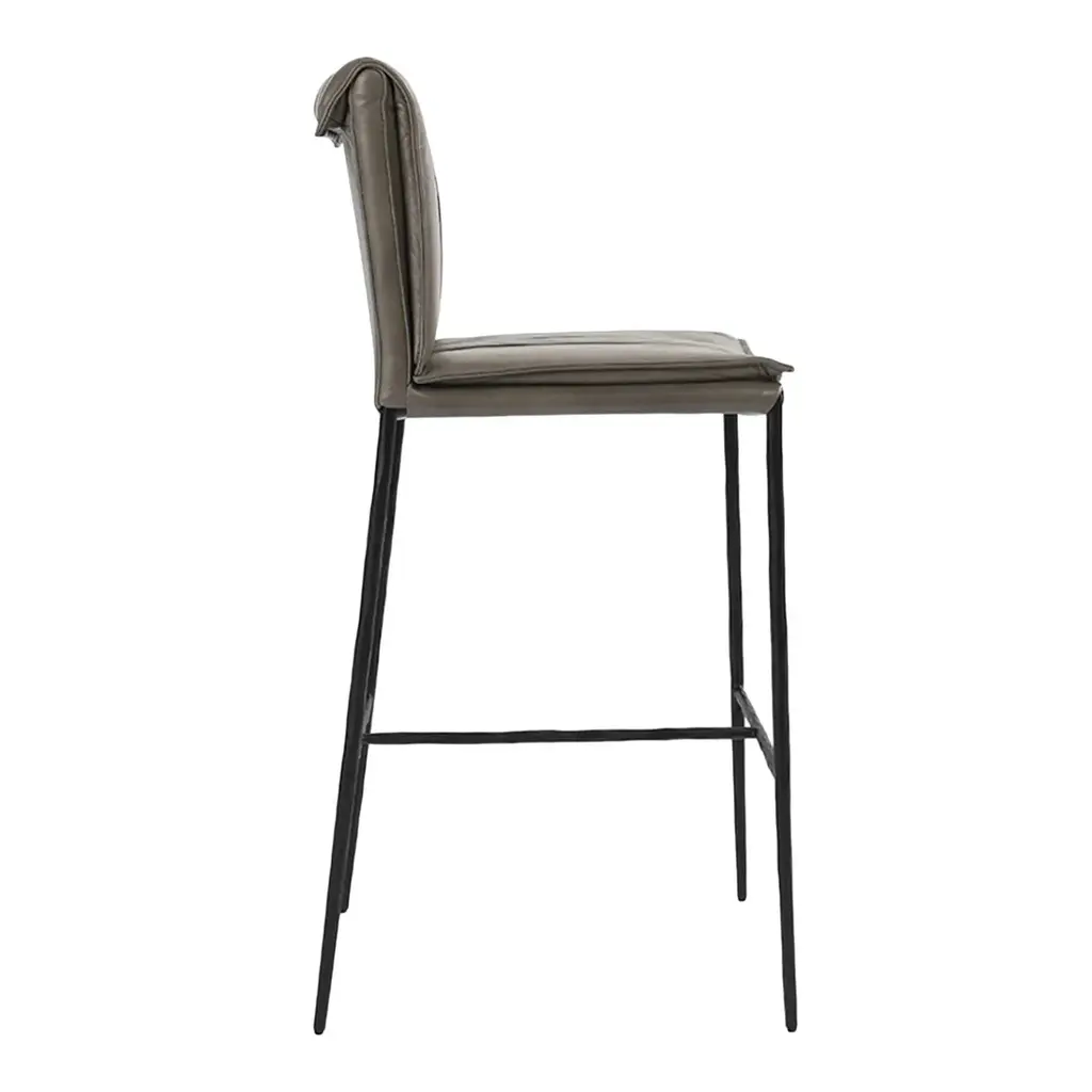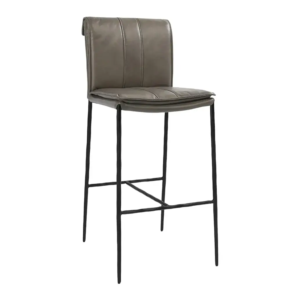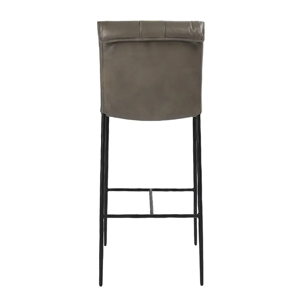 Beautiful top grain grey leather bar stool. Solid and sturdy black iron frame and legs with double seat cushion and roll back design with comfort and style. Seat height is 30". This stool weighs approx. 30 lbs.