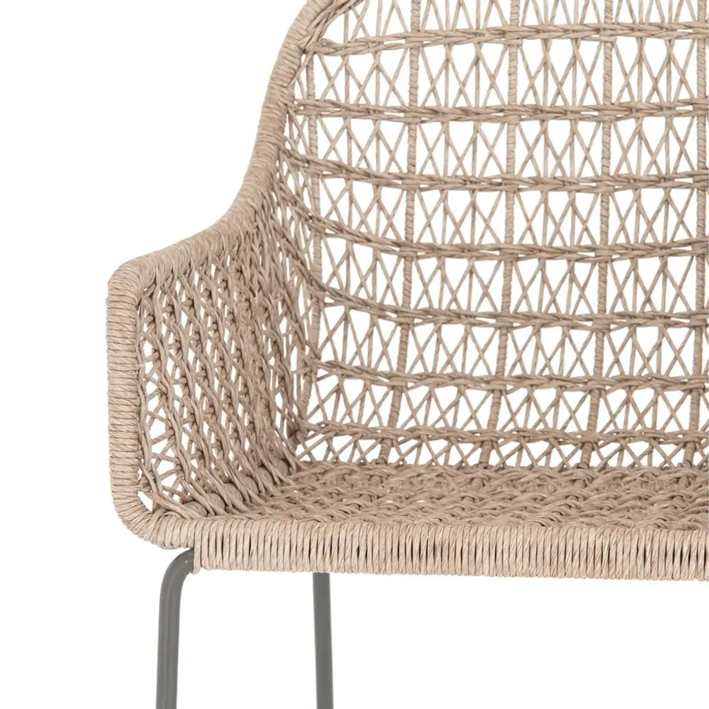 Whether styled indoors or out, the Elena bar stool highlights the best of modern coastal design. Finished in vintage white, the all-weather wicker weave seat features a gently sloped back. Its durable iron base is finished in grey bronze.