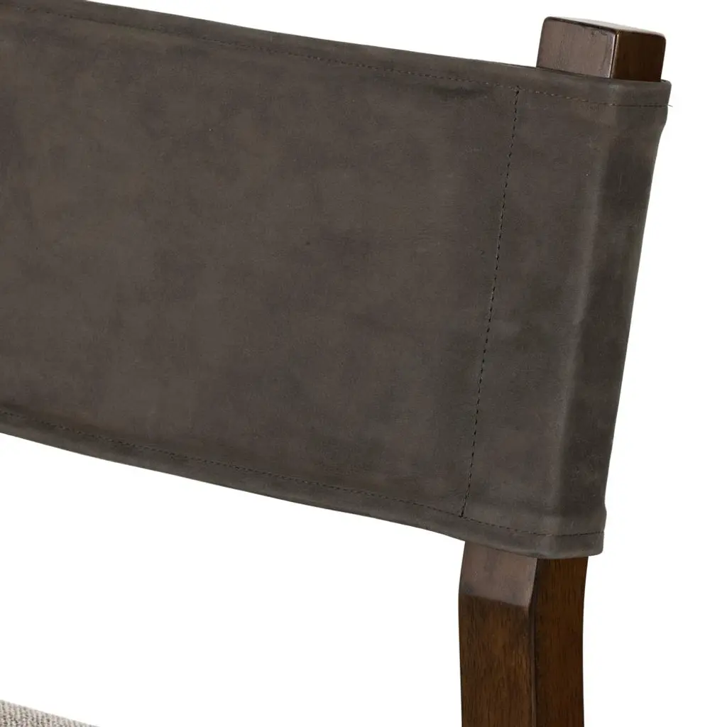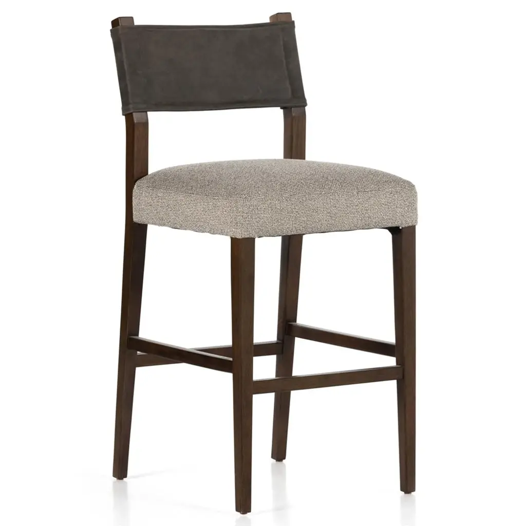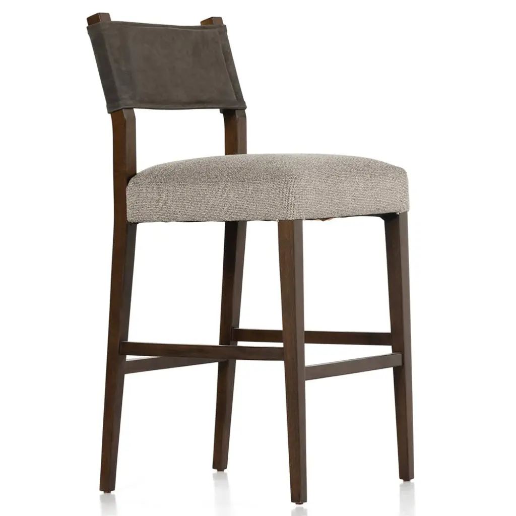 Bring a rustic lodge aesthetic to your home with the Ely bar stool. An antique sable-finished parawood frame and charcoal top-grain leather backing highlight the warmth of mixed natural materials. The seat is upholstered in performance ink grey fabric, a durable textile designed to withstand spills and stains with ease.