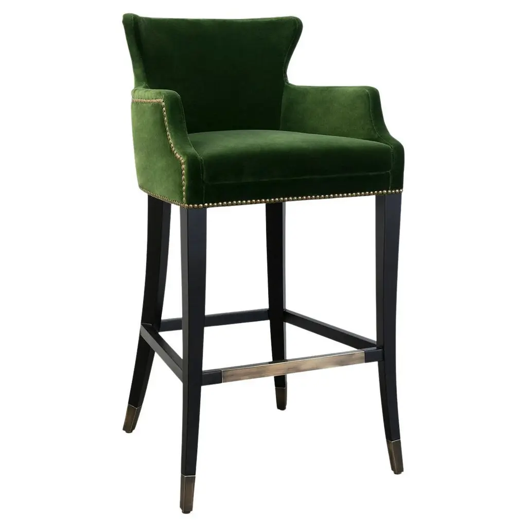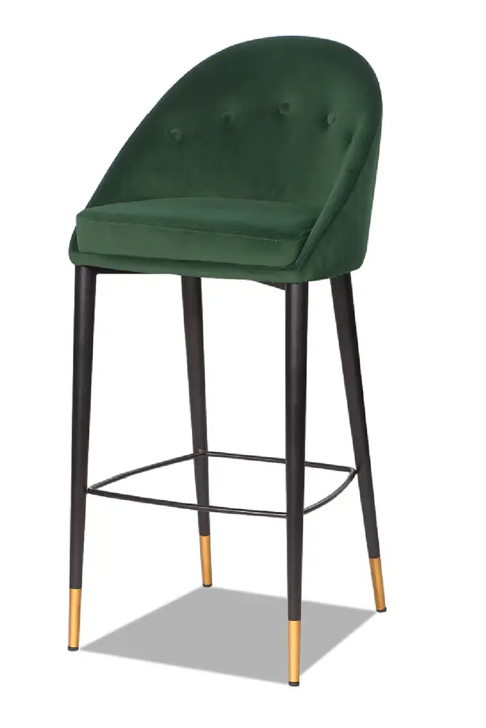 Upholstered in Gainsborough Emerald Green velvet, the Arden stool adds a classic style to any home interior and exudes luxury from all angles. With its delicate stitching and button seat back, the bar stool is finished with black legs and brass finish tipped feet to provide an elegant look.