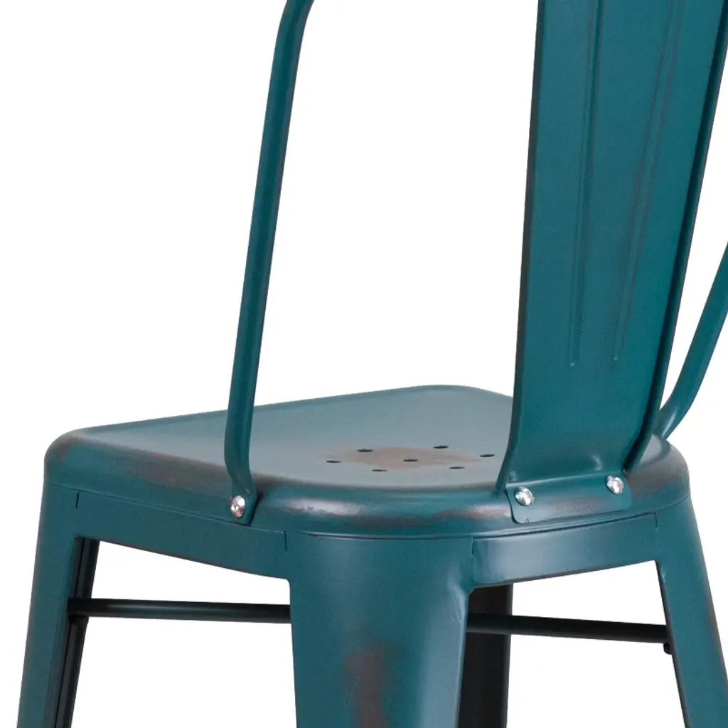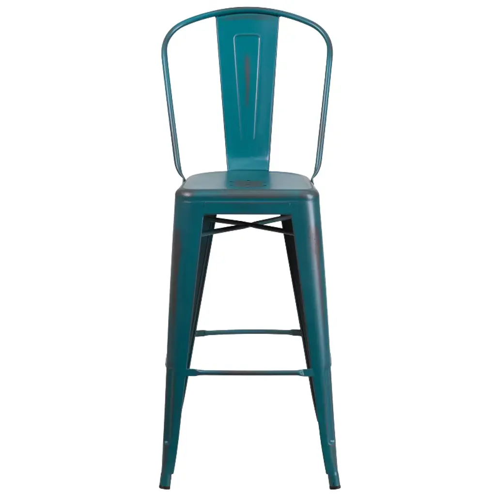 Create an eclectic look around your pub height dining room table or a set up a cozy space in your kitchen to enjoy a cup of joe and light breakfast with this distressed dining stool. You'll be pleasantly surprised how well these distressed metal bar stools blend in with your existing furnishings. Durably constructed, this bar height stool will instantly modernize your restaurant, cafe, or bar by adding splashes of color. Metal barstools with backs provide a comfortable sitting experience, the full back is ergonomically curved and includes a vertical slat. The lower support braces double as a footrest, promoting proper posture. Drain holes prevent pooling in the center of the seat for a faster turn around to seat customers. For longevity, care should be taken to protect from long periods of wet weather. Whether it's time to update your employee breakroom with some colorful furniture or add some durable seating to your patio furniture collection, this timeless indoor outdoor bar stool delivers.