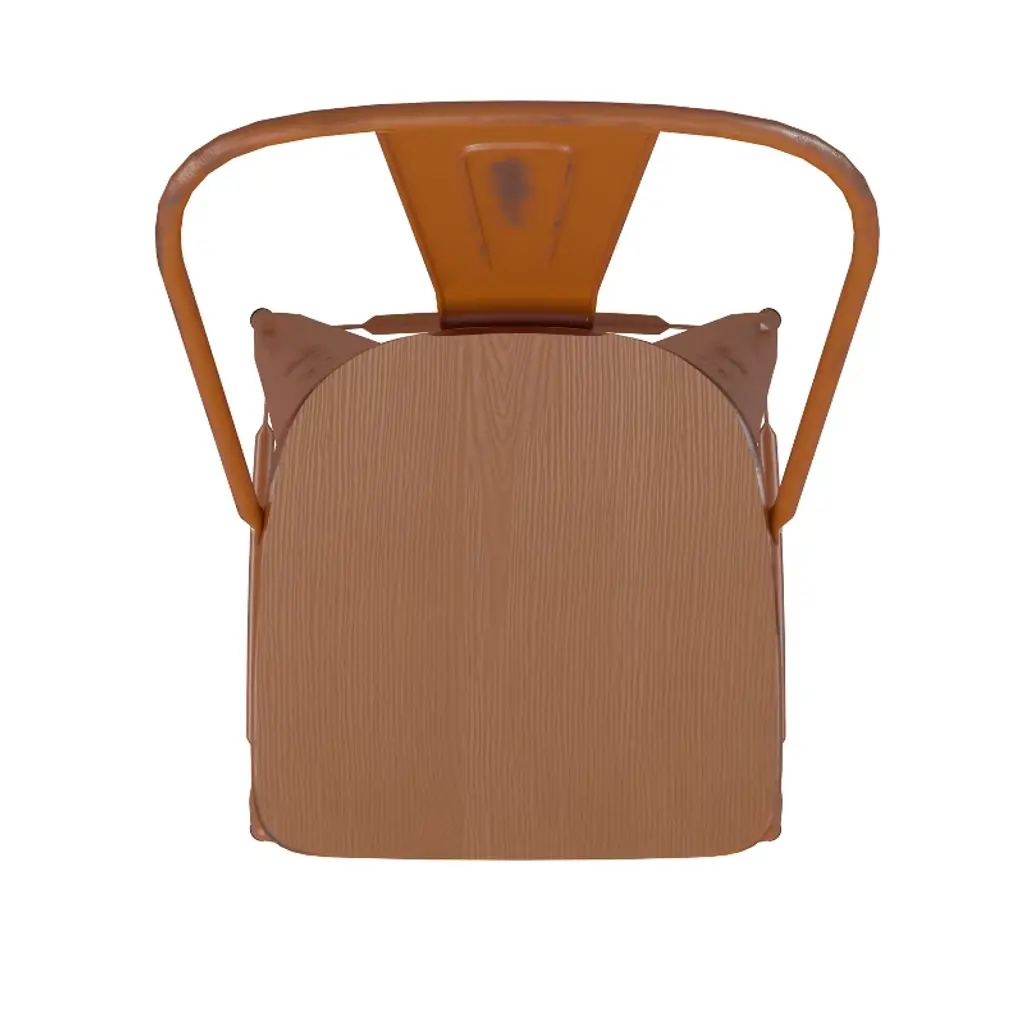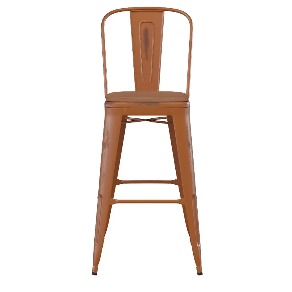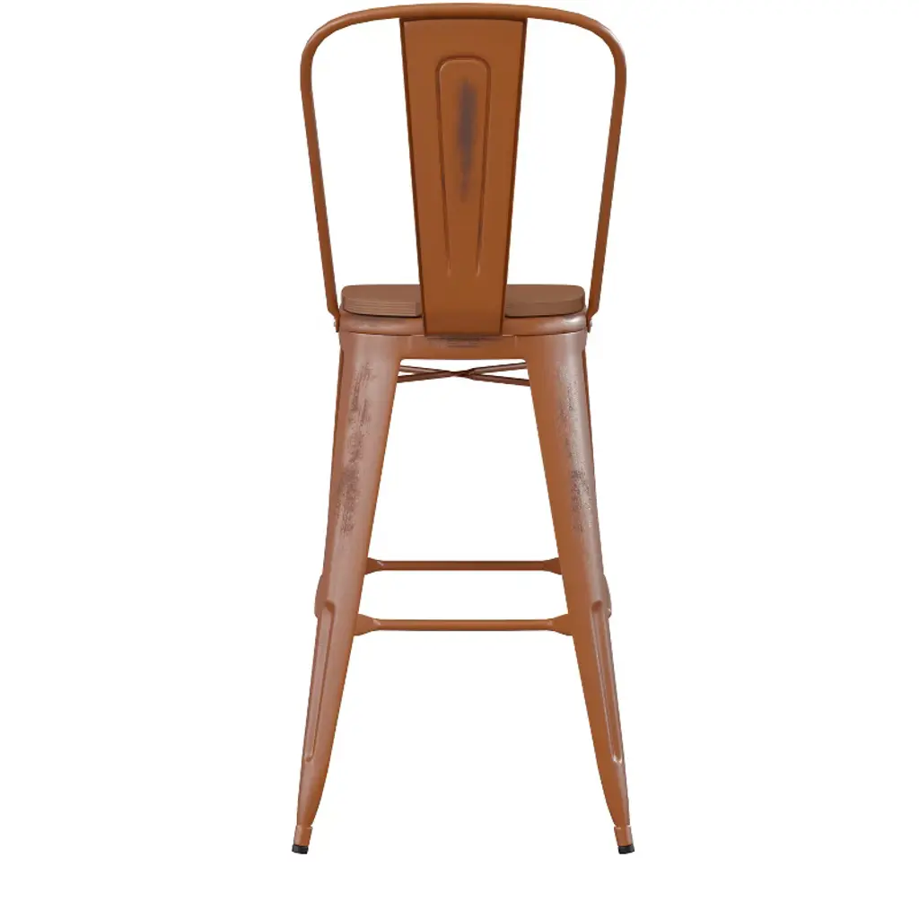 Emma And Oliver Distressed Orange Metal 30" High Bar Height Stools With Backs And Teak Polystyrene Seats For Indoor/outdoor Use