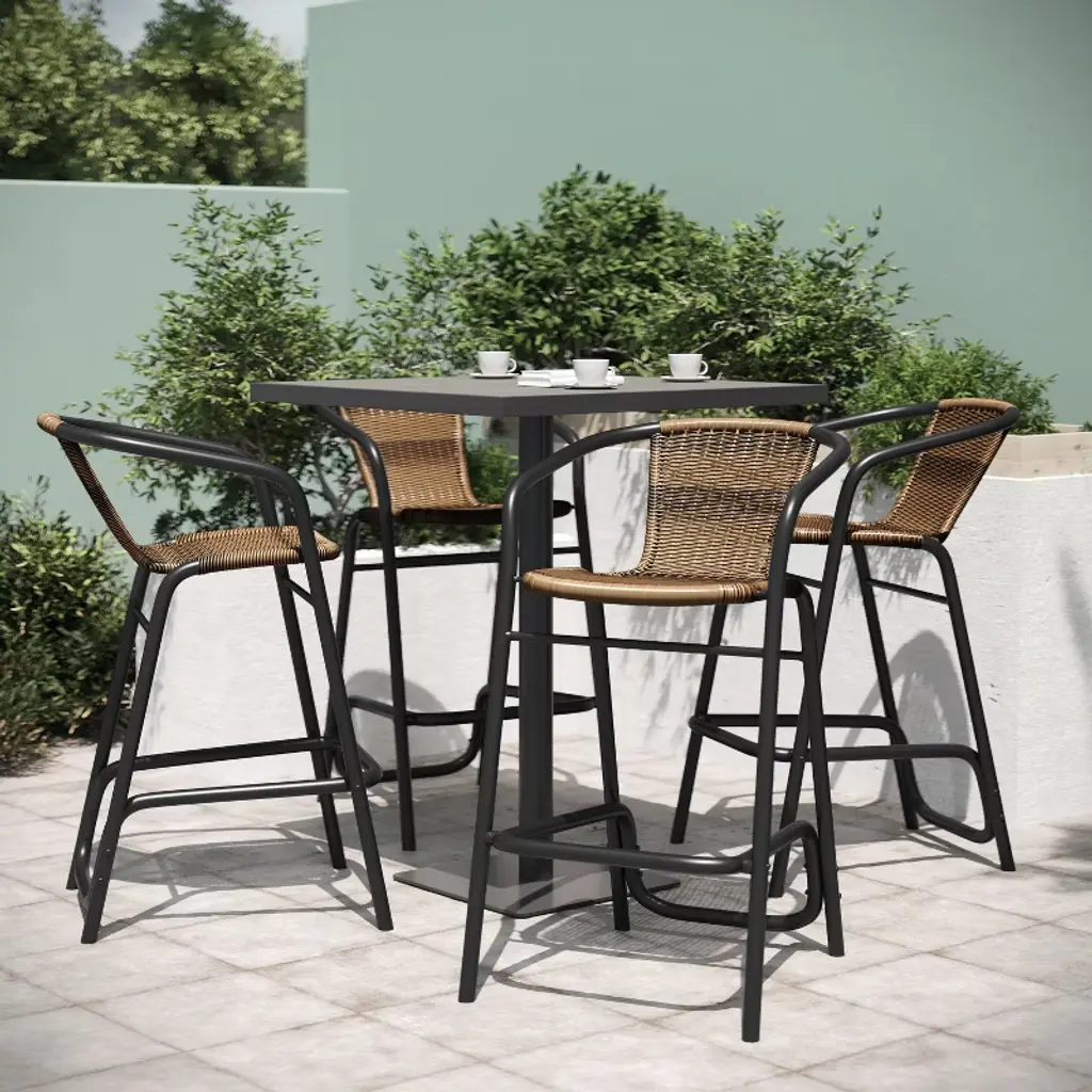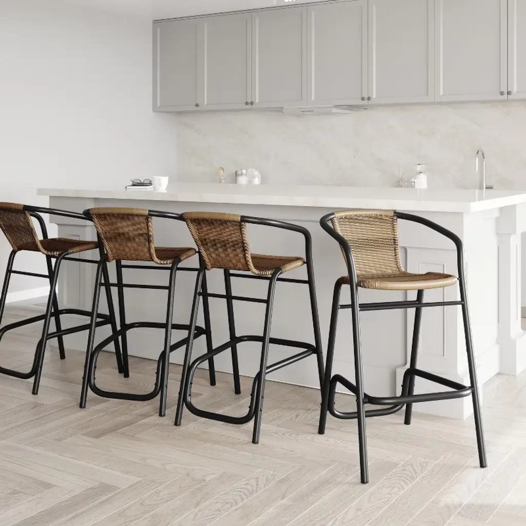 Deliver a casual, comfortable environment to your restaurant, bistro, hotel, or backyard patio with this set of four indoor/outdoor commercial grade restaurant barstools. The durable PE rattan backs and seats are incredibly comfortable for any occasion. Available in three hues, these barstools are the perfect additions to your indoor and outdoor spaces, no matter the style. The lightweight, but durable, powder coated aluminum frames hold up to 400 lbs. static weight for strong, sturdy seating options. A foot rest gives your guests another way to stay comfortable and content. For your convenience, the seats and backrests arrive completely assembled and adding the footrest is quick and easy. These barstools can be cleaned easily with a water-based cleaner.