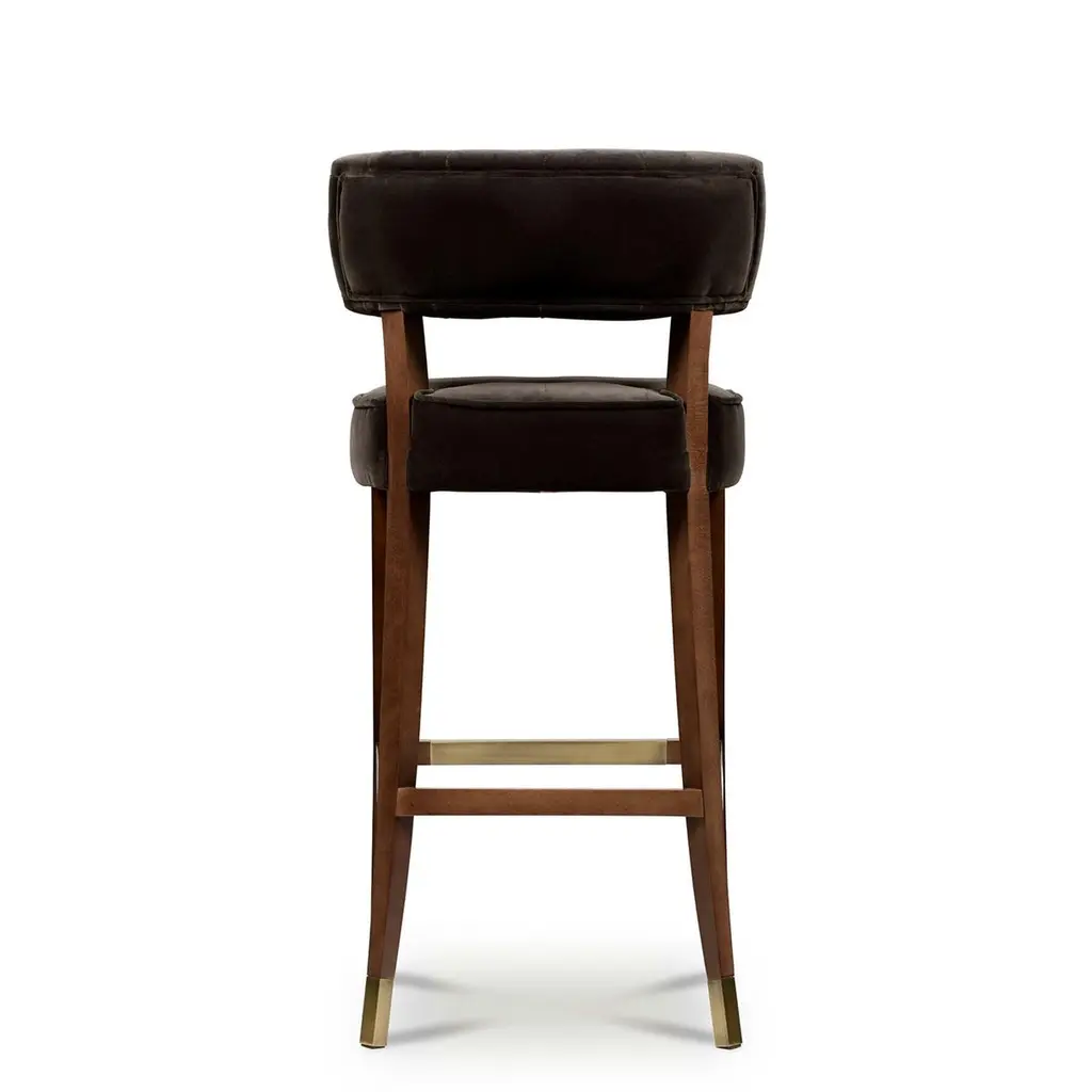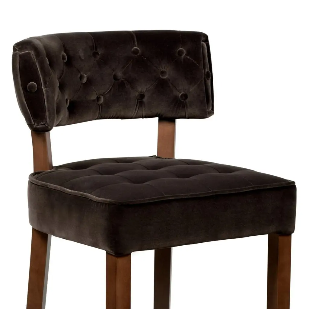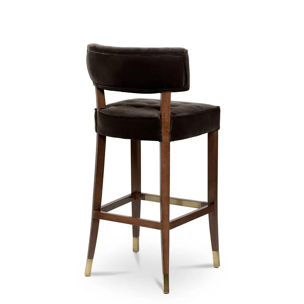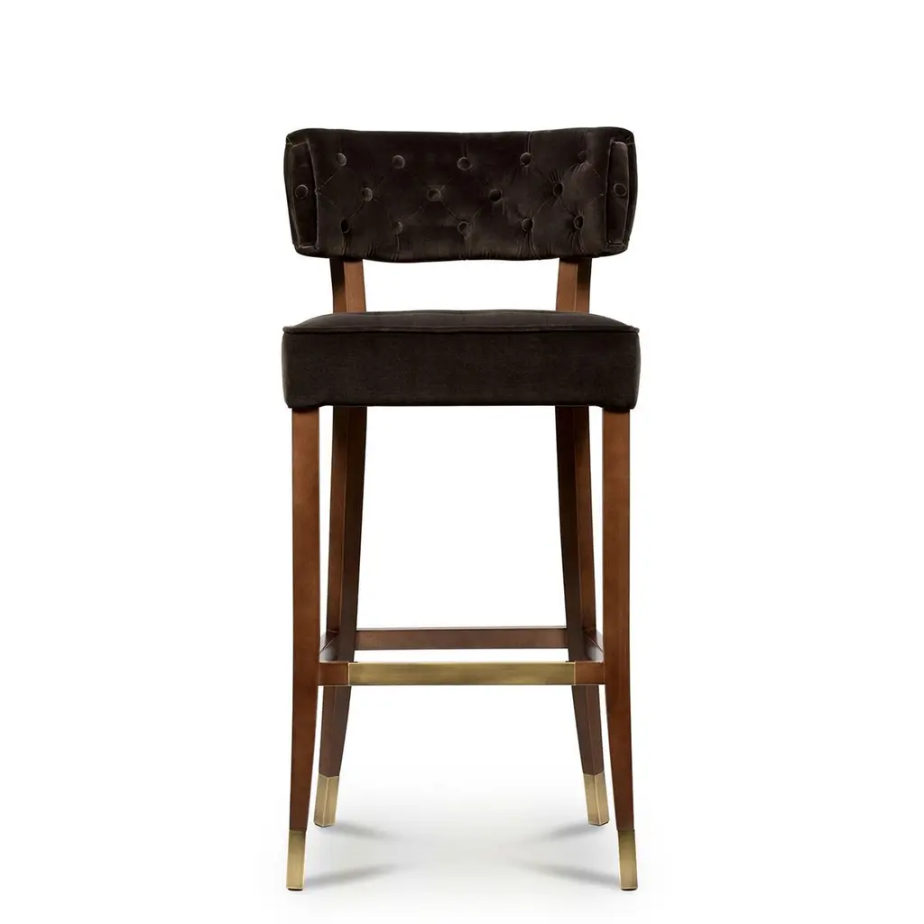 Bar stool Erny with solid walnut wood structure,upholstered and covered with Grade A velvet fabric.With capitonated seat and backrest. With reinforcedfootrest and feet in solid brass in brushed finish.Also available with other fabric colors finishes in Grade A, on request.