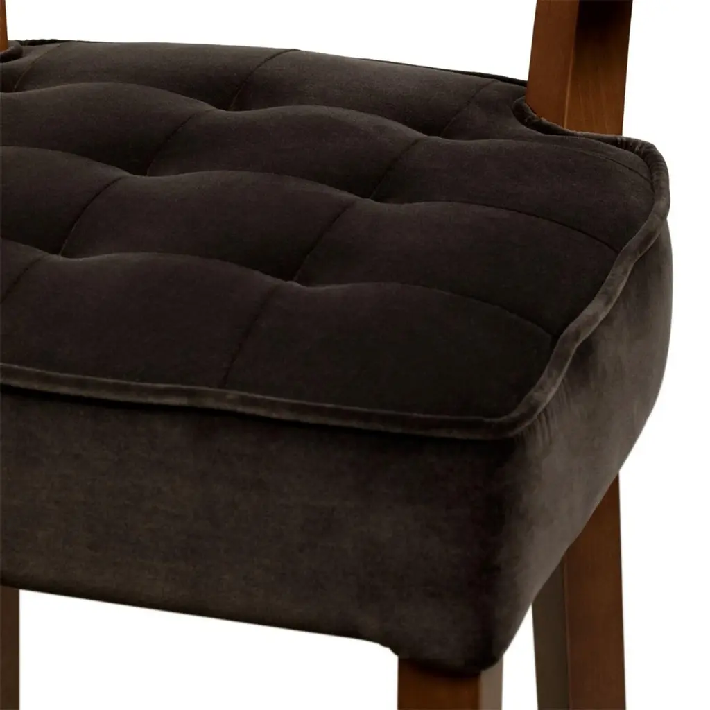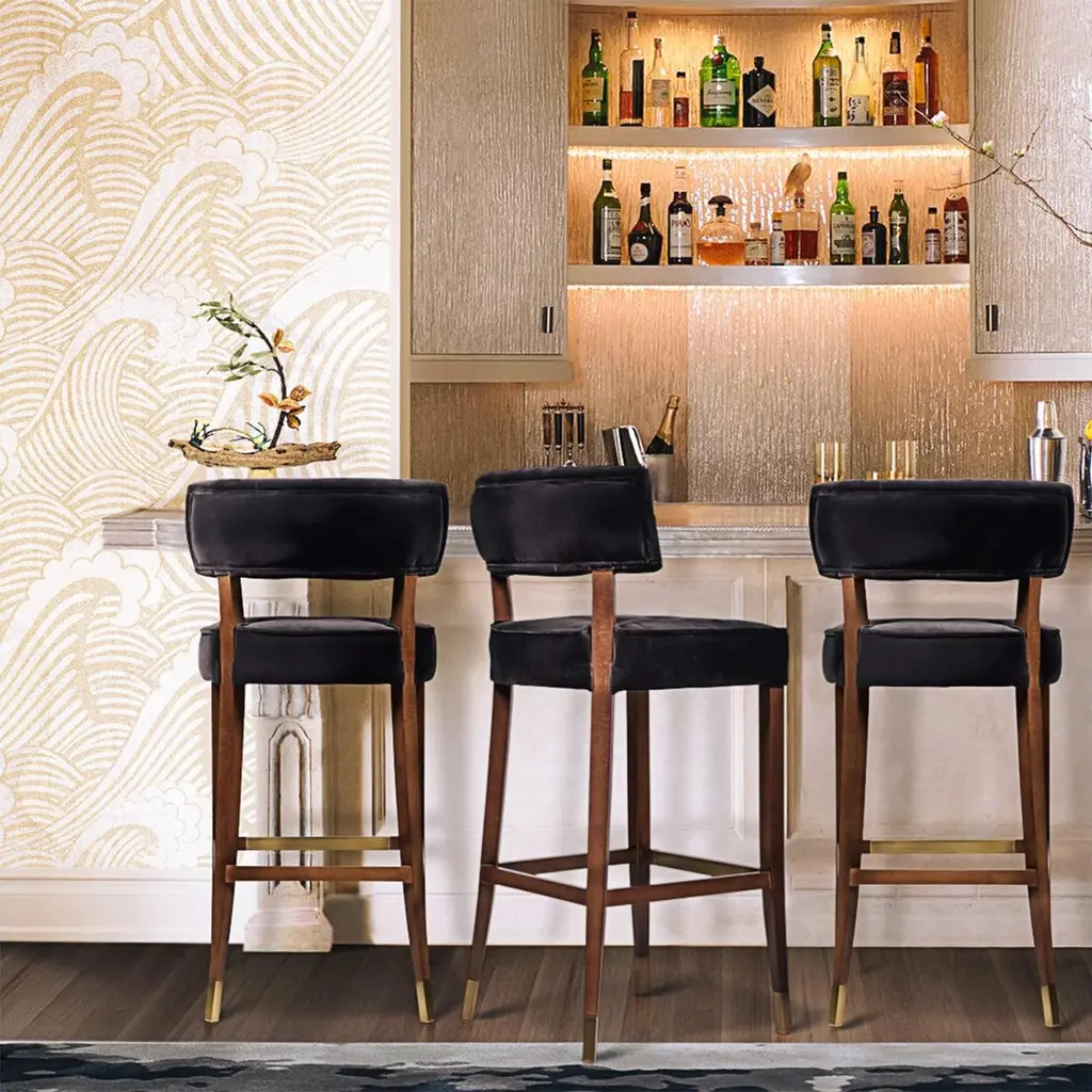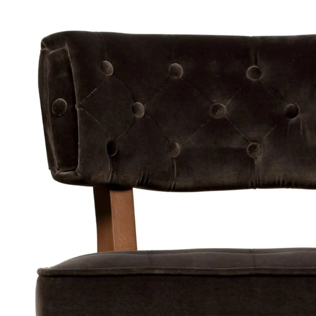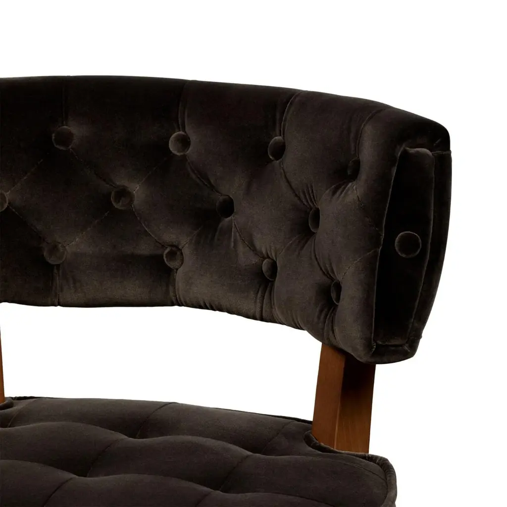 Bar stool Erny with solid walnut wood structure,upholstered and covered with Grade A velvet fabric.With capitonated seat and backrest. With reinforcedfootrest and feet in solid brass in brushed finish.Also available with other fabric colors finishes in Grade A, on request.