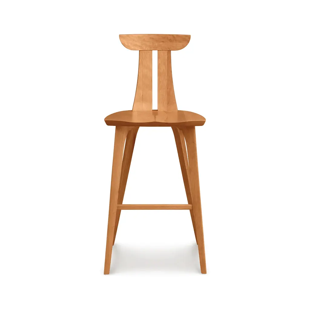 Copeland's high end Estelle Bar Stool features the essence of mid-century modern, minimalist design. Sculpted in solid American hardwood, this unique bar stool has a slender, vertically split back and finely sculpted seat for the ultimate in comfort. Rounded, angular tapered legs complete the stunning contemporary design.Base price represents natural cherryShown in natural cherryMatching furniture available in our Audrey Furniture Collection, Catalina Furniture Collection and Exeter Furniture CollectionNatural variations in solid wood and hand applied finishes make each piece unique. Slight grain and finish irregularities tell you that the furniture has been crafted from solid wood and are considered hallmarks of quality.