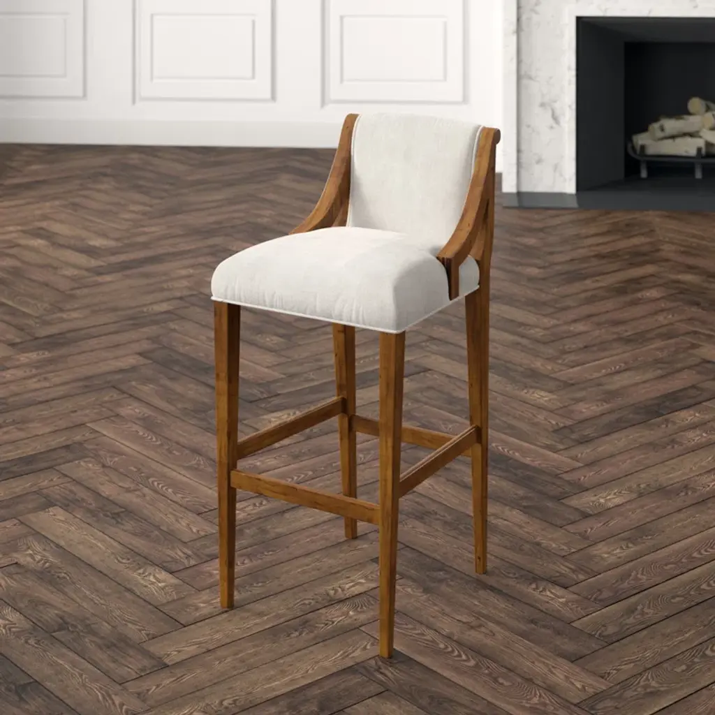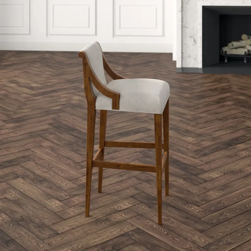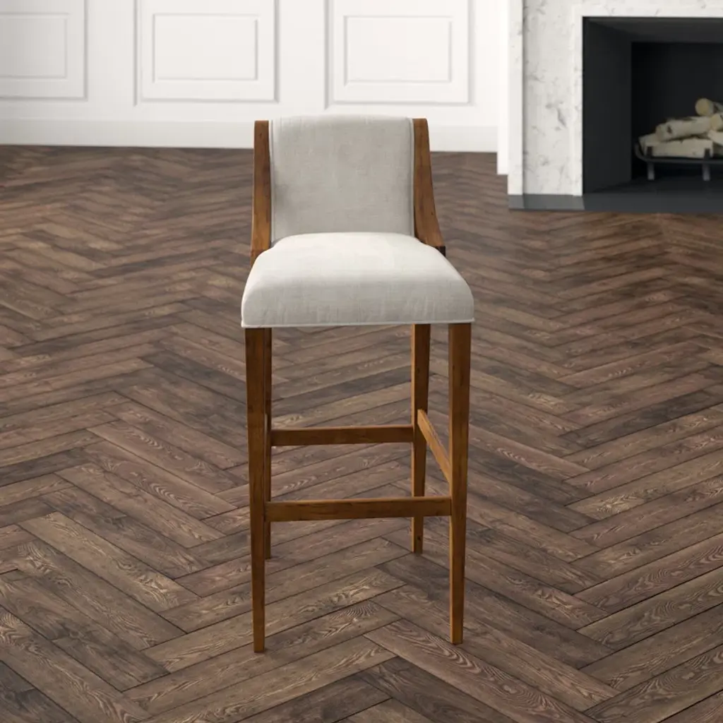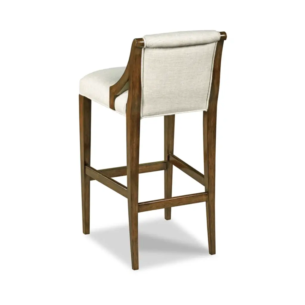 A fully upholstered back is situated with an upholstered seat with welt trim that is elevated over four squared tapering corner posts.