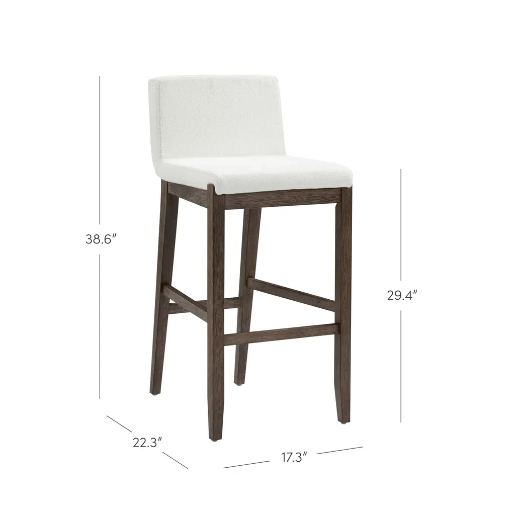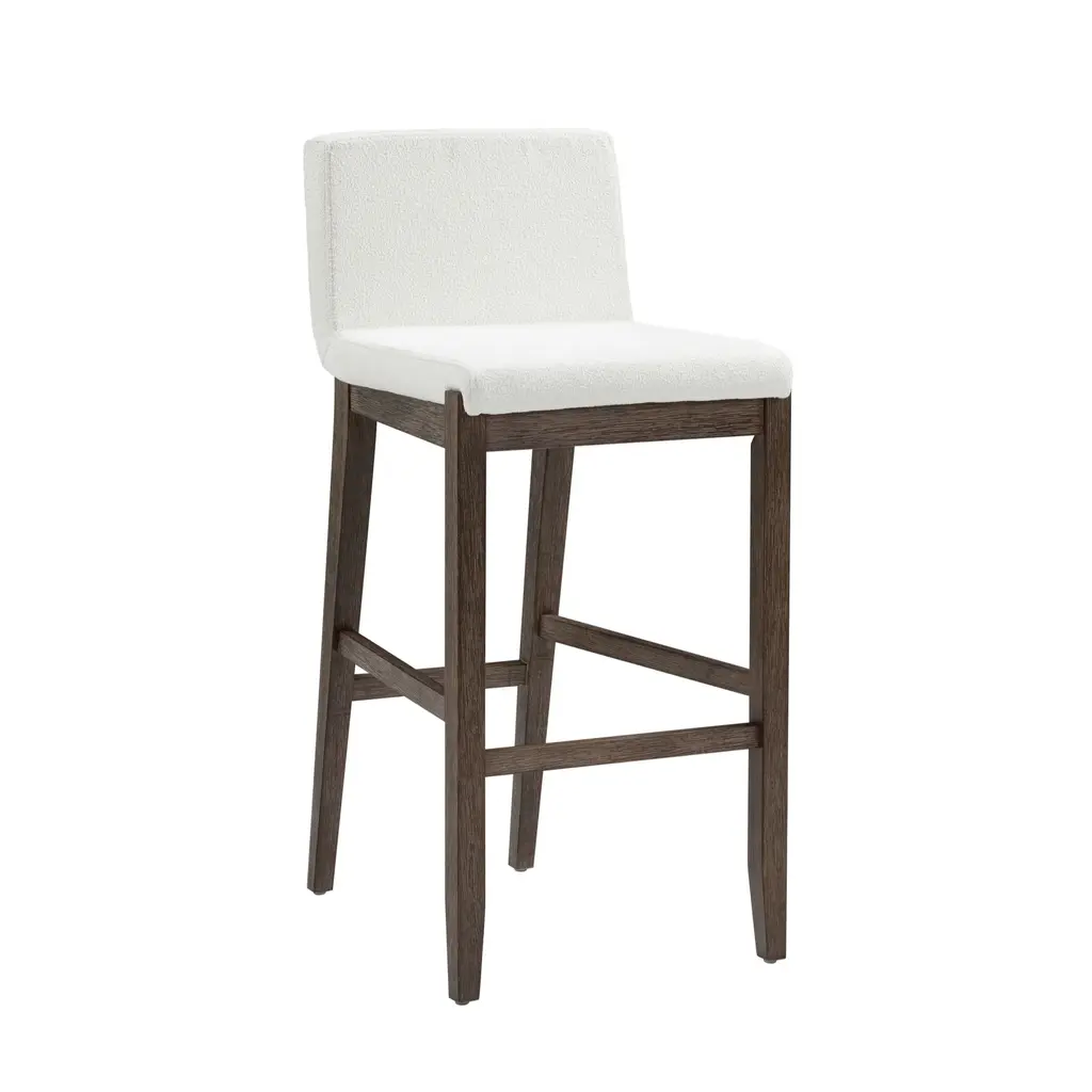 Kick your feet up in style with our Gracie bar stool. With an exposed wood back and sleek modern design, Gracie is sure to stun. Gracie combines a wire brushed dark brown wood finish and a boucle linen weave cushion for ultimate comfort and style. It boasts a modern silhouette with tapered legs and a curved seat, making this bar stool the star of any kitchen. So grab your drink of choice and sit back in full comfort on these made-to-last bar stools.