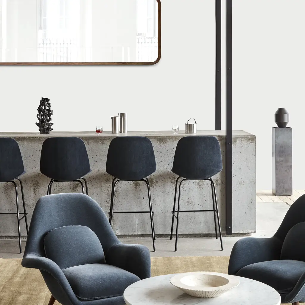 With its sculpted shell and slender steel base, the Eyes 4-Leg Barstool offers ergonomic support and a refined silhouette. The seat is constructed from moulded cold-cured foam reinforced with steel, fully upholstered in fabric or leather. Suitable for both bar and counter settings, it balances comfort and versatility.