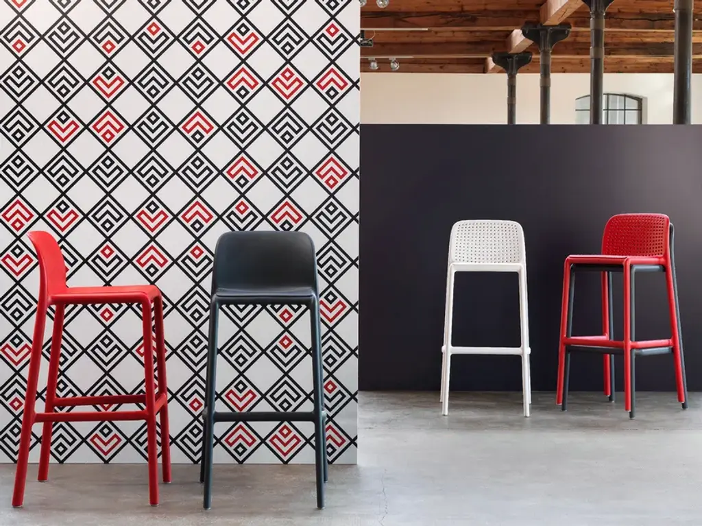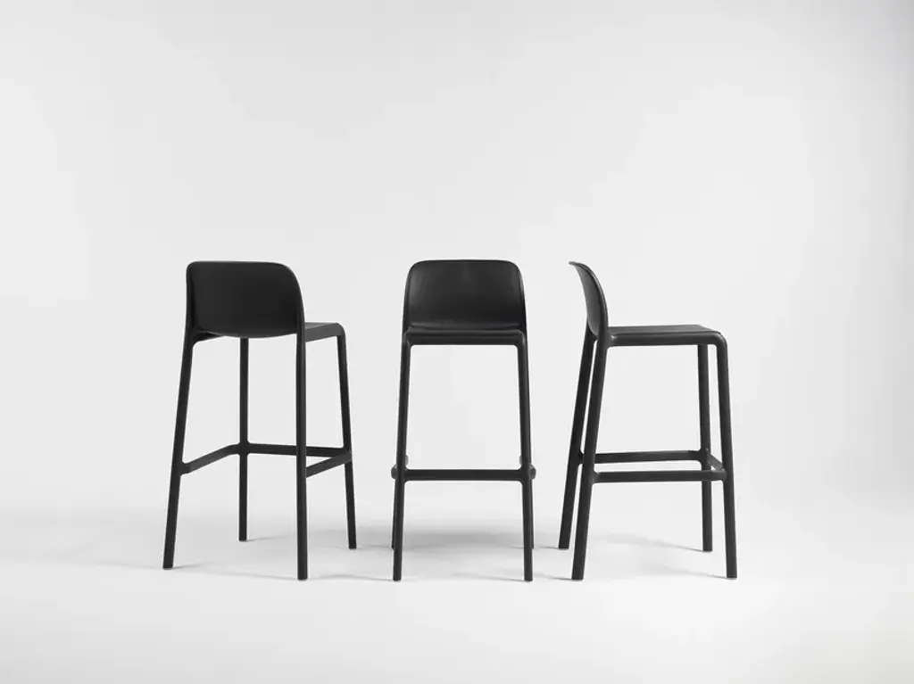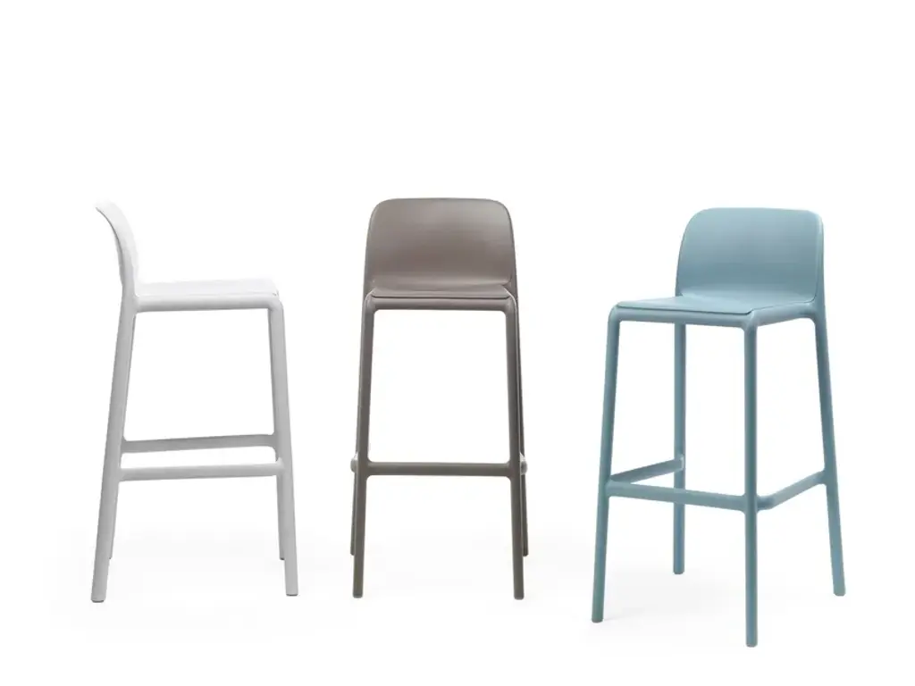 Lightweight and stackable, Faro is a single-body stool with clear-cut and simple lines, featuring rounded profiles and edges, as well as generous dimensions. Its sturdy, yet slender, seamless tubular frame provides a comfortable and agile seat. Made of recyclable UV-treated and mass-coloured fiberglass resin, with a matt finish, the Faro stool does not require any special maintenance. Fitted with non-slip feet, Faro is available in various colours in delicate shades and in more dynamic and vibrant ones. Faro is available in the following dimensions: W. 49 cm and D. 51 cm, with a seat H. 76 cm and backrest H. 97 cm.Ideal for outdoor and indoor use.