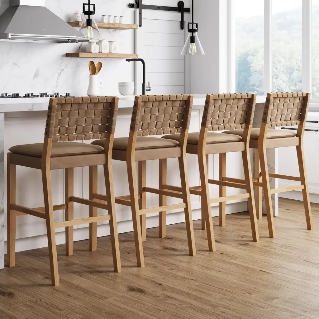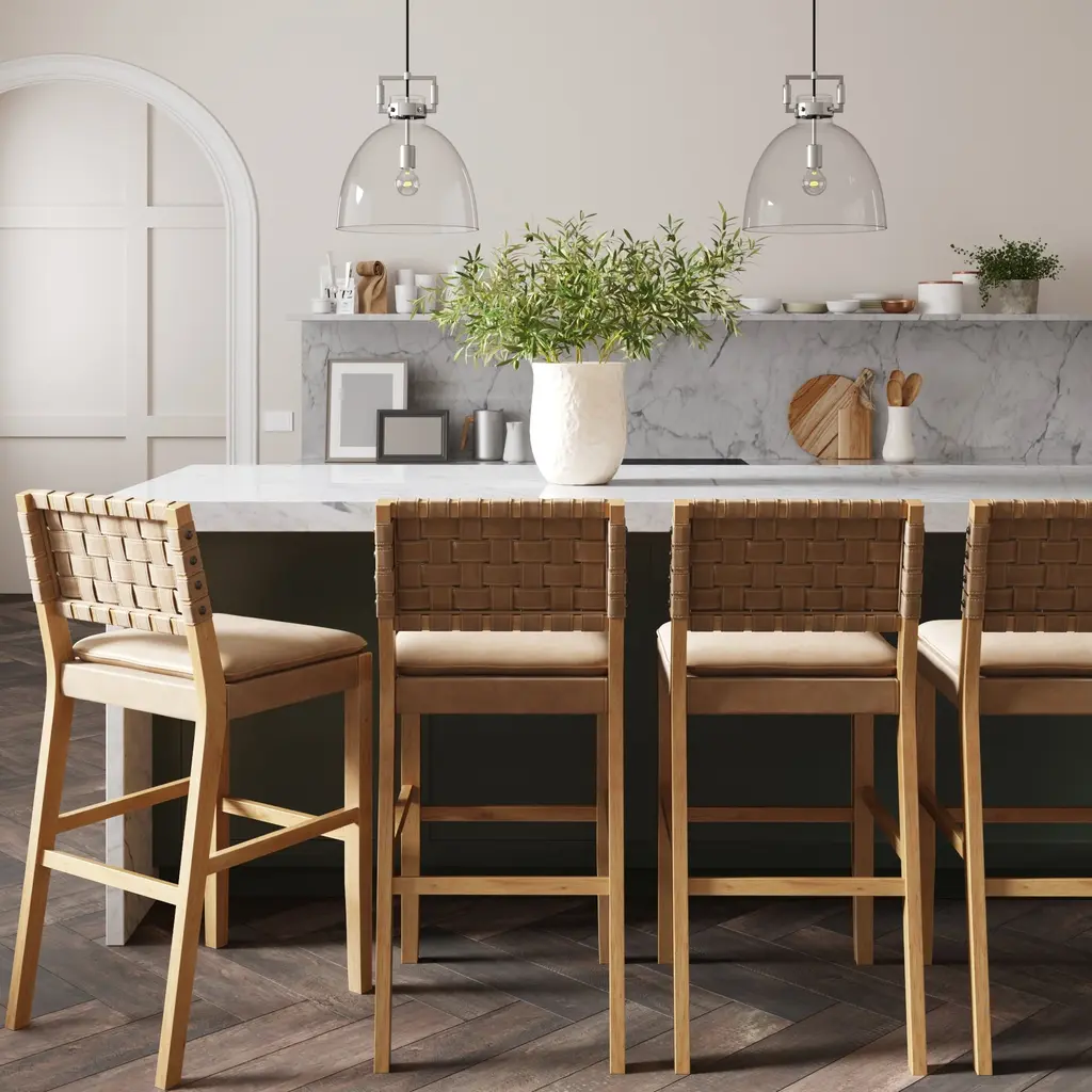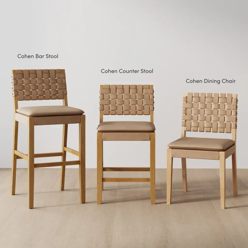 Grab your favorite drink and sit comfortably for hours on the Cohen bar stool. Cohen's solid wood frame has a hard wearing painted finish and is complemented by a woven light brown faux leather back that adds warmth to your kitchen, even when tucked and hidden under the counter. We even added a comfortable padded saddle seat with rounded corners and perfectly placed foot rests. If you take a closer look you'll see studs on the side of the chair—a detail too luxurious to miss! With an easy 25 minute assembly time, you won't regret grabbing more than one!