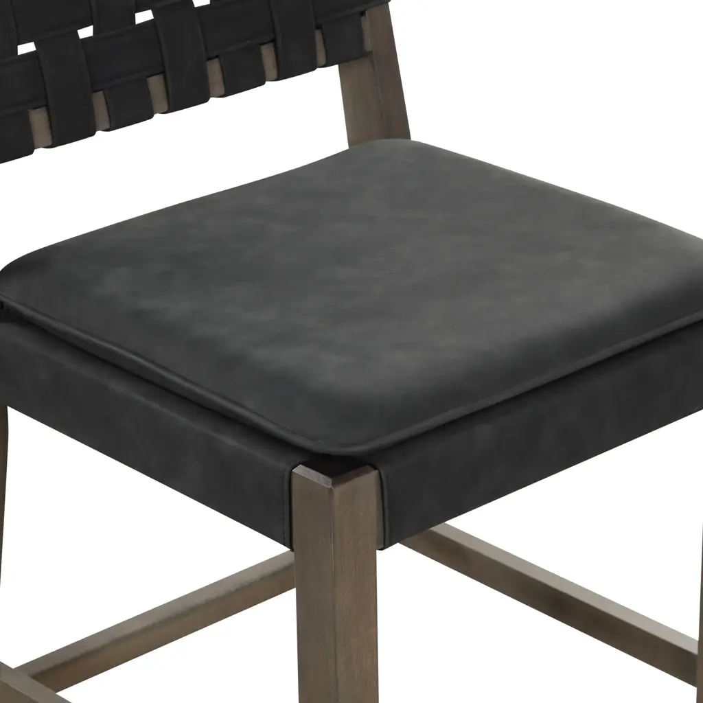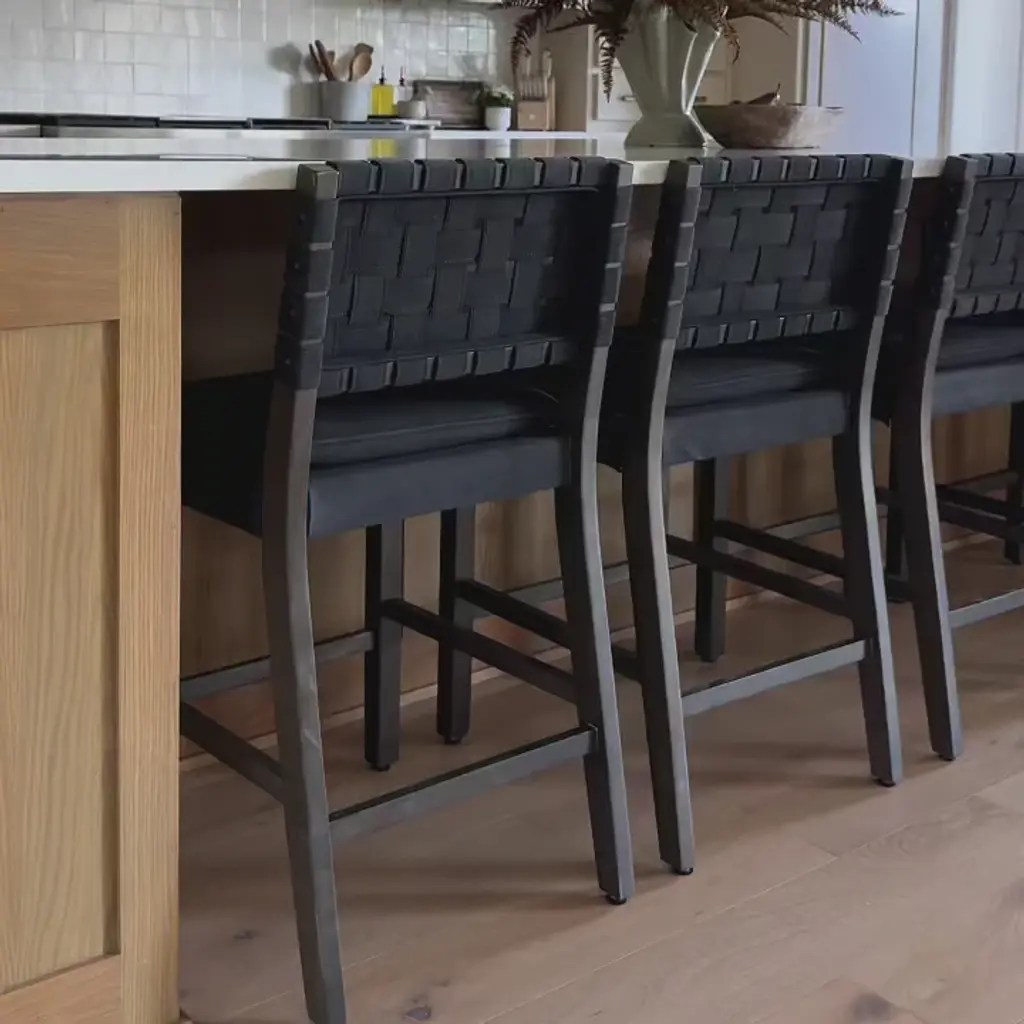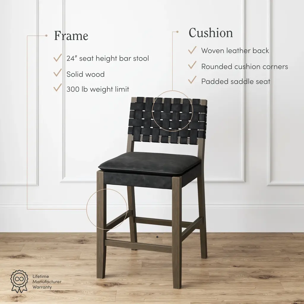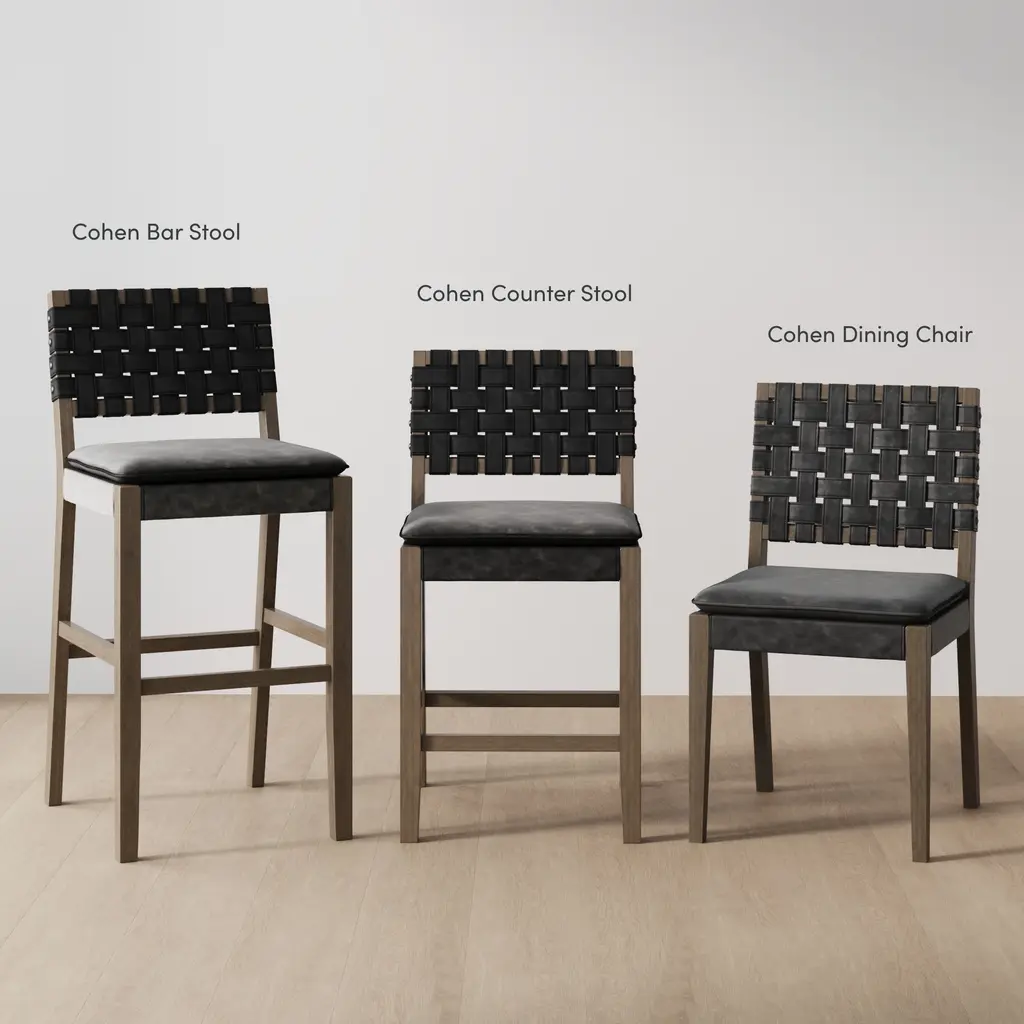 Grab your favorite drink and sit comfortably for hours on our mid-century modern Cohen bar stools. Cohen's solid wood frame has a hard wearing graphite black painted finish and is complemented by a woven brushed black PU leather back that adds sophistication to your kitchen, even when tucked and hidden under the counter. We even added a comfortable padded saddle seat with rounded corners and perfectly placed foot rests. If you take a closer look you'll see studs on the side of the chair—a detail too luxurious to miss! With an easy 25 minute assembly time, you won't regret grabbing this set of 2!