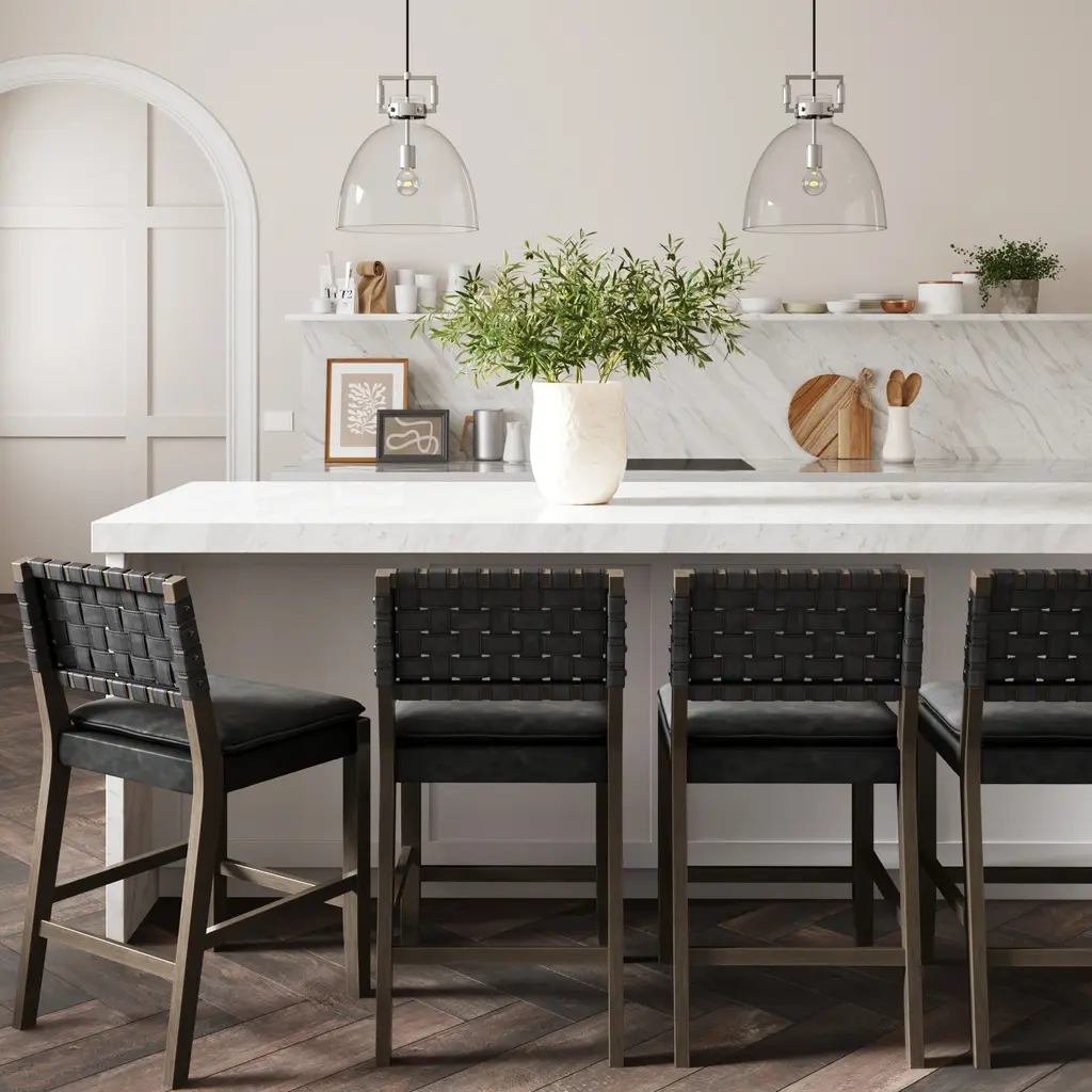 Grab your favorite drink and sit comfortably for hours on our mid-century modern Cohen bar stools. Cohen's solid wood frame has a hard wearing graphite black painted finish and is complemented by a woven brushed black PU leather back that adds sophistication to your kitchen, even when tucked and hidden under the counter. We even added a comfortable padded saddle seat with rounded corners and perfectly placed foot rests. If you take a closer look you'll see studs on the side of the chair—a detail too luxurious to miss! With an easy 25 minute assembly time, you won't regret grabbing this set of 4!