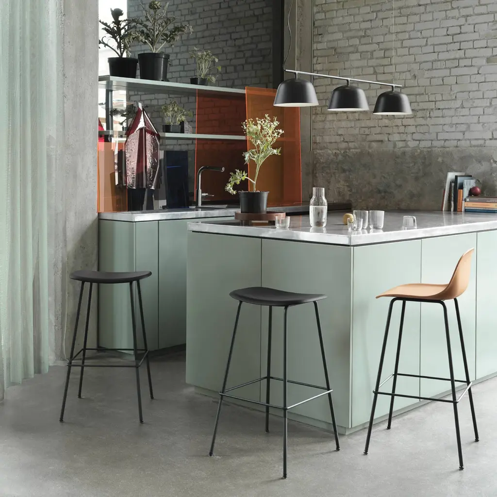 With a visually uncomplicated character, this Fiber barstool features a steel tube base with a powder-coat finish that's color-matched to its molded seat. Adhering to the DNA of Danish brand Muuto's series from designers Iskos-Berlin, this innovative riff on the iconic Scandinavian shell chair utilizes a novel plastic composite made with 25 percent wood fibers. The material has a pleasingly variegated texture and makes for sturdy but refined seating barside or at a kitchen island.