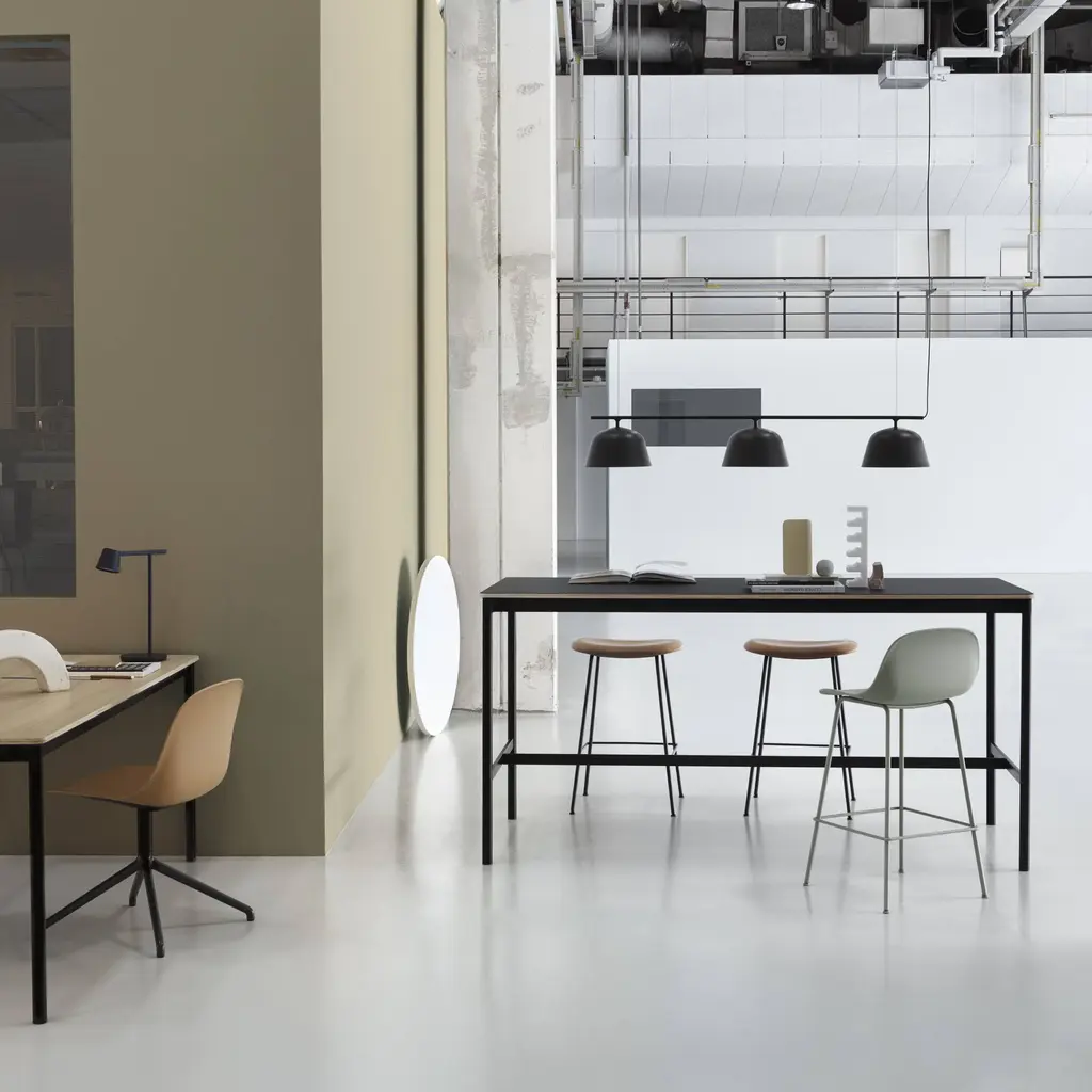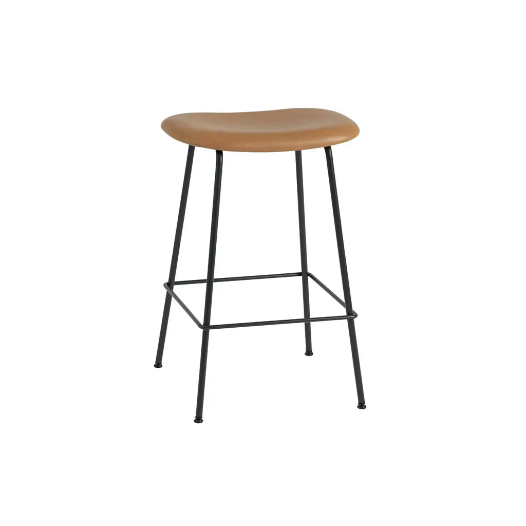 Rich leather or a premium textile provides a luxe overlay for the molded seat of Danish brand Muuto's upholstered barstool from its signature Fiber series. Designers Iskos-Berlin have updated the notion of classic Scandinavian shell seating with an inventive plastic composite made with 25 percent wood fibers. In either bar or counter height, Fiber's tube base crafted in powder-coated steel is available in black, white or grey to harmonize with the chosen upholstery.
