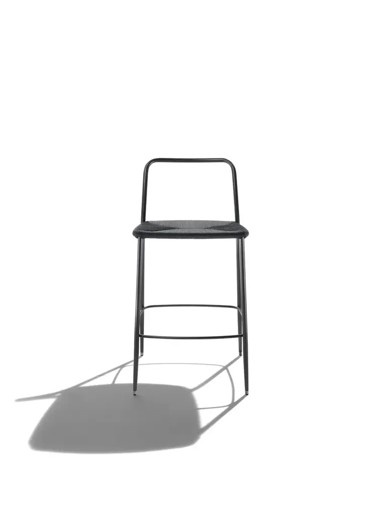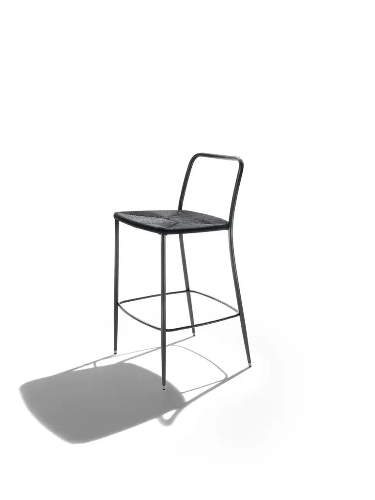 The aesthetic of the First Steps Outdoor chair clearly reveals the design philosophy of Christophe Pillet, who explains: “I am not on a quest for the extraordinary, but rather for that which is beautiful and able to kindle emotion in the ordinary”.This impassioned exploration of the essence of things is also fully developed in the design of the First Steps chair whose lyric simplicity seems to trace back to the archetypal object-chair.The sinuous structure that rises to form the metal backrest has a painted white or burnished finish, while the tightly woven seat material is entirely hand-made in either paper cord or paper rush cord.The same design and materials appear in the bar stool, whose refined appearance translates to undeniable versatility, making it a tasteful and discreet fit in any setting.Structure in 316 stainless steel with electropolished or burnished finish; or, epoxy-powder-coat finish in white 100, wine red 405, or khaki green 705Seat in 316 stainless steel with woven matt polypropylene cord in natural 8102, ice 8103, anthracite 8105 or straw 8101 colorFeet in cast aluminum with matt brushed or burnished finish. Feet rest on tips made of thermoplastic materialCover in waterproof material; cover is upon request, with upcharge