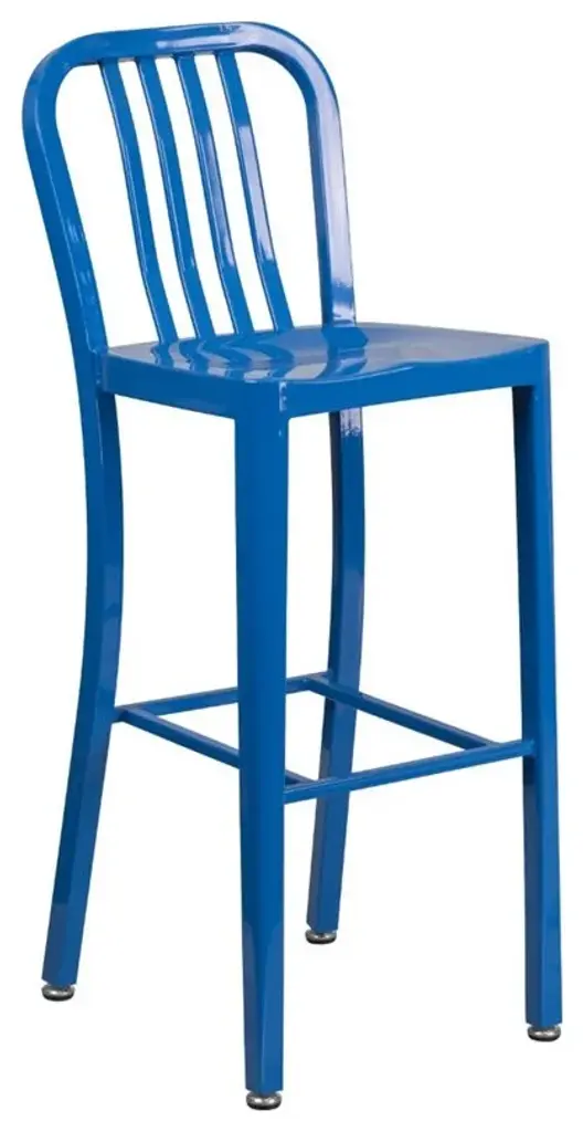 Invite family and friends over to hang out at your home bar or around your kitchen island on these comfortable colorful metal dining stools. Bring outdoors to enjoy the warm weather on your patio while sitting around your bar height patio table. The versatile 30" bar stool will look great in any environment: kitchen, restaurants, bars, bistros, or your local greasy spoon. If you're looking for a trendy stool for your restaurant that will hold its style throughout the years, this colorful restaurant bar stool will not disappoint. Crafted from durable galvanized steel metal polished in a glossy finish, this blue metal stool with back was designed to withstand regular use in the fast-paced restaurant industry. Patrons have a suitable resting place for their feet for comfort if your bar or bar height table doesn't include a footrest. Uneven floors are no problem with adjustable screw leveling floor glides. Pair these kitchen stools with our matching blue metal chairs and counter height bar stools to have seating at your dining table, kitchen island and home bar. Coordinate the seating in your restaurant with the same style of seating at your bar and restaurant tables. These bar chairs can be used year-round outside, for longevity protect the frame from long periods of wet weather.Features:Finish: Blue Powder CoatMaterials: Galvanized Steel and PlasticErgonomic contoured seatScrew leveling floor glidesDesigned for indoor and outdoor useDesigned for commercial and residential useWarranty: 2 Year PartsSpecifications:Product Dimensions: 43" H x 15.5" W x 20" DProduct Weight: 19 lbsSeat Dimensions: 30.25" H x 15.5" W x 14" DProduct Dimensions: (Back) 13.75" H x 15.5" WWeight Capacity: 500 lbs