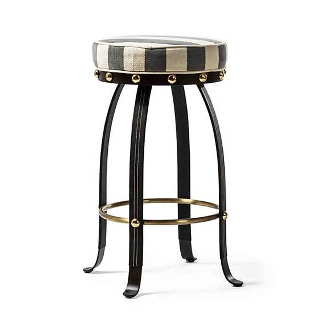 Please, be seated in The Entertaining Kitchen™ on this bar stool. Made of iron, it has stylishly shaped metal legs wrapped in leather and trimmed with brass button detailing. It’s fitted with a comfortable cushion upholstered in grey chenille stripe.