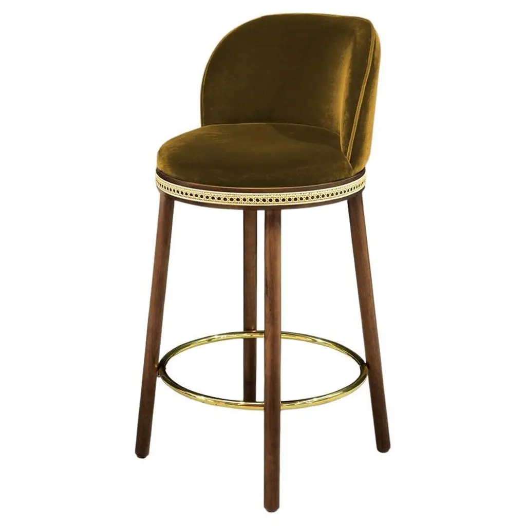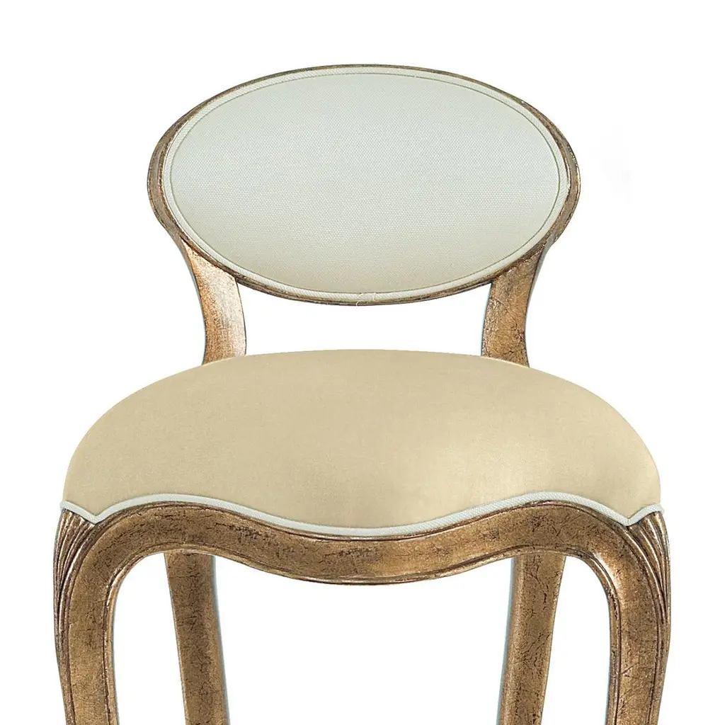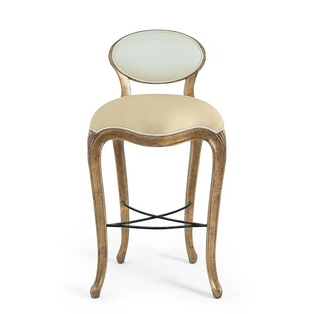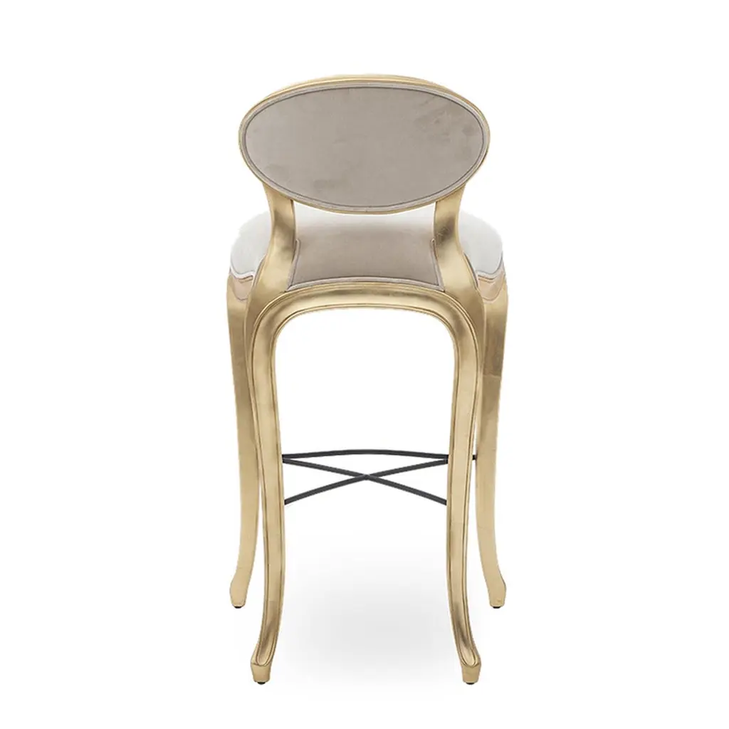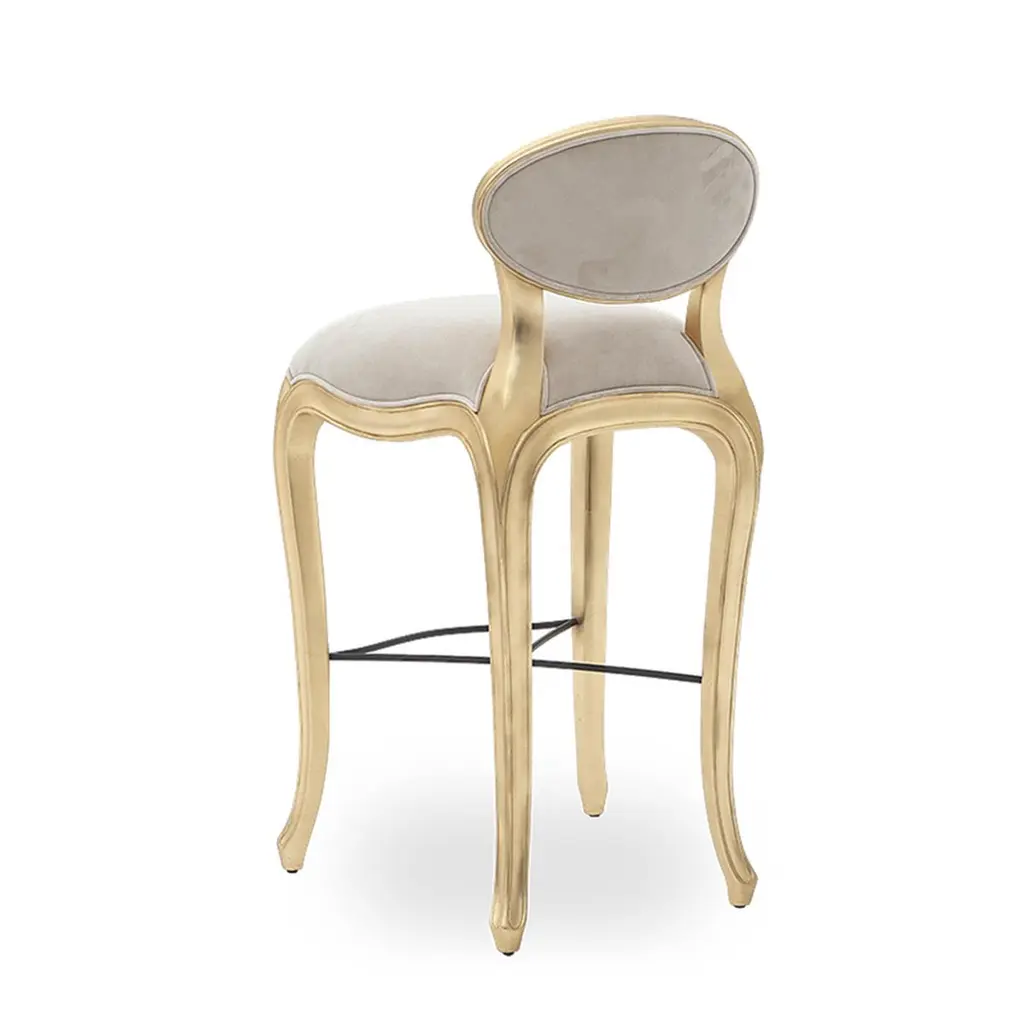 Barstool Flore with structure in handcrafted solidmahogany wood in gold leaf finish, with cabriolefeet, with footrest. Upholstered seat and backcovered with high quality fabric Alcantara soft grey.Seat dimensions: L 51 x D 44, seat height 80 cm.Stool dimensions: L 53 x D 55 x H 106 cm.Also available in antique gold finish with cream fabric.Also available with other fabrics on request.