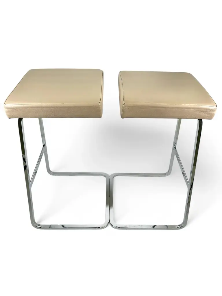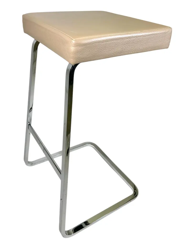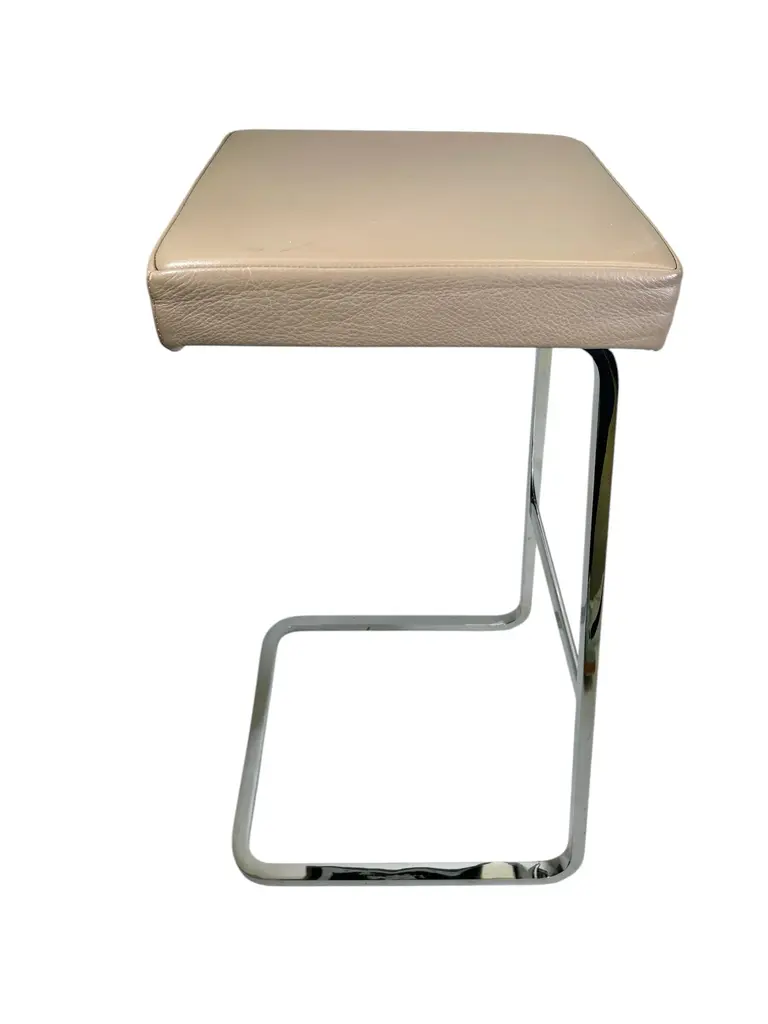 Four Seasons Bar Stool by Mies Van Der Rohe for Knoll in Leather and Chrome. Designed by Ludwig Mies van der Rohe, 1958 for The Four Seasons Hotel in NYC. As a leading Modernist architect and furniture designer, Mies van der Rohe elevated industrial age materials to an art form. The elegant Four Seasons barstool, conceived in 1958 for the Four Seasons Restaurant in New York designed by Philip Johnson, was never mass produced. The classic barstool reflects Mies's signature spareness and features a lean profile, clean lines and meticulous craftsmanship. The bar height stool sports an upholstered seat with a hand buffed polished chrome frame.Knoll is the only authorized and licensed manufacturer of the Van der Rohe collection. Mies van der Rohe's signature is stamped into the frame of each piece to guarantee authenticity.