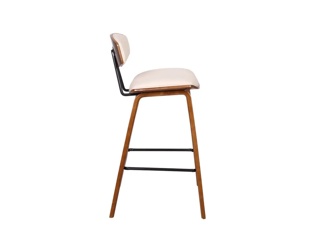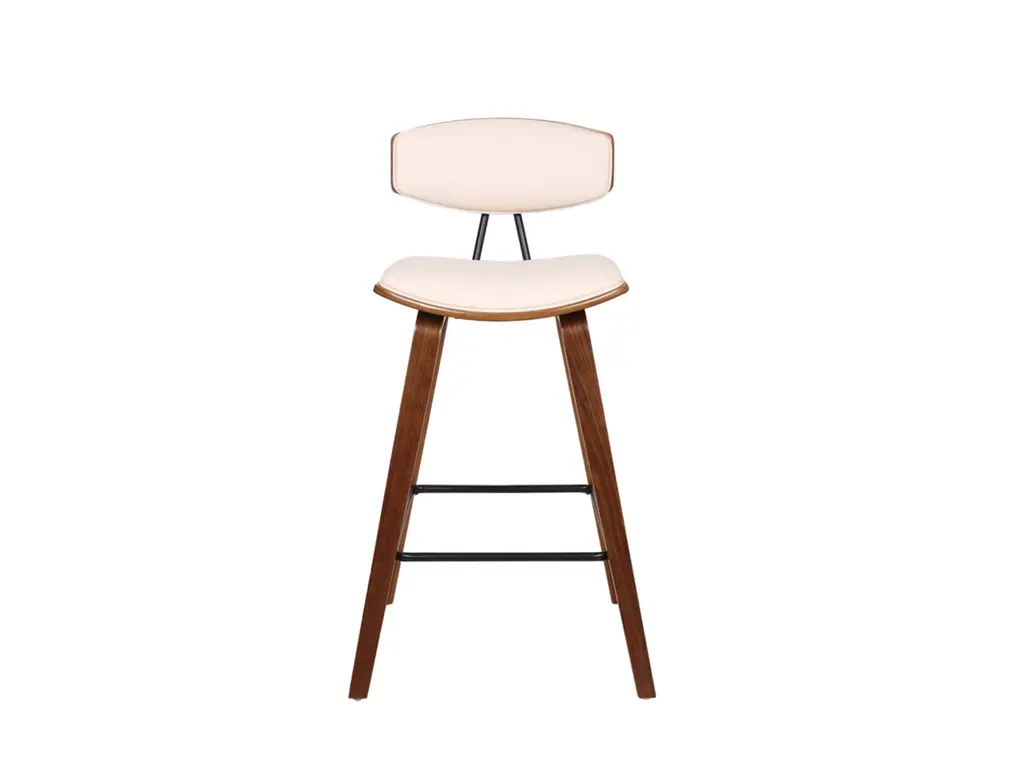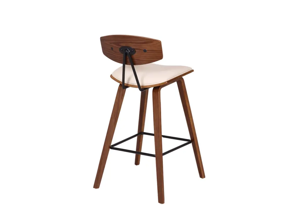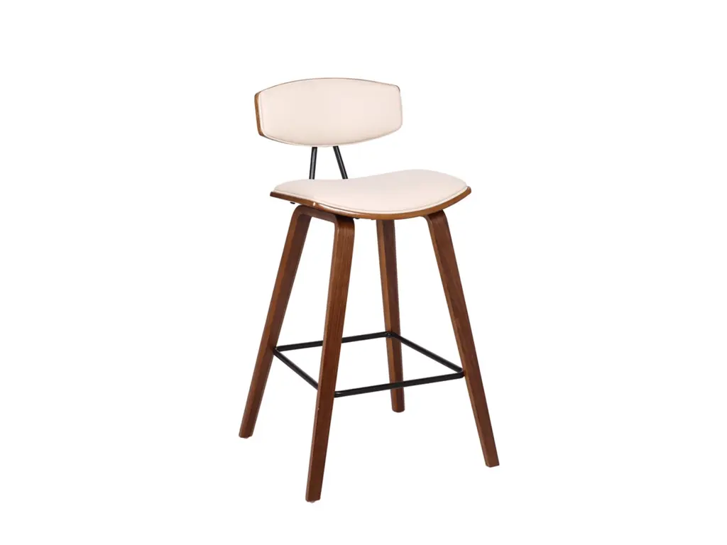 Sophisticated and versatile, the Fox counter height bar stool has a look that turns heads, and a mid-century design that is right at home in most any room decor. It features a walnut-tone frame and legs, plus a cream-colored faux leather seat with high-density foam padding for comfort. The bar stool includes a metal footrest that provides added leg support and enhances the overall look.