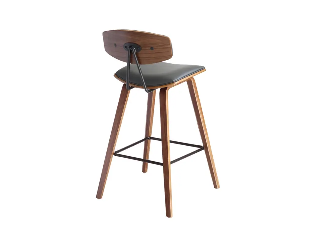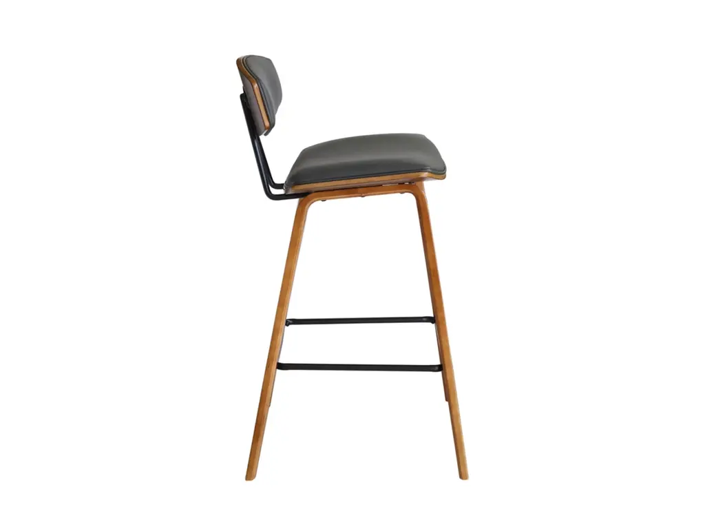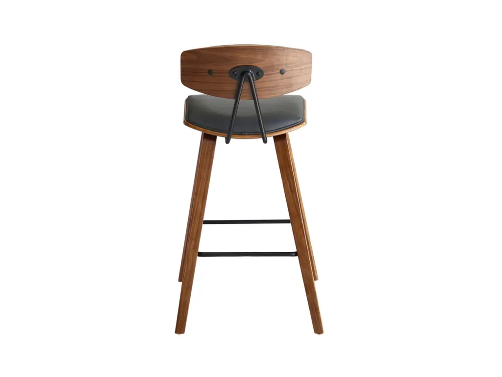Sophisticated and versatile, the Fox counter height bar stool has a look that turns heads, and a mid-century design that is right at home in most any room decor. It features a walnut-tone frame and legs, plus a gray faux leather seat with high-density foam padding for comfort. The bar stool includes a metal footrest that provides added leg support and enhances the overall look.
