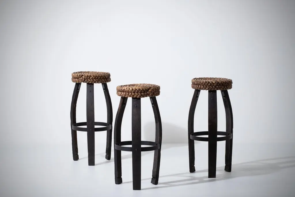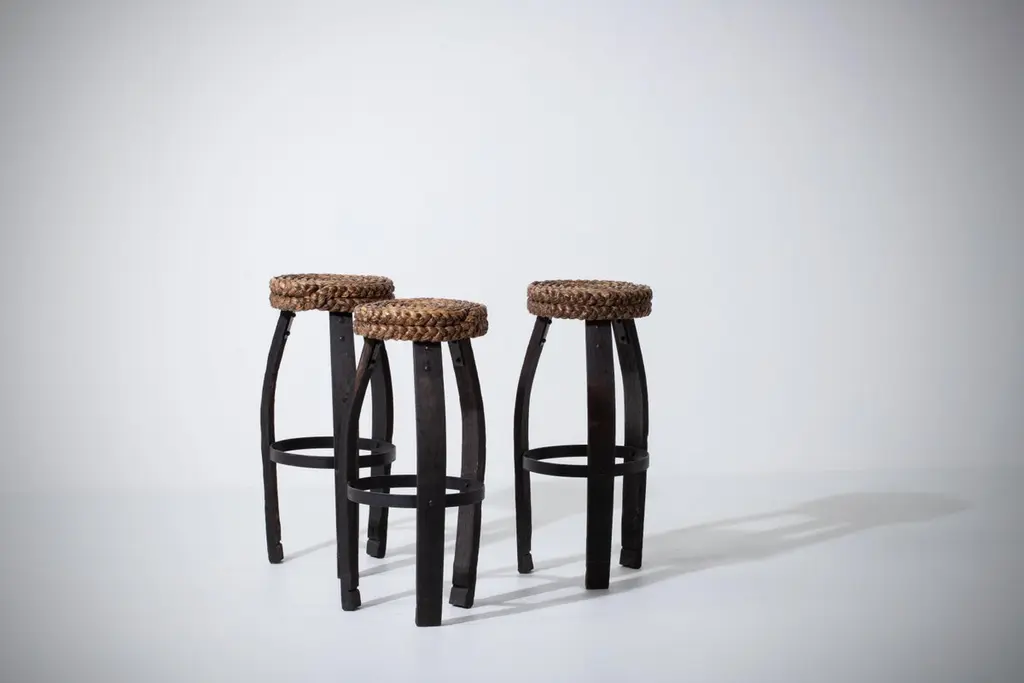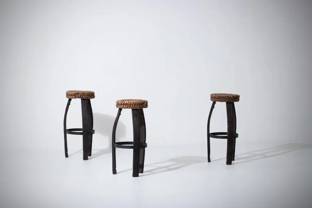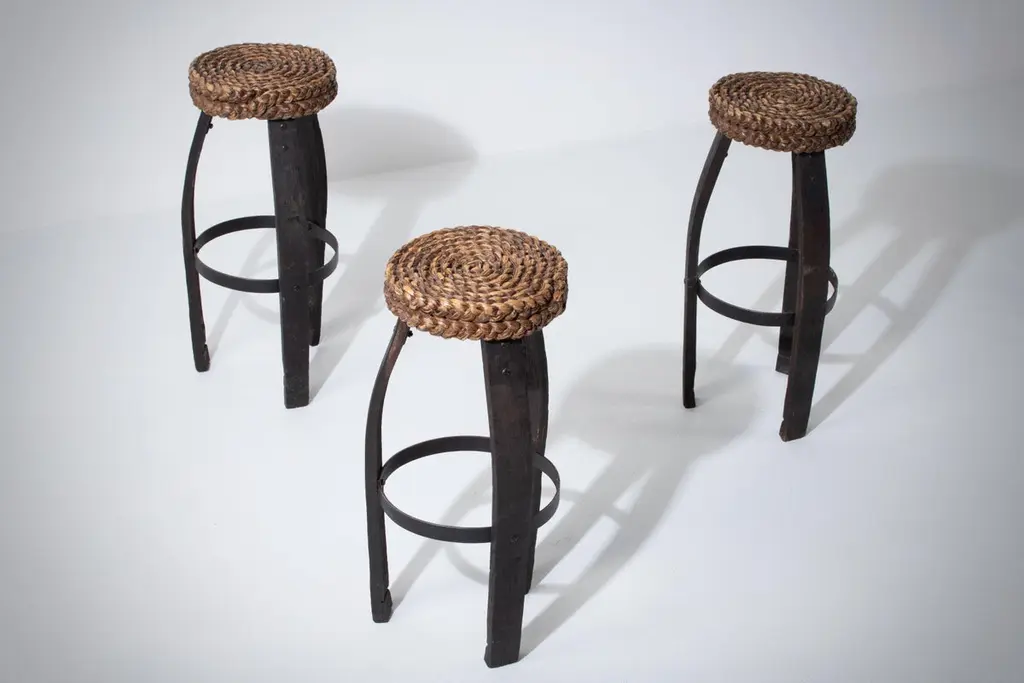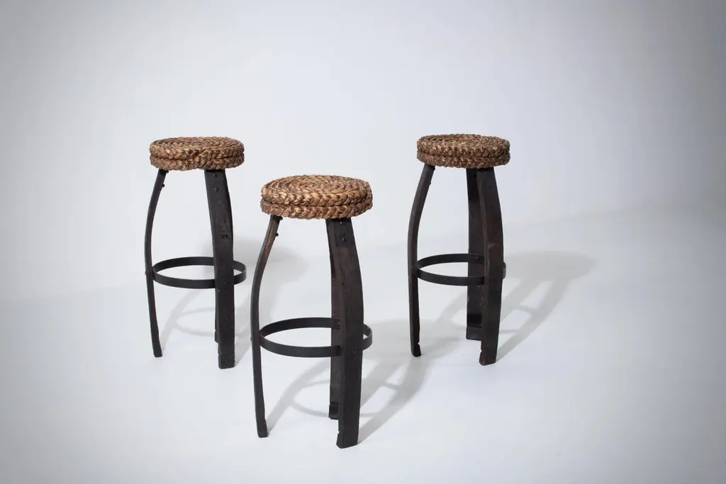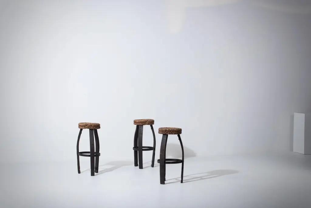 Bar stool in oak with a woven cane seat by French designers Adrien Audoux and Frida Minet. France, 1950s.The seat consists of thick, circular braided reed braids. Legs are made of dark oak and iron, which forms a perfect contrast to the seat. The stoll has a wonderfully natural, rustic look.3 stools available.