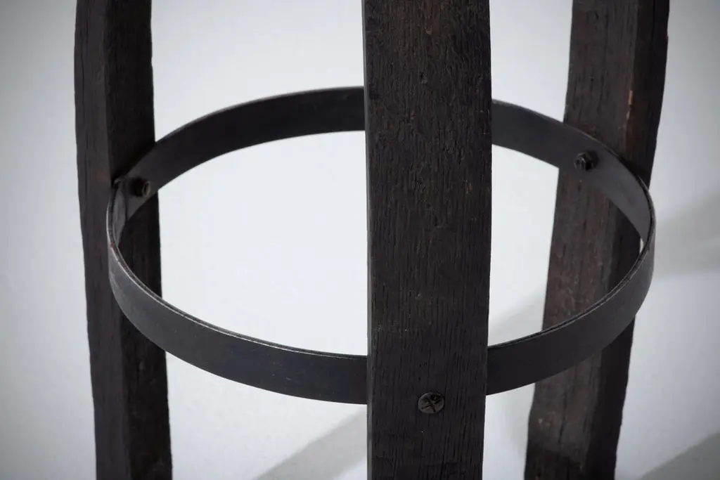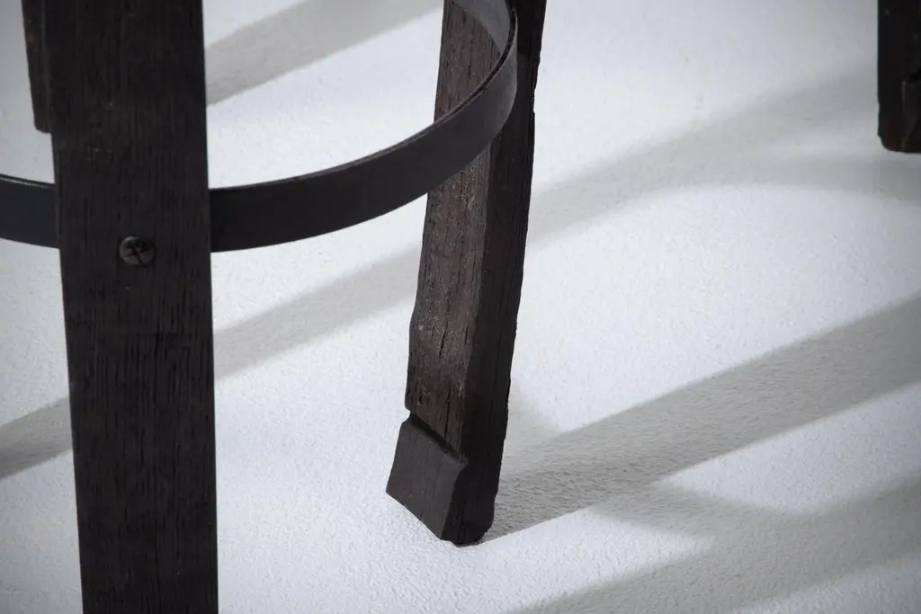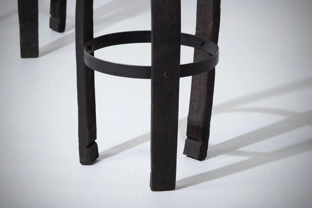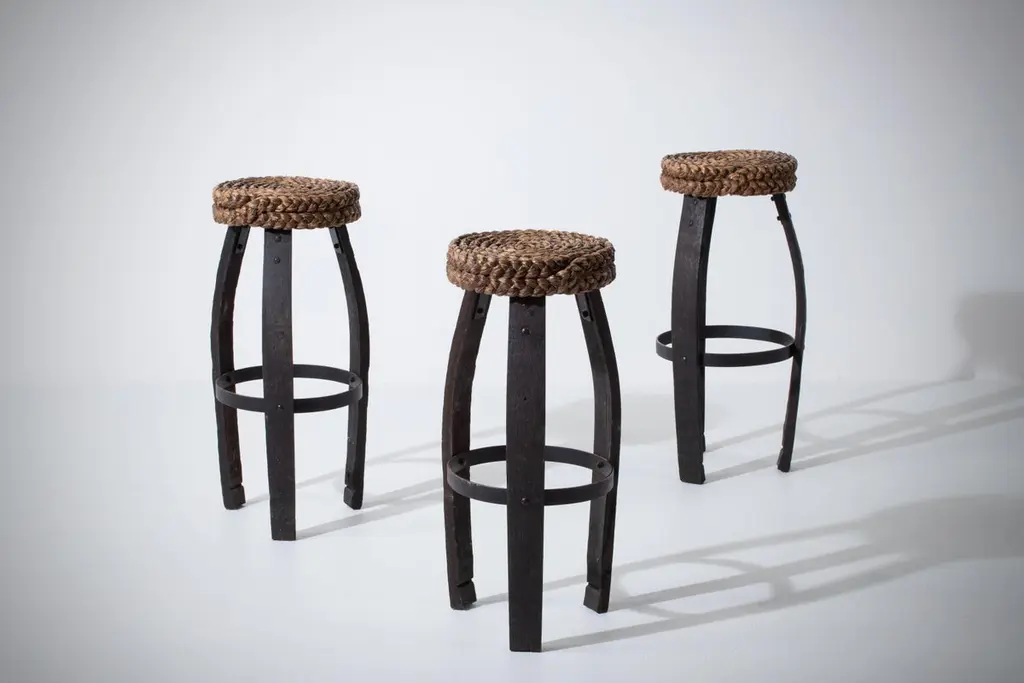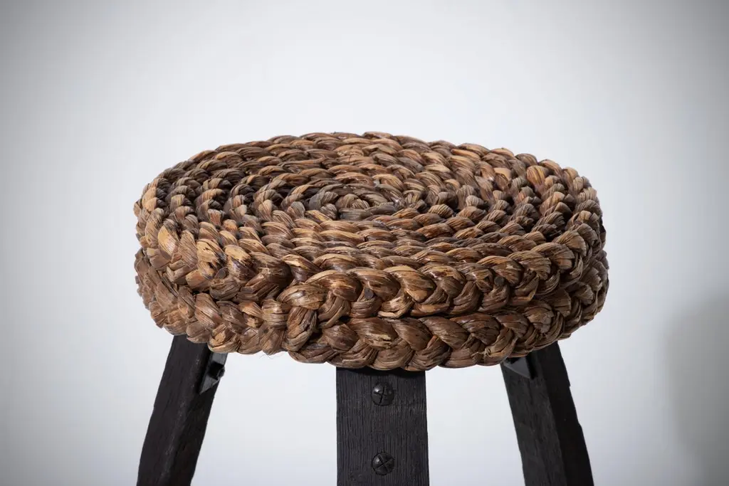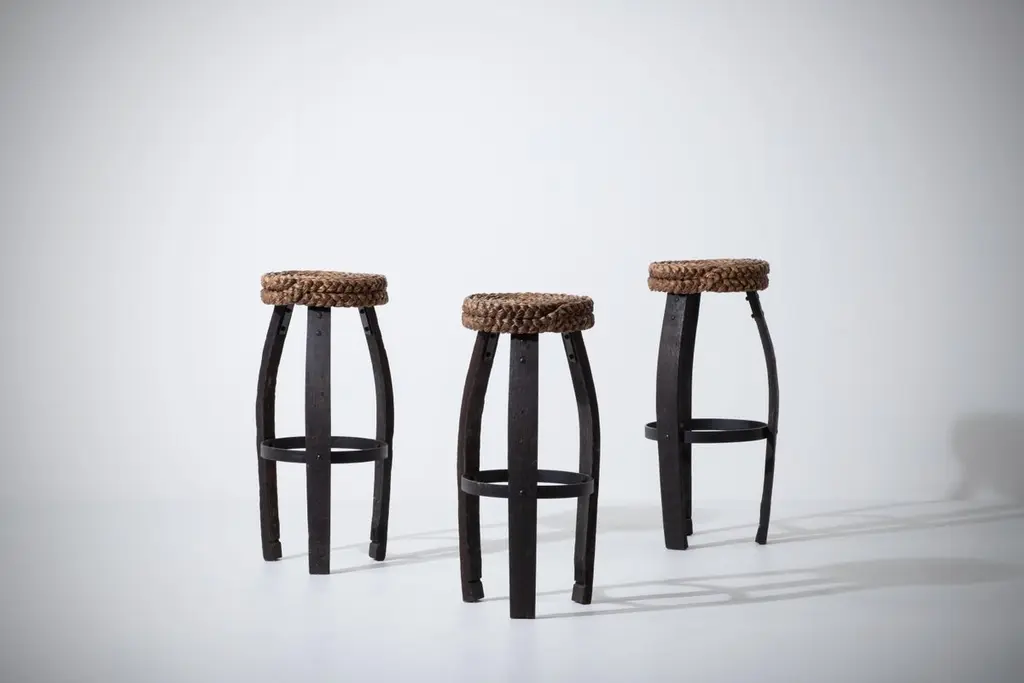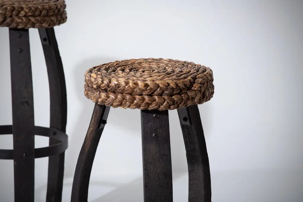 Bar stool in oak with a woven cane seat by French designers Adrien Audoux and Frida Minet. France, 1950s.The seat consists of thick, circular braided reed braids. Legs are made of dark oak and iron, which forms a perfect contrast to the seat. The stoll has a wonderfully natural, rustic look.3 stools available.