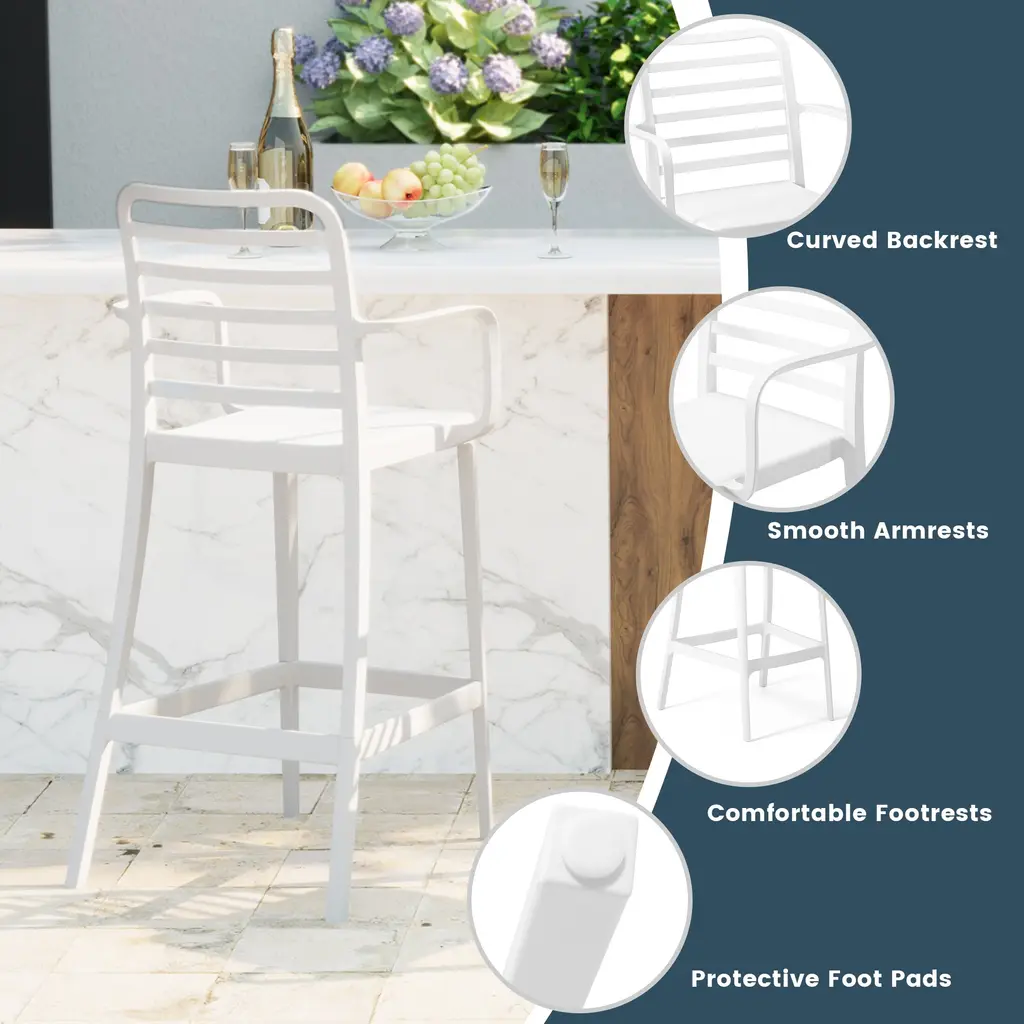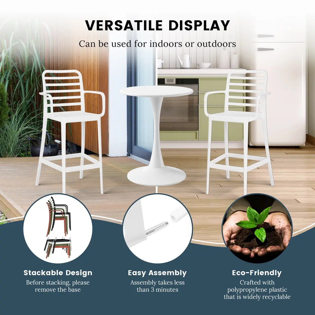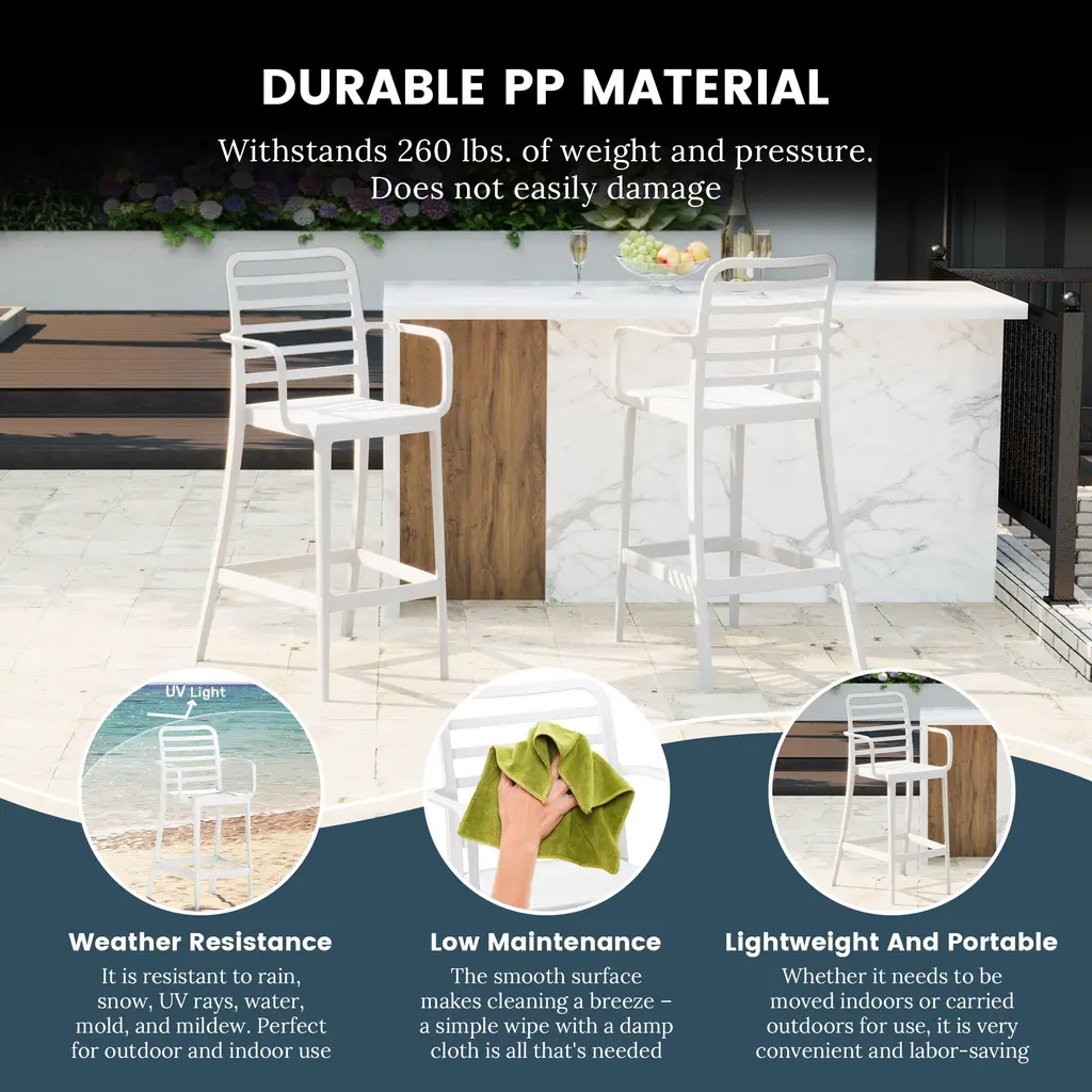 Add charm and vibrant style to your balcony or terrace with this set of two versatile outdoor bar stools. Crafted from durable, all-weather Polypropylene (PP) resin, these 29.5-inch high stools are designed to withstand the elements, maintaining their rich color year-round thanks to UV and fade-resistant properties. Lightweight and easy to move, they're perfect for creating a flexible dining or entertaining area, even in small spaces. A ventilated backrest ensures comfort on warm evenings, and a convenient footrest provides added support. Splayed back legs add stability. For added versatility, the bottom half of the base is removable, allowing these bar stools to convert into standard dining chairs. When disassembled, they offer a more compact storage solution.While we strive to accurately represent product colors, please be aware that actual colors may vary slightly due to individual screen settings and lighting conditions. FeaturesDetails:Bar Stool