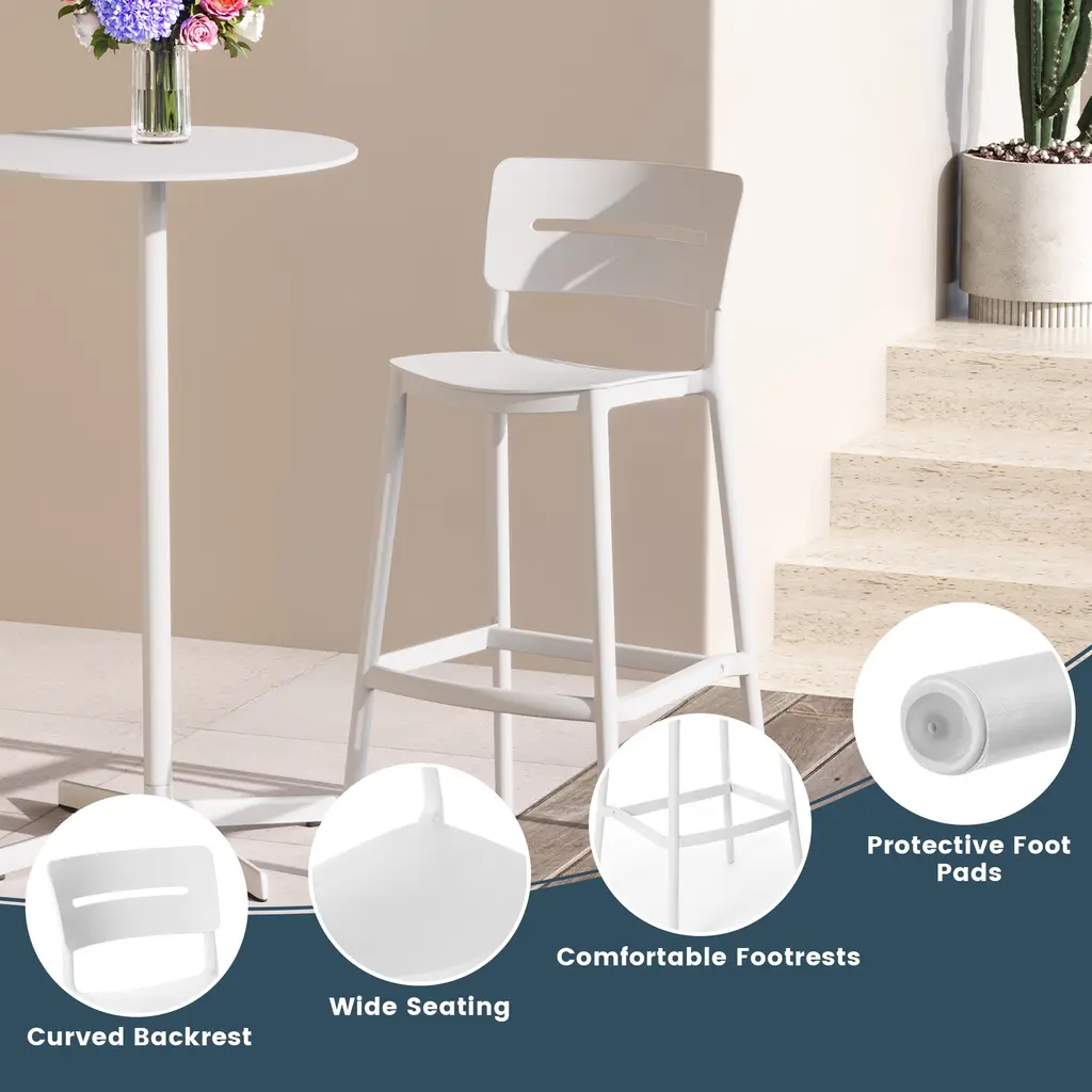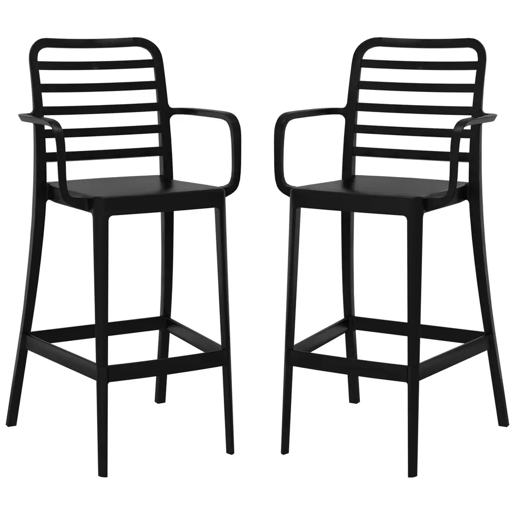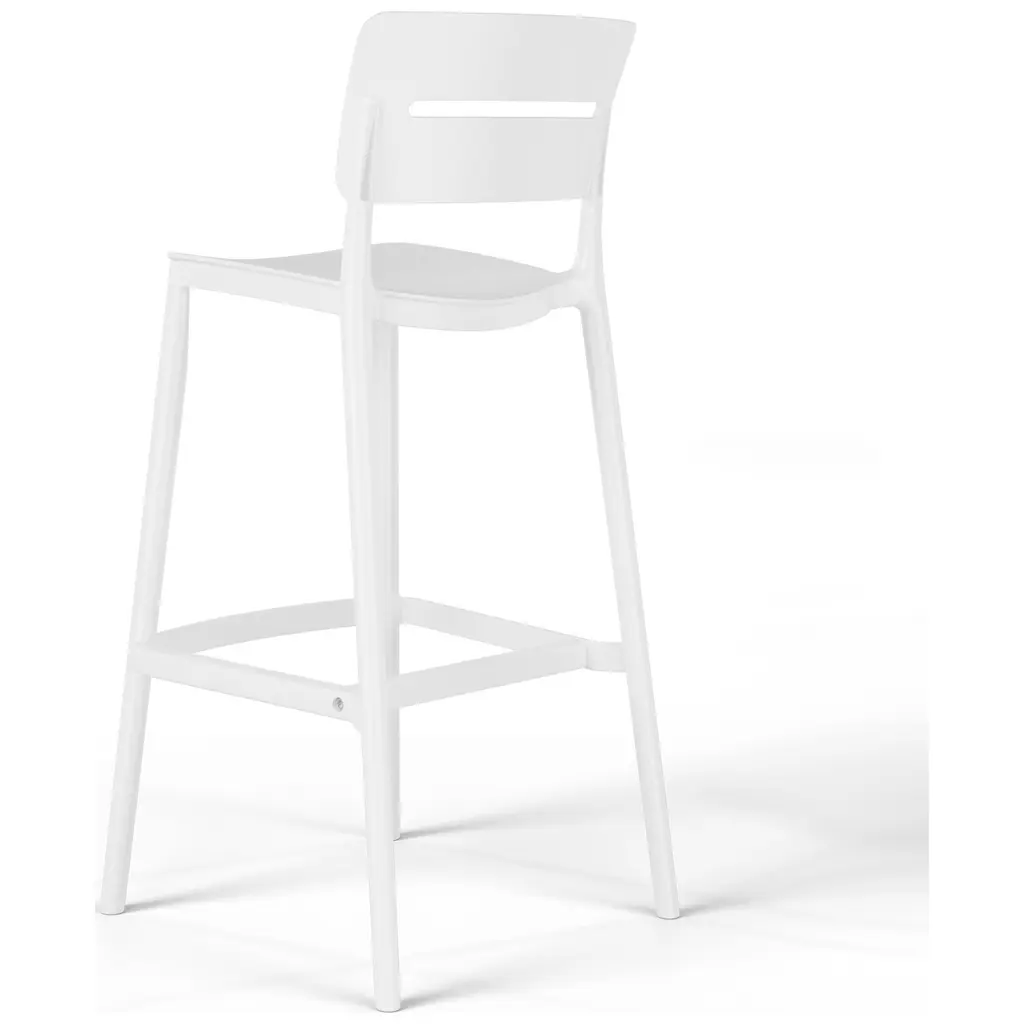 This set of two patio bar stools is perfect for pulling up to a pub table in your entertaining area or positioning around a patio kitchen island. Their simple and elegant design makes them easily portable, so adding extra bar seating for outdoor gatherings is effortless. Crafted from UV-resistant polypropylene resin, they require minimal maintenance. Four straight legs support each stool, featuring a wrap-around support bar that doubles as a comfortable footrest. For space-saving storage, simply remove the rear footrest and stack the stools when not in use. A smart choice for your outdoor spaces!While we strive to accurately represent product colors, please be aware that actual colors may vary slightly due to individual screen settings and lighting conditions. FeaturesDetails:Bar Stool