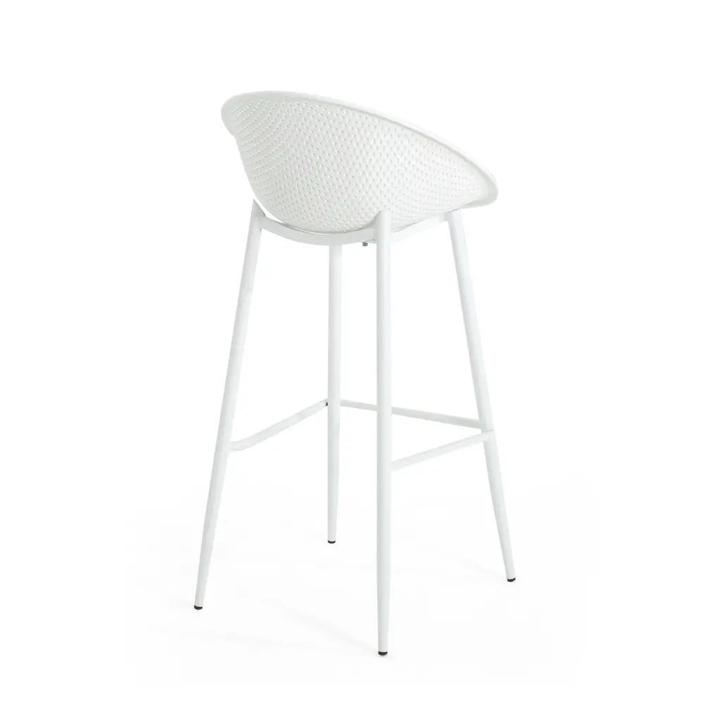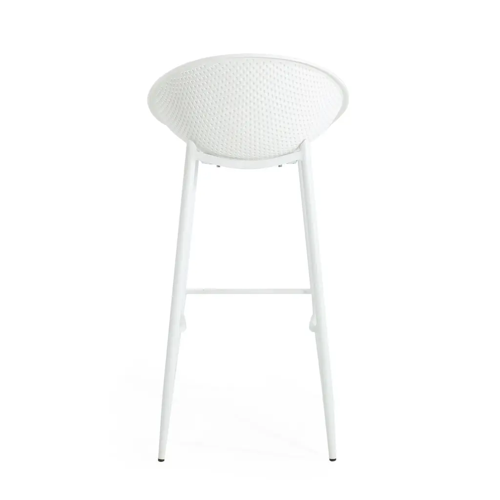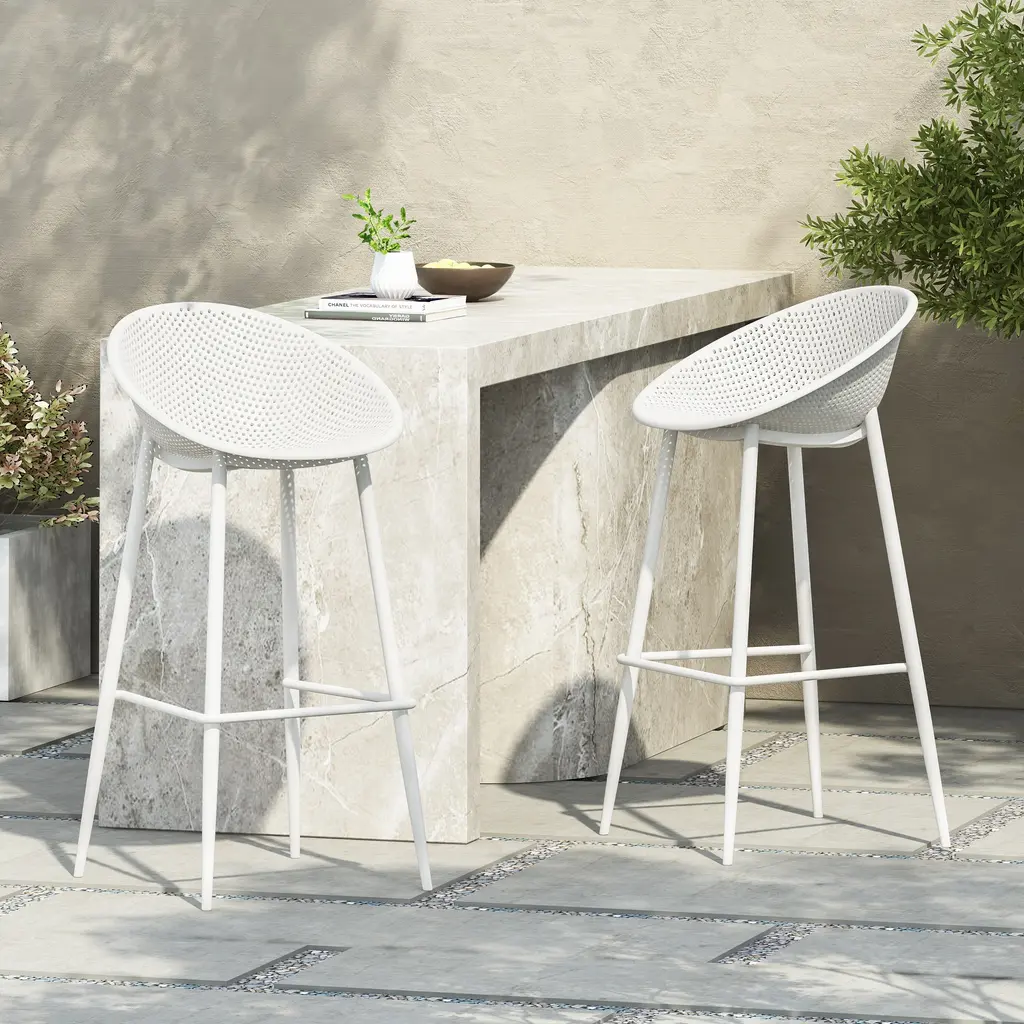 Highlight your outdoor space with sleek, smooth looks that will support you through the seasons. Featuring weather-resistant properties and a unique plastic blend material, our outstanding outdoor dining chair set provides astonishingly stable frames that will last you for years to come. This minimalistic design balances clean-cut lines and a perforated diamond mesh pattern to create an impressive look of sturdy structure and stylish comfort. Finished with a modern vibe, our chair set is sure to transform any backyard space into a refined masterpiece. MODERN DESIGN: With clean, precise lines, our barstools are the ideal modern accessory for your outdoor space. Finished with a perforated diamond pattern designed for breathability, each chair not only offers a chic, minimalistic look but also provides incredible structure. POLYPROPYLENE RESIN: Created with high-quality, specially designed polypropylene, our chair set is made to be highly durable and weather-resistant. Each individual component of our polypropylene blend is specifically chosen to create a unique mixture that ensures that your product is of the best quality. WEATHER-RESISTANT SET: Our set consists of weather-resistant material, known to repel water and resist sunlight. This durable set offers easy maintenance so you can spend all summer lounging outdoors in comfort. This comes as a set of two.