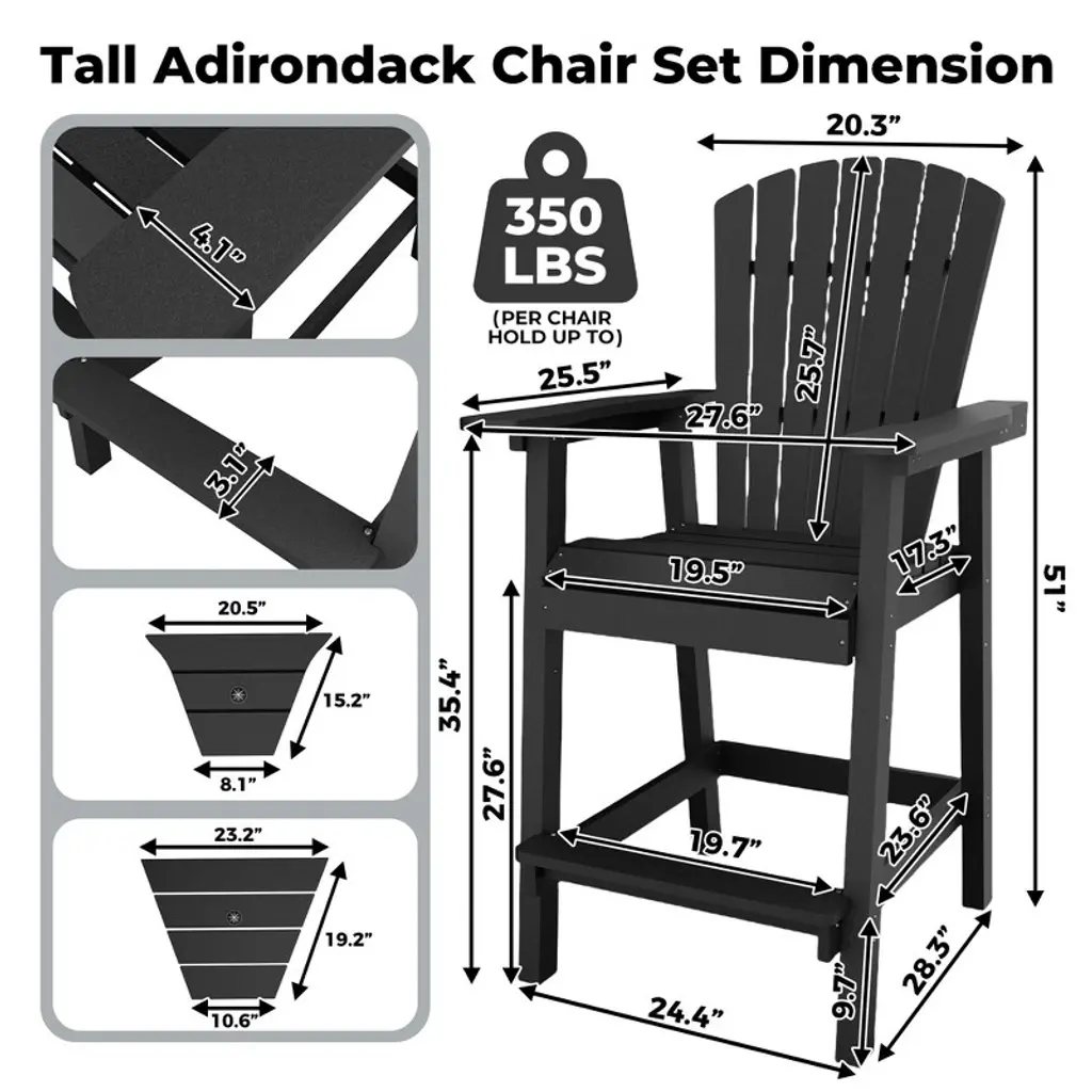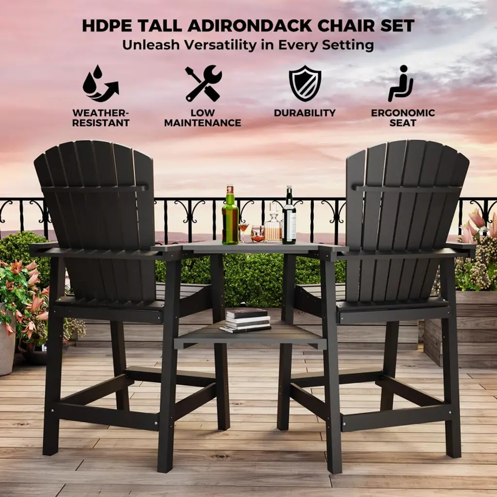 Outdoor Recycled Poly Adirondack Barstools Set of 2 – Tall Weatherproof Bar Height Chairs w/ Removable Tray, Black (350lb Capacity)