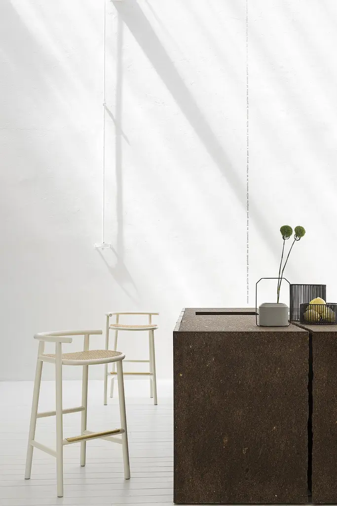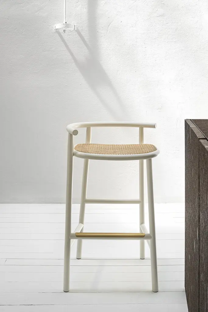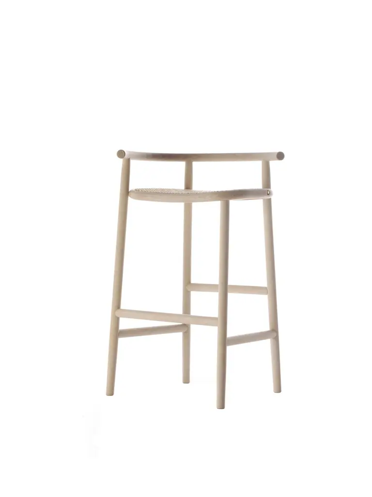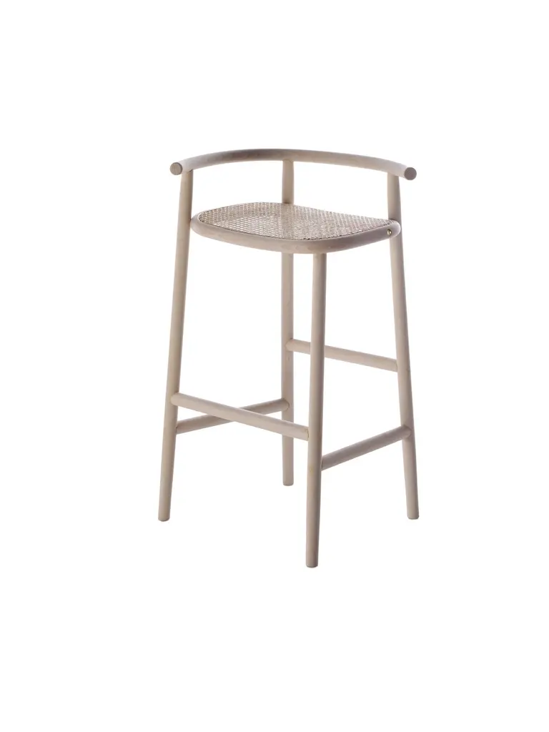 The refined elegance of the Japanese minimalism by Nendo abstracts from the brands’ stylistic features, in order to reinterpret them in a contemporary light. A rigorous and poetic approach which distills the essence of the design research, where the steam-bent wood expresses only one structural detail, which draws the attention on each element of the Single Curve Collection: low table, dining table and stool in three or four legs version. The barstool, included in the Single Curve Collection, differs from the other Nendo’s proposal for a woven cane larger seat and for a four-leg support. The beech structure proposes the steam-bent element in the backrest which continues horizontally.Additional Info:Materials: Beech , glass upholstery.Dimensions: H 34.2 x W 21.2 x D 16.5 inchSeat height: 29.1 inch Armrest height: 34.2 inchWIENER GTV DESIGN is a trademark which distinguishes the historical and contemporary collection of Gebrüder Thonet Vienna GmbH (GTV)
