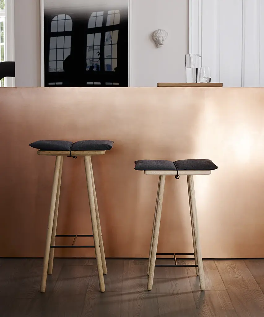 Japanese and nordic sensibilities meet in the minimalist Georg series. The design is characterized by the slender wooden poles and soft surface, where a woolen cushion is kept in place by a braided leather strap. The legs are stabilized by metal H-frame that also serves as a footrest. Available in two heights. Designed by Chris Liljenberg Halstrøm and manufactured by Skagerak, a family-owned design company from Denmark established in 1976.