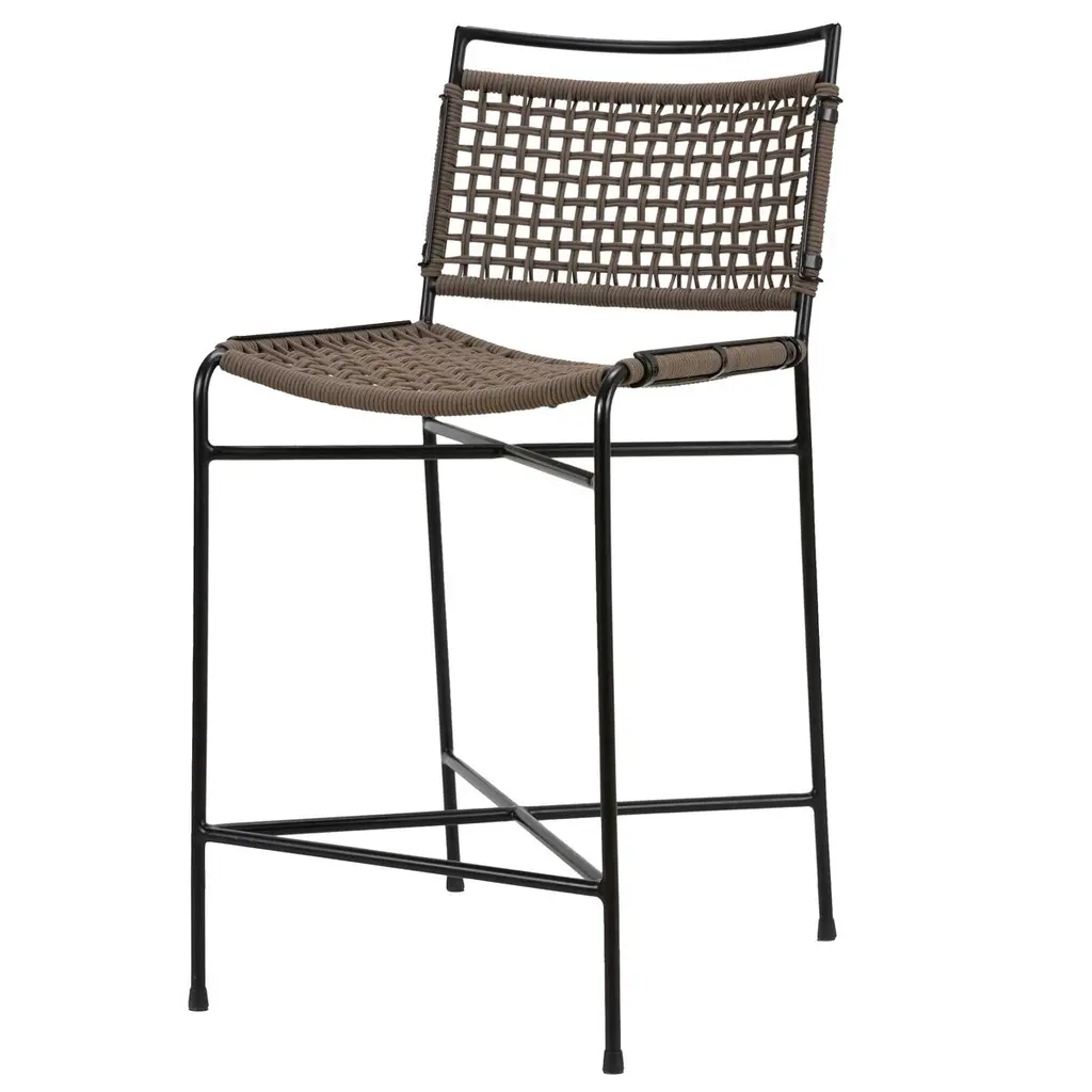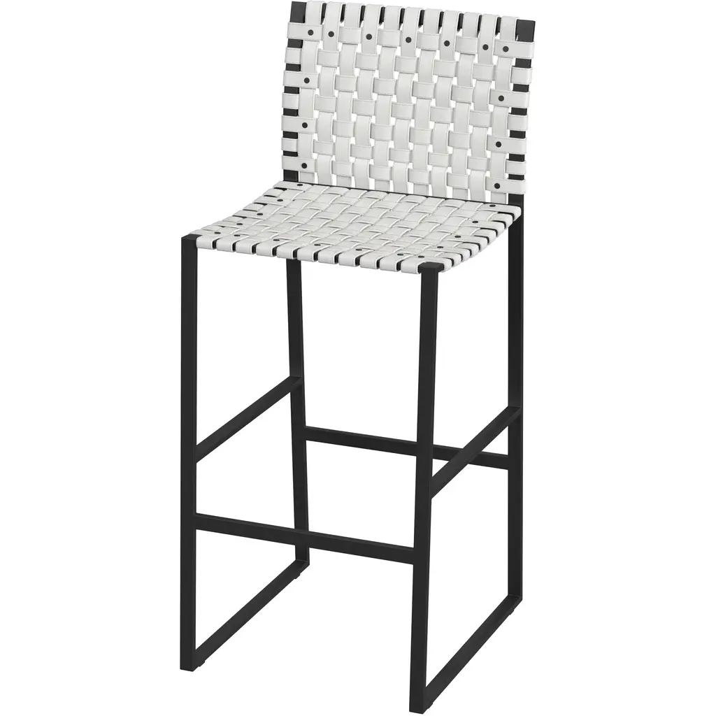 Stool characterised by its essential and minimal structure, Inout 828 develops around a light structure in white, grey or sage painted tubular aluminium, an ecological material, unique for its technical qualities. To this is added a particular weave in grey, black or blue elastic strap, an innovative product based on synthetic rubber and propylene.Barstool, stackable matt white, grey or sage lacquered aluminium tubular frame, woven with blue, black or grey elastic belts. Version with seat H 65 cm is also available, same price (INOUT 829).Additional Information:Material: Aluminium, elasticFrame finish: Grey lacqueredBelts finish: Woven with grey elastic beltsDimension: 44 W x 53 D x 101 H cmSeat height: 75 cmAvailable in other belts finish options: Woven with blue, black elastic beltsAvailable in other frame finish options: Sage, matt white