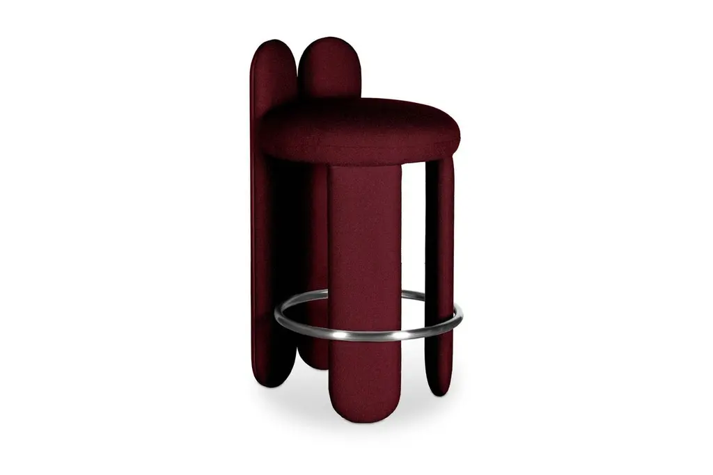 Glazy bar stool by Royal StrangerDimensions: W 55cm, H 105cm, D 60cm, seat height 84cm.Materials: Solid wood frame, foam, upholstery, stainless steel.Color: Lago Bordeaux.Available in brass, stainless steel or copper. Also available in other Royal Stranger’s fabrics and in COM.Step into a world of eye candy furniture with Glazy Stool. There is a groovy feeling to the rounded lines defining its round seat, backrest, and legs.An irresistible furniture piece where velvety upholstery playfully meets a glazed back finishing.Royal Stranger is an exclusive furniture brand determined to bring you the best unique pieces of art and design.Fusing design, art and the best craftsmanship, they strive to deliver the best state of the handmade art furniture. The design team works every day to create meaningful products that represent values such as passion, function, aesthetics and know-how. Values that are meant to represent Royal Stranger’s DNA. This dedication is present at all stages of production and the combination of craftsmanship and innovative design contributes toour final purpose: to produce certified high-quality products, made with passion and expertise and using royal materials such as gold leaf, rich woods and high quality lacquers.It was in 2013, as an architects, that Sofia Santos & Rui Santos started to push the boundaries of innovation in several retail design concepts for some of the best stores in Portugal. This will has always been present in their work, and that’s how the brand was born.