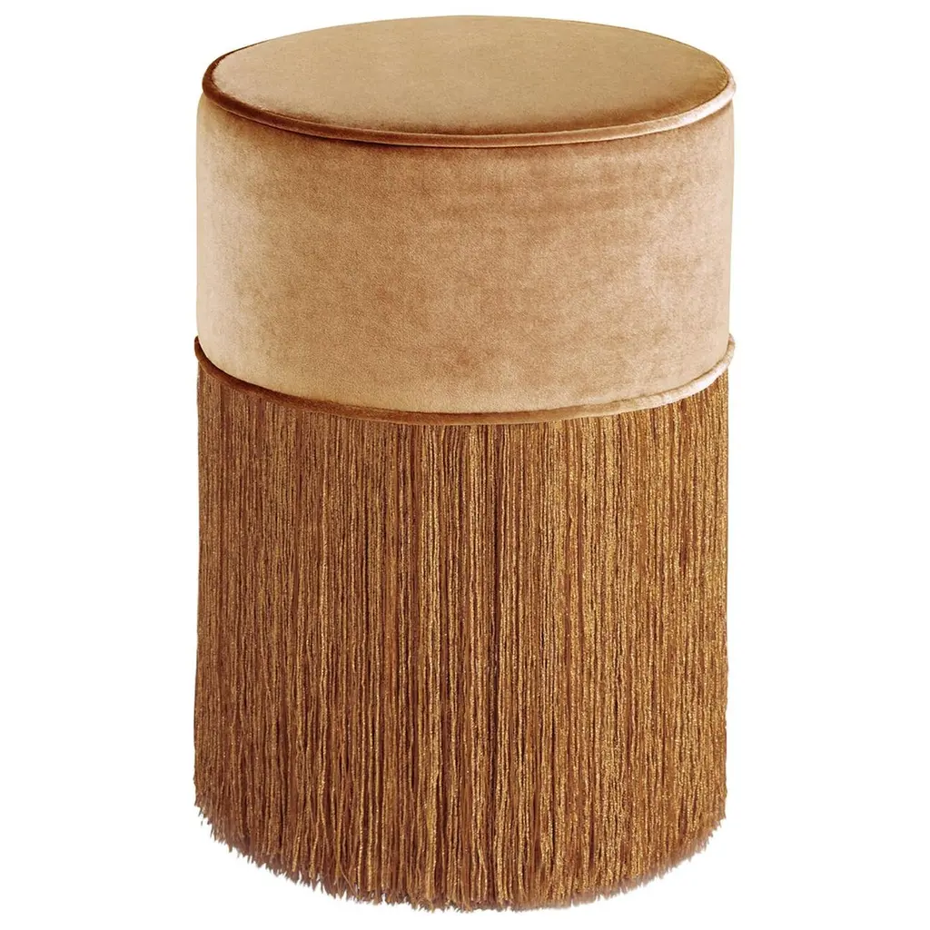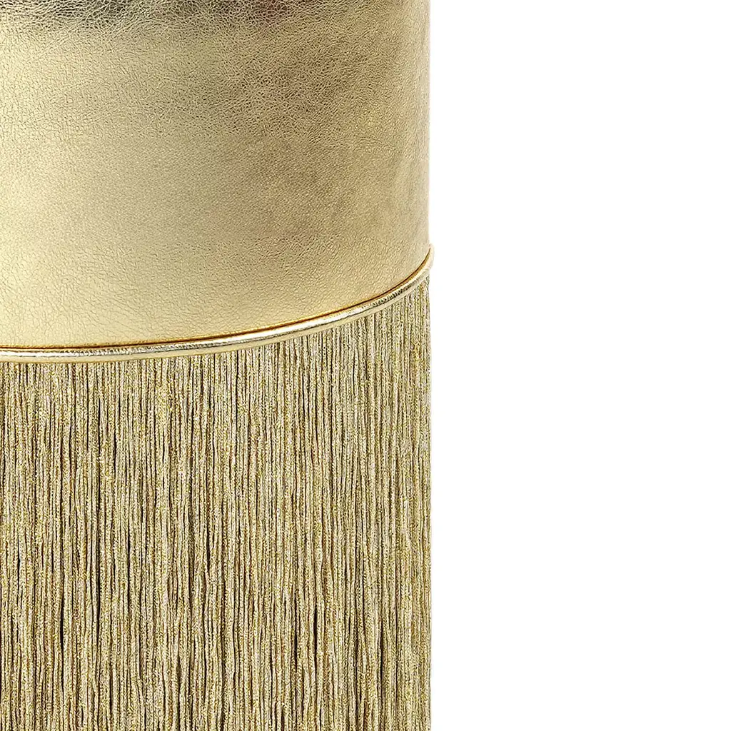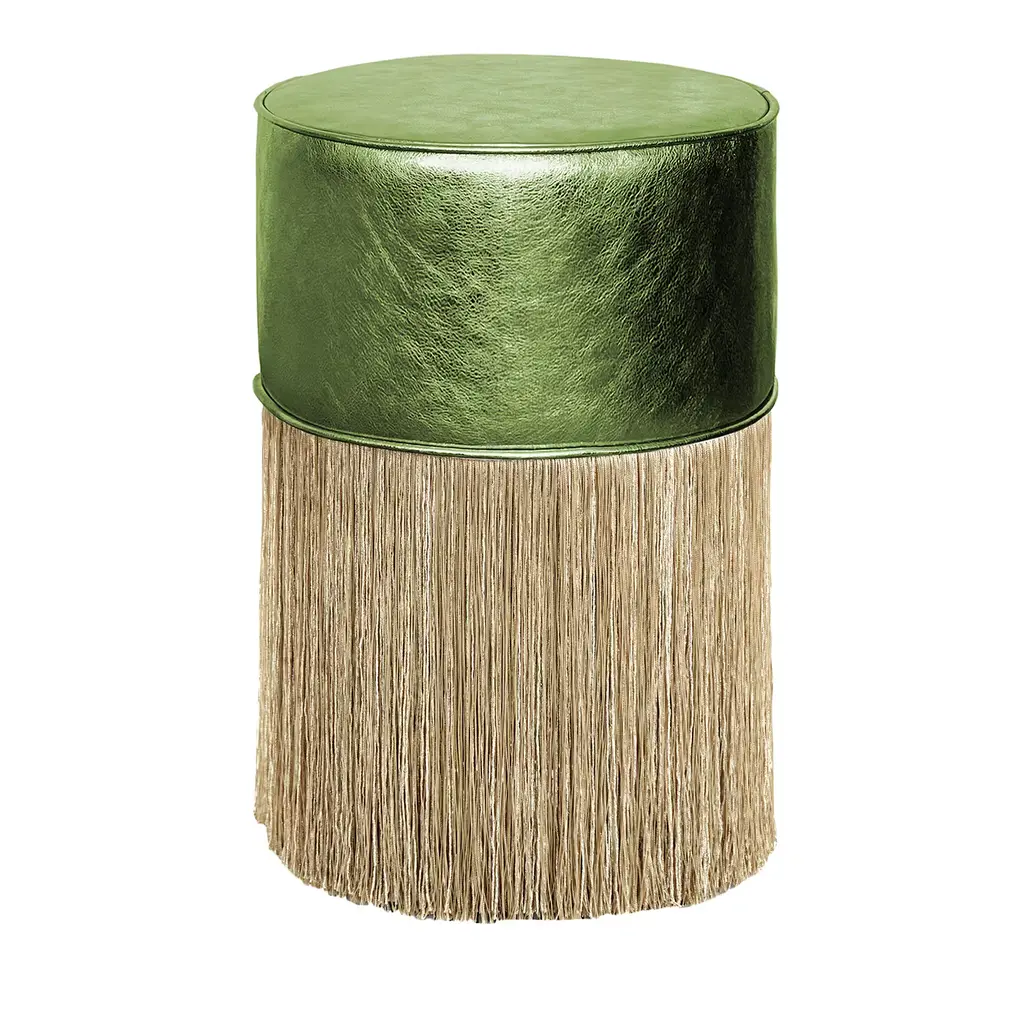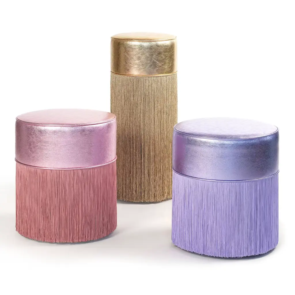 The bar stools from Glistening collection cast a radiant glow, elevating any ambience and unleashing a combined feeling of novelty and extravagance. The iconic fringes are proposed in gold. Upon request any of the characteristic fringe designs can be selected to complement the beaming seating. The Gleaming collection it’s a fusion of futuristic luxury and timeless creating a balance between classic elegance and avant-garde aesthetics. Each bespoke piece is stamped on the bottom of the pouf’s lining and personally signed, numbered, and dated by designer.
