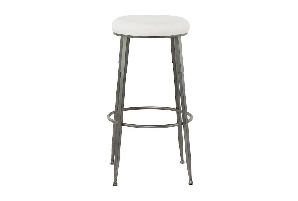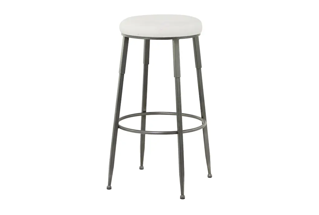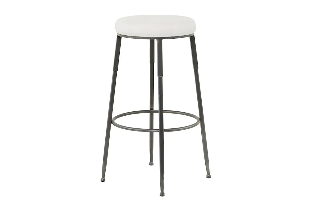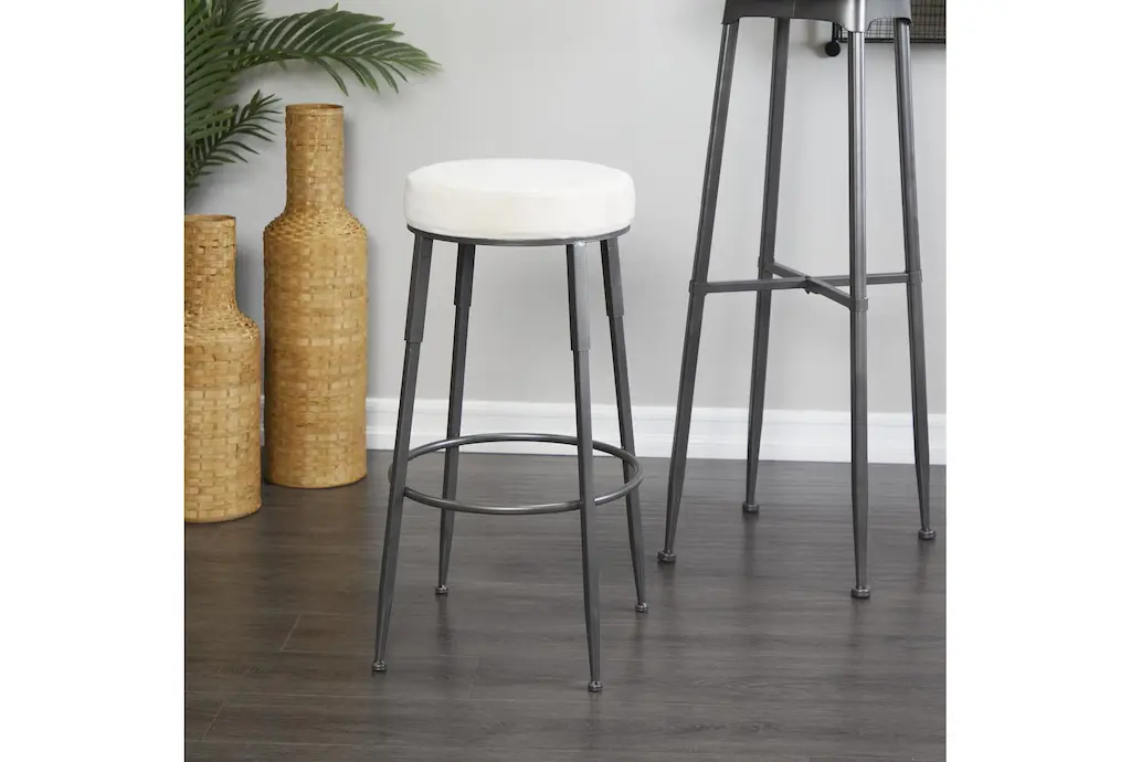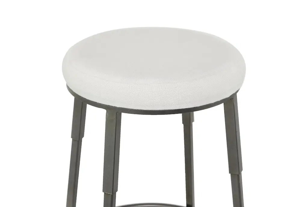 Make memories and laughter in the kitchen as you sit pretty in this stylish bar stool. Find comfort in our counter stool featuring eye catching design and durable structure. Decorate your industrial kitchen bars with this tall round metal stool for a clean modern vibe. Designed with felt or rubber stoppers at the base that prevent scratching furniture and table tops, as well as sliding around. This item ships in 1 carton. A cotton fabric seat cushion that measures approximately 3". Suitable for indoor use only. Maximum weight limit is 250 lbs. This is a single gray colored kitchen stool. Industrial style.
