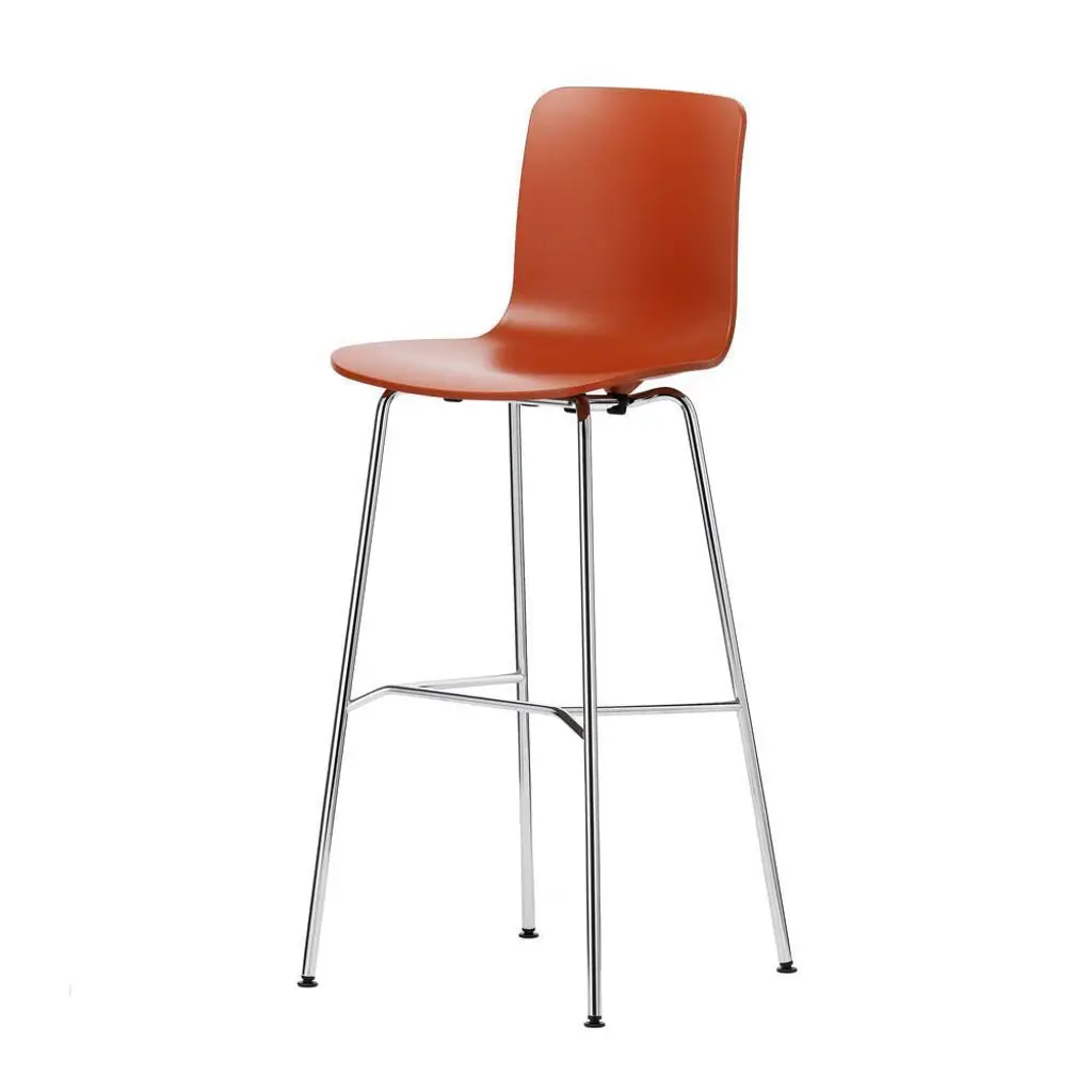 HAL Ply Stool High- Seat shell: plywood.- Base: chrome-plated tubular steel with anti-skid footrest, non-stacking.HAL is Jasper Morrison's interpretation of a shell chair in the tradition of the Plastic Chair by Charles and Ray Eames, whose variety of different bases enables versatile use – from dining tables to meeting rooms, from bars to auditoriums. HAL is now also available in the version HAL RE with seat shells made of recycled plastic – as side chairs or armchairs.The chair bases exist in metal or wood, on castors as studio models or in high versions for bar stools and as a beam solution for waiting zones.These different base options can be combined either with a seat shell in plastic (HAL and HAL RE) or plywood (HAL Ply), or with a lightly padded shell covered in fabric (HAL Soft).The recycling material for HAL RE stems from Germany's 'Yellow Bag' (Gelber Sack) collection of household waste, which primarily consists of used packaging. Utilising this recycled material instead of conventional plastic generates fewer climate-damaging emissions and also significantly reduces energy consumption.Due to the composition of the recycled material, the different colours are interspersed with tiny specks of pigment. The colour white cannot be implemented in the new material at the moment and will follow as soon as technically feasible. The HAL RE seat shell can also be 100% recycled at the end of the product's life.When destined for use in large numbers in auditoriums, multipurpose rooms, training areas etc., HAL RE can be ordered with stackable bases, optional row connectors and seat numbering elements, as well as with a stacking trolley.The comfort of the pleasantly flexible plastic or wooden shells can be further enhanced through the addition of seat cushions or seat upholstery – or by opting for HAL Soft with its full upholstery.In the versions with a plastic shell and powder-coated base, HAL is also suitable for use in outdoor settings.The related HAL Armchair rounds out the HAL family.