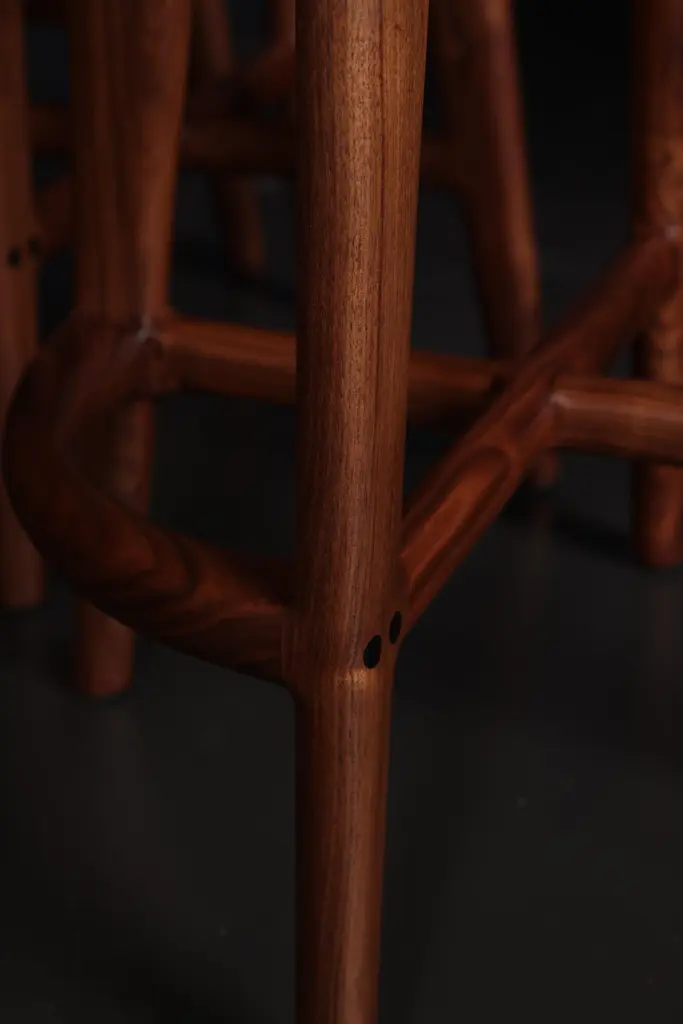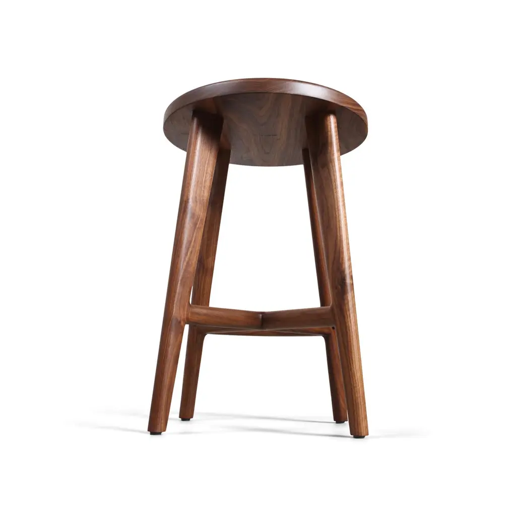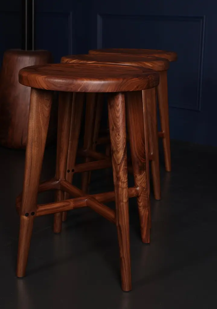 A Classic design that will beautifully suit any home interior. Crafted from solid American black walnut, wood is hand-selected for color uniformity and quality. Our bar stools feature generously sized seats, sculpted for comfort.Joinery is accented with Gabon ebony dowel plugs and a seamlessly integrated footrest completes the design. This piece is built to order - bespoke options always available. Wood species include white oak, blackened or invisible ash, black walnut and more. Sizing can be modified to suit (counter height, bar height, or other). Also available with backrest. Additional photos available on request. Tariff-free to the USA under USMCA.