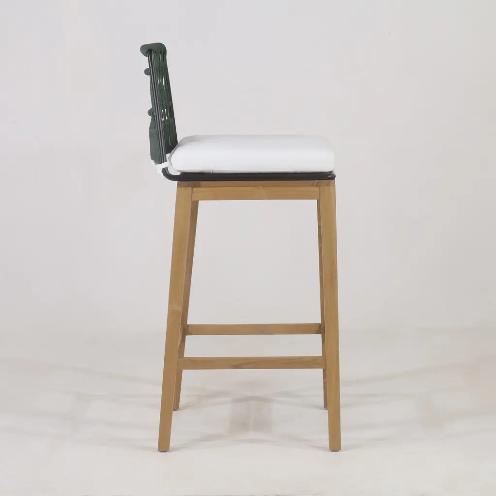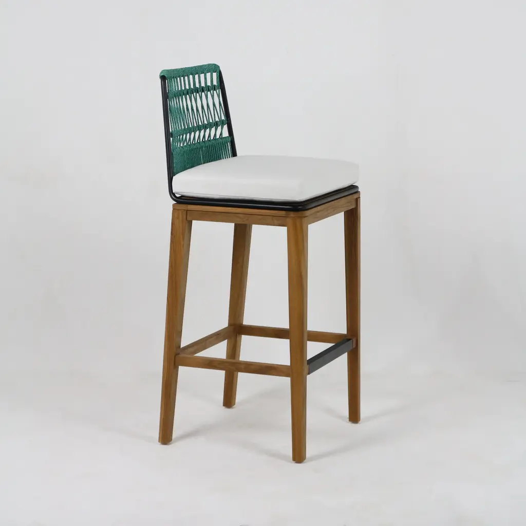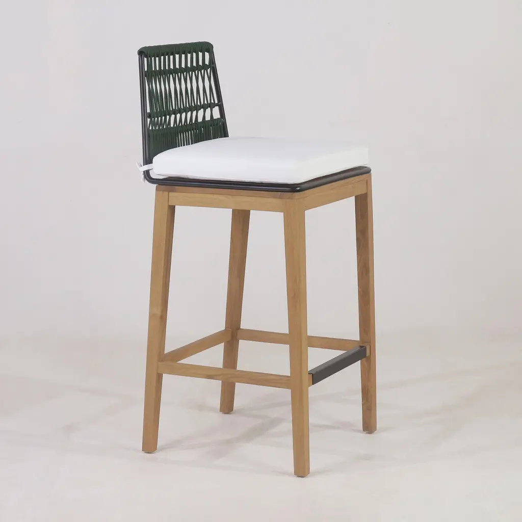 This Outdoor Iron and Teak Frame Bar Stool communicates elegance and simplicity. The sturdy iron frame is offset by a curved tailored backrest and woven rope offering generous supporting comfort in all sitting positions. The refined details of this barstool will not go unnoticed. Commercial Grade