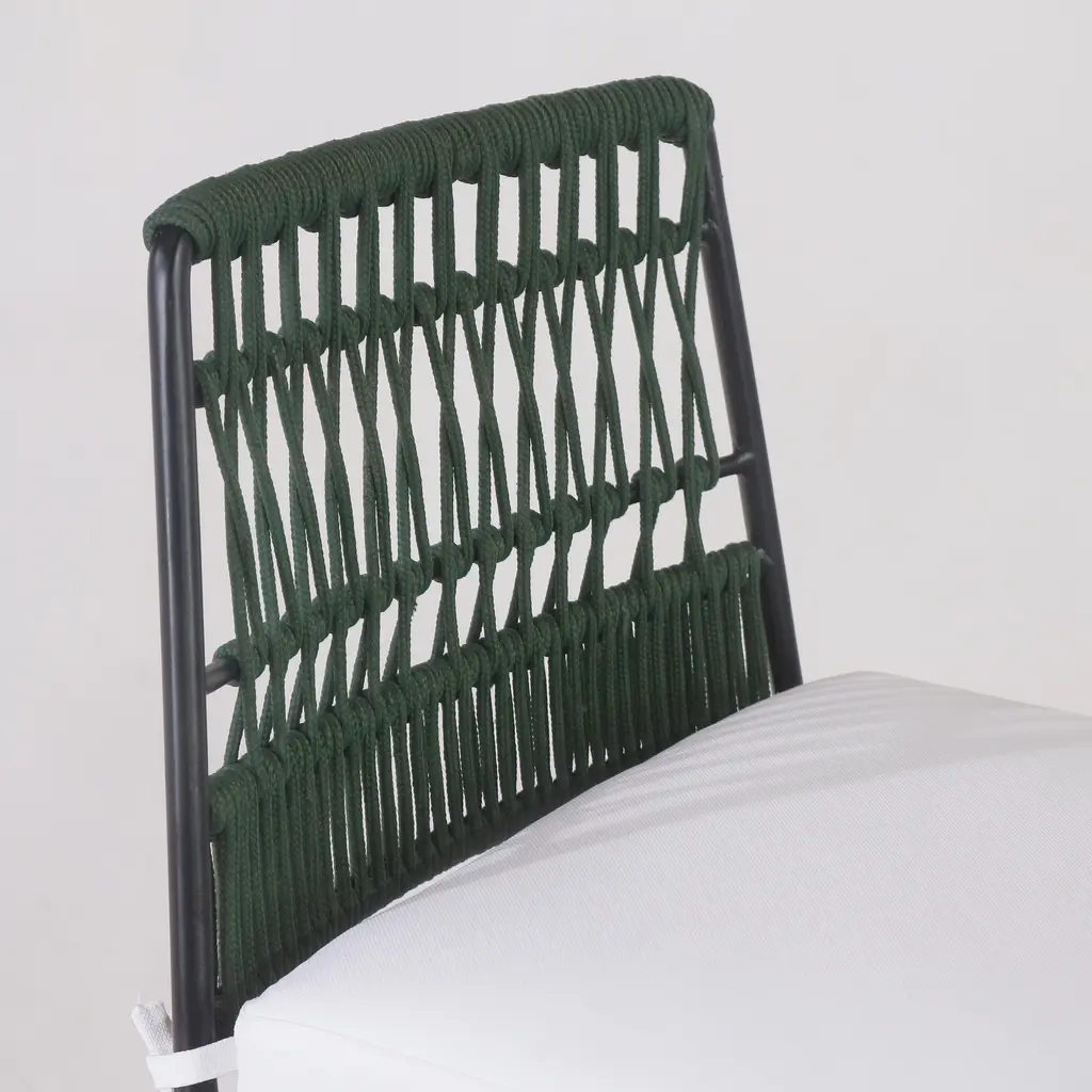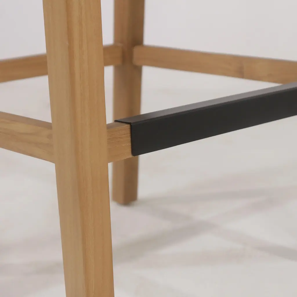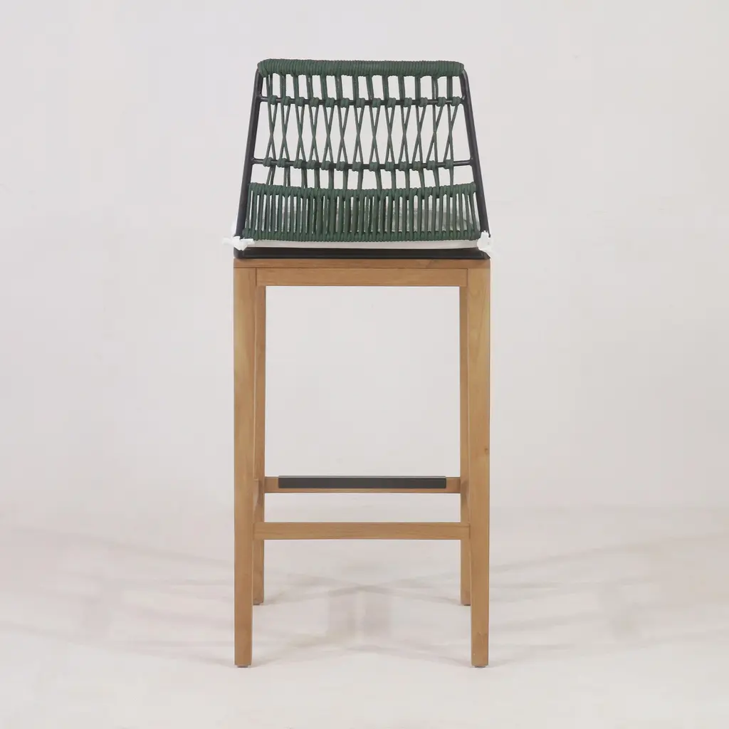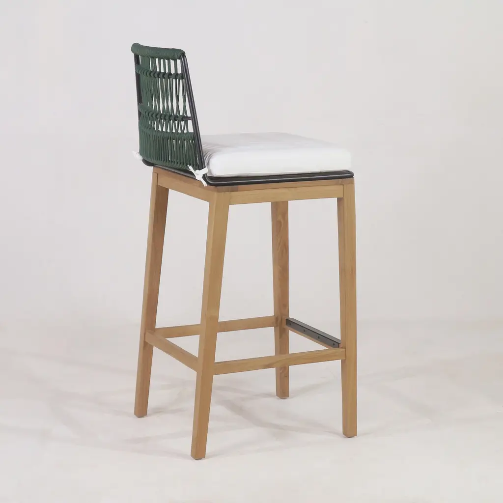 This Outdoor Iron and Teak Frame Bar Stool communicates elegance and simplicity. The sturdy iron frame is offset by a curved tailored backrest and woven rope offering generous supporting comfort in all sitting positions. The refined details of this barstool will not go unnoticed. Commercial Grade