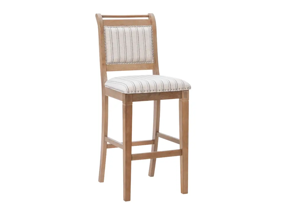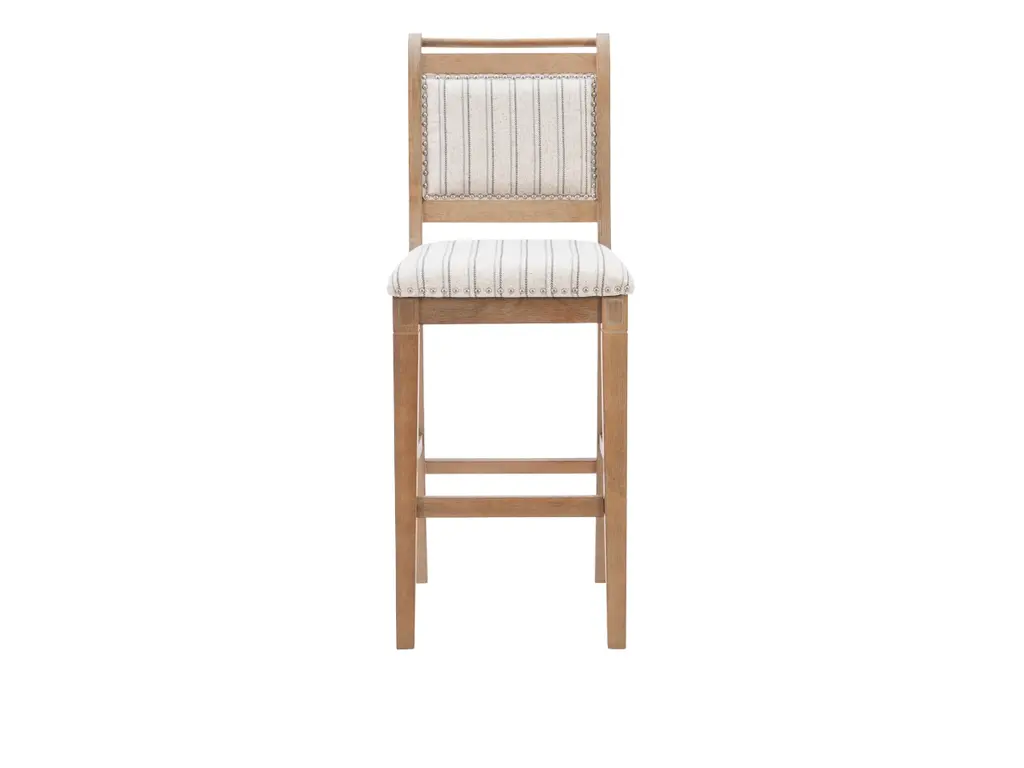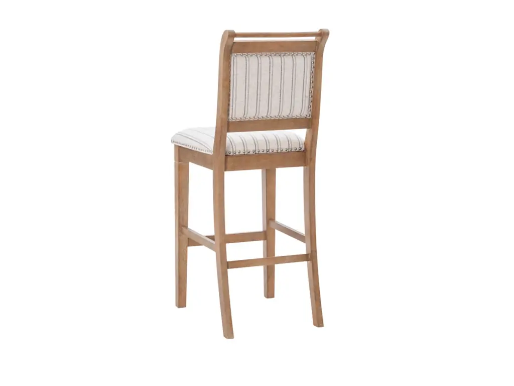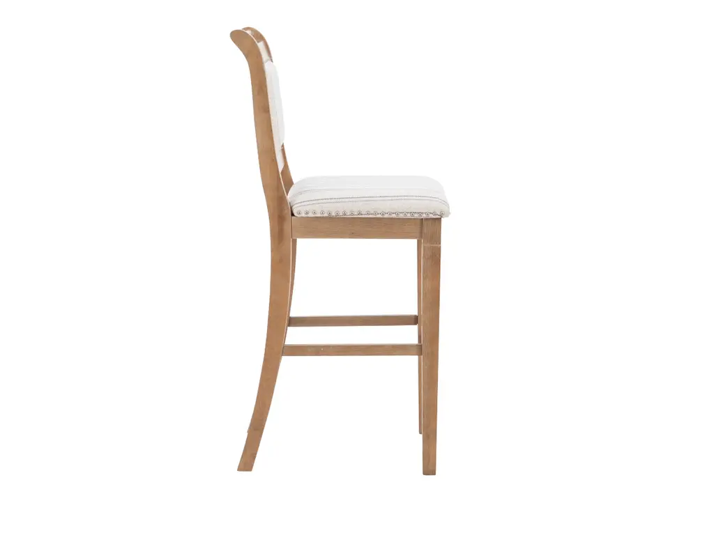 French style and farmhouse design combine to create this counter stool. The washed finished wood is perfectly accented by the solid natural fabric and brushed silver nail heads. Footrails provide stability and durability. Counter height.